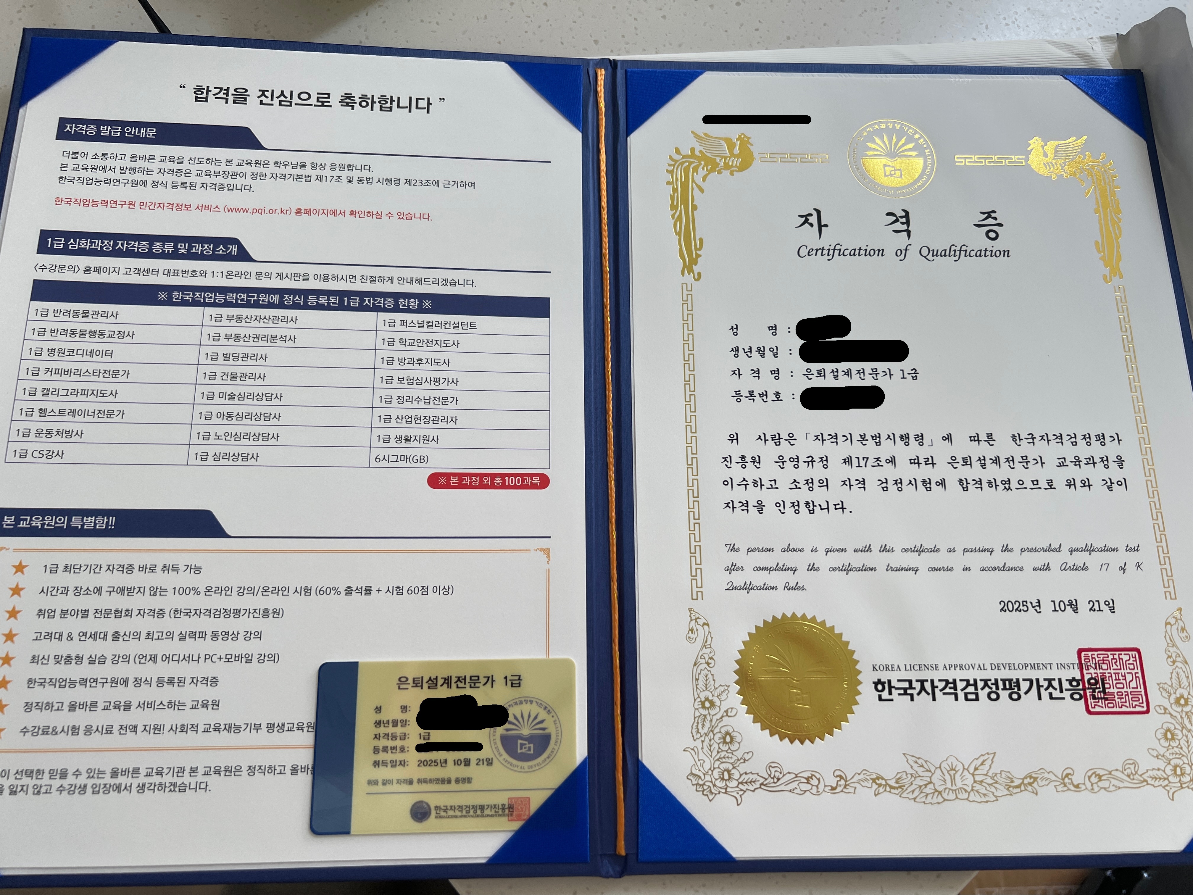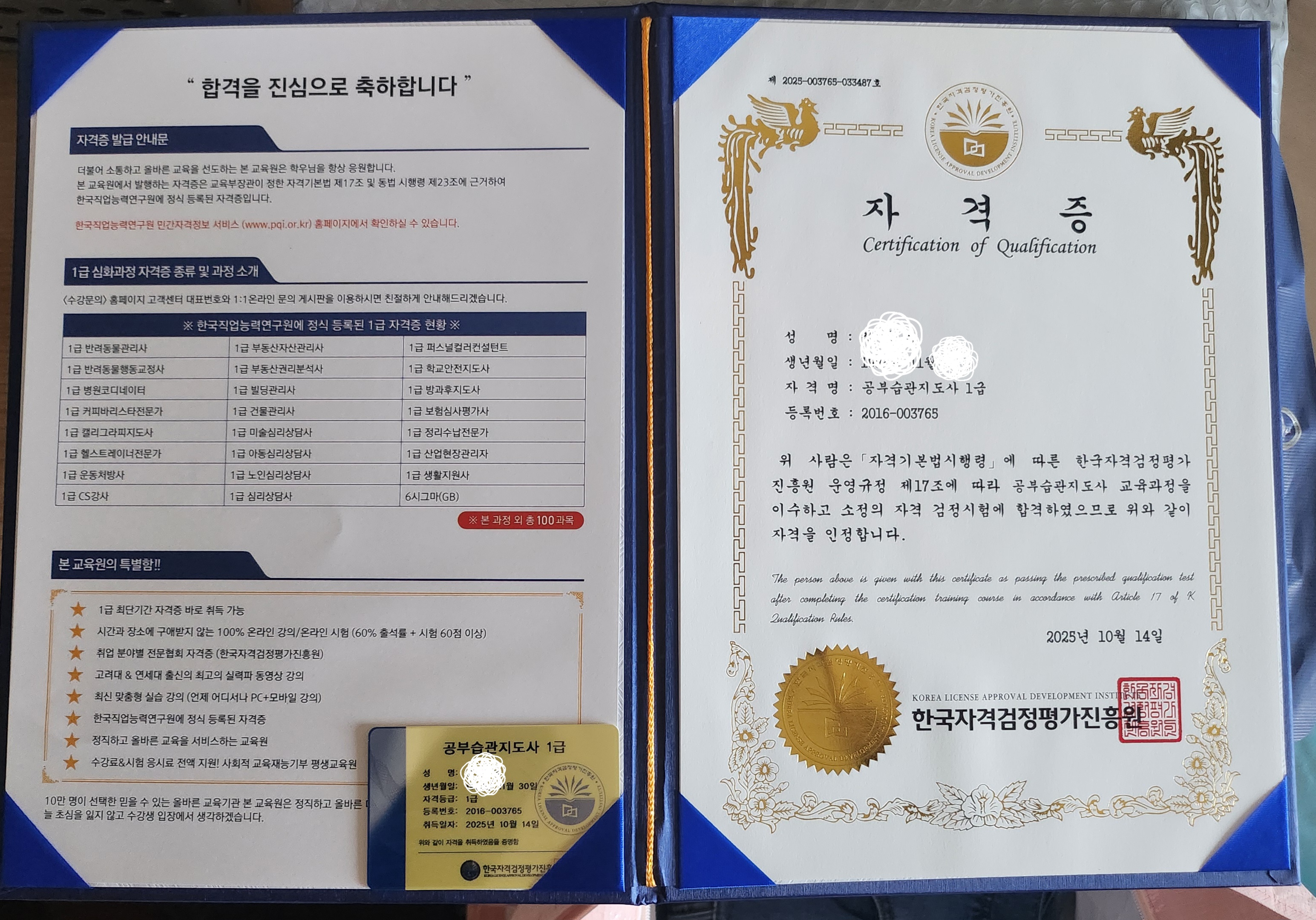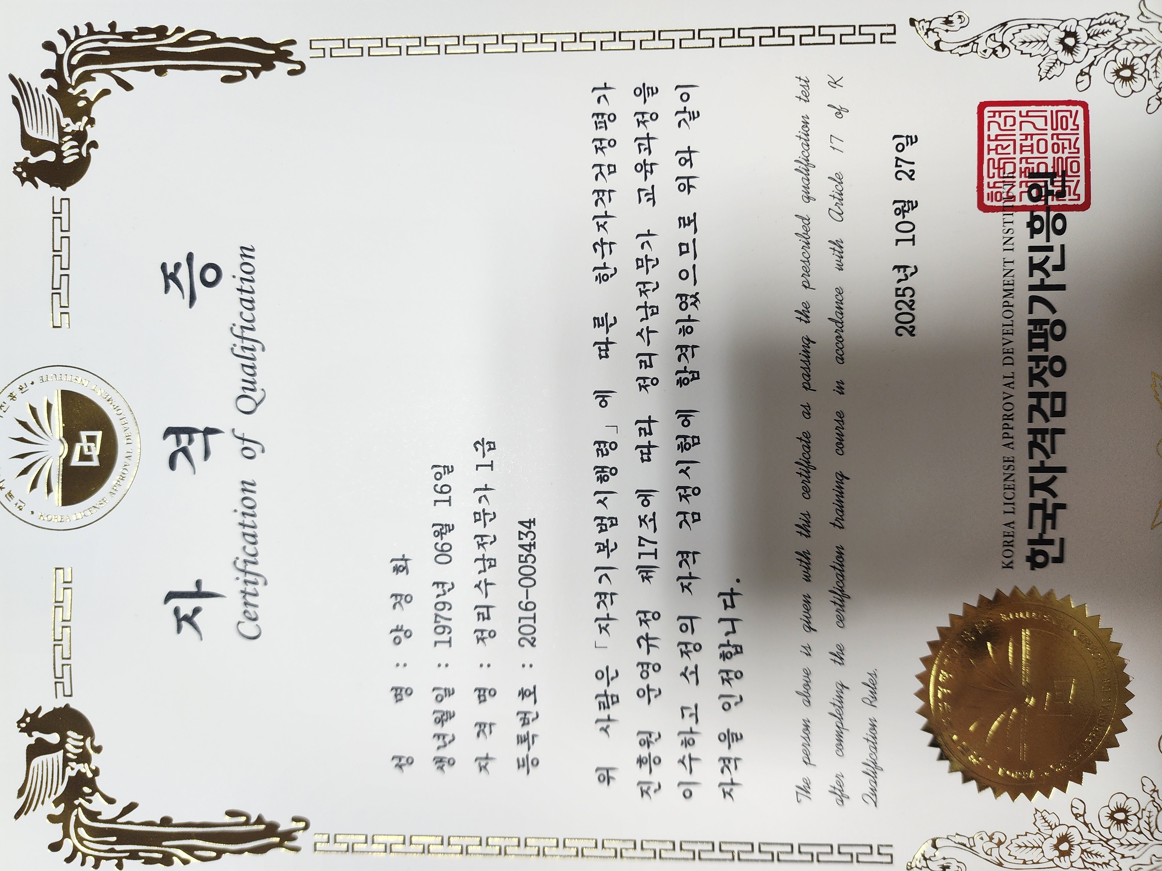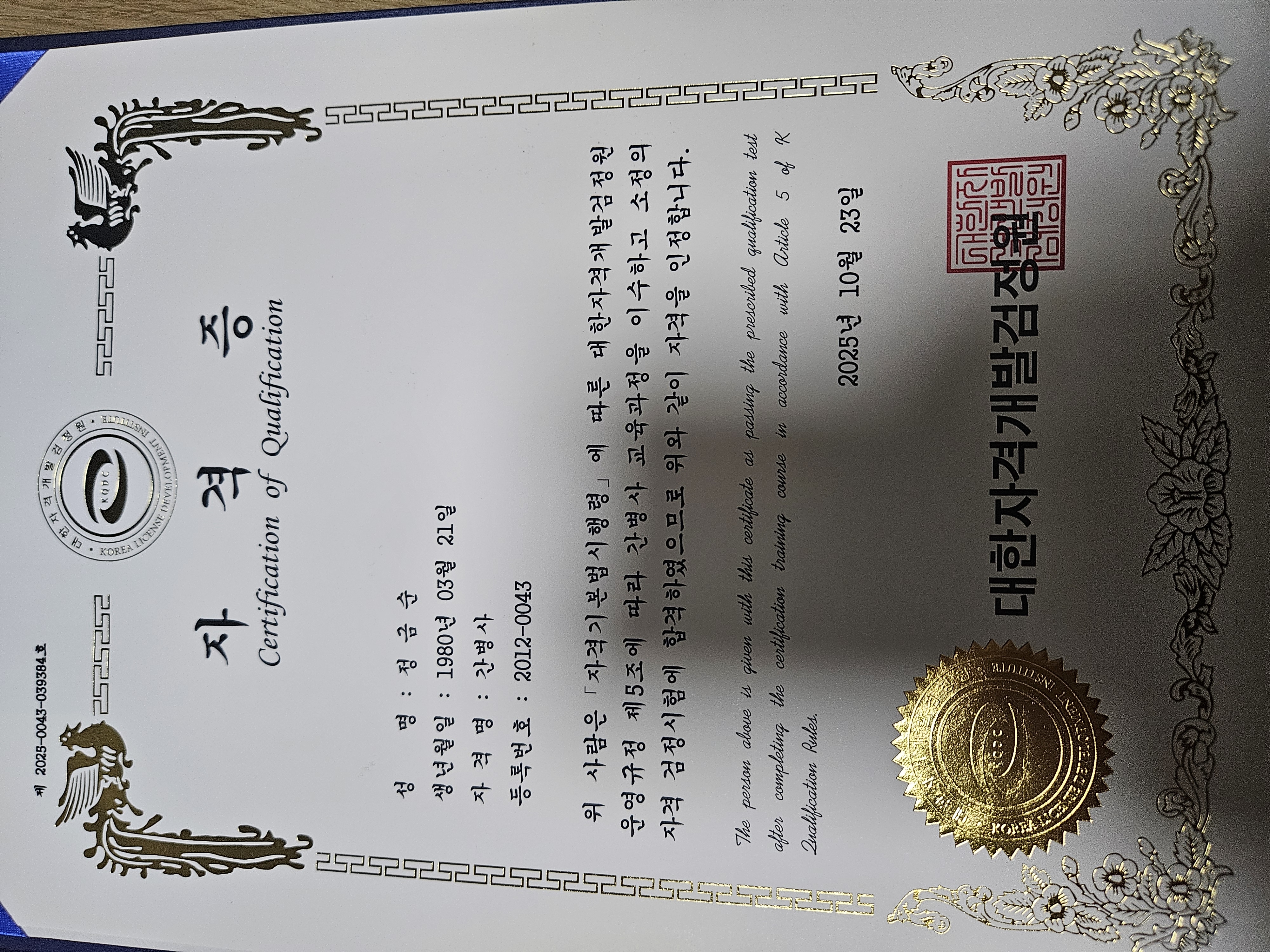 나의 발전을위해 자격증취득을 찾아보다가 우연히 들어온 한국자격증협회에서 운전면허증 다음으로 처음 자격증이라는걸 취득하였습니다. 강의도 귀에 쏙쏙 들어오고 취득과정도 간편해서 너무 좋았습니다. 뿌듯합니다^^