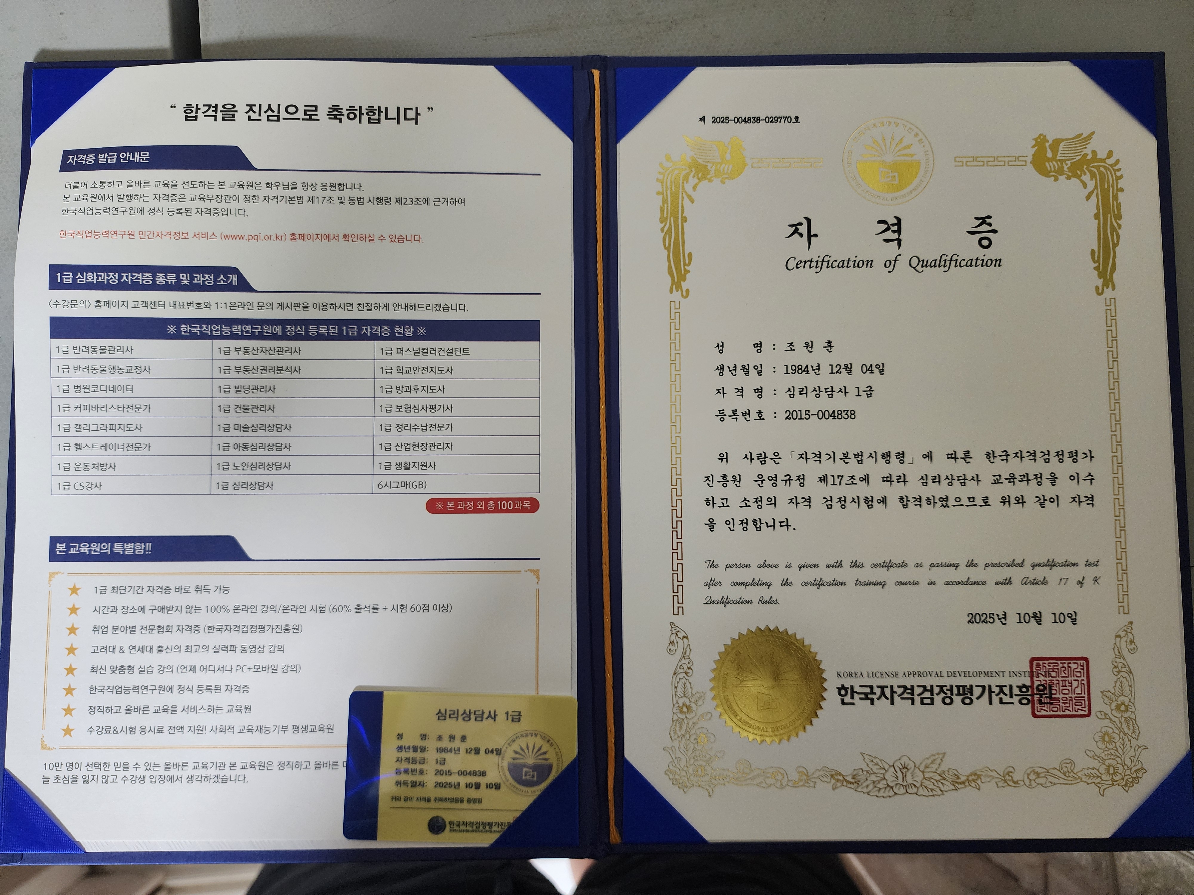 좋은강사분 심리상담사 수업 다듣고 또 노인심리상담사 강의듣고 노인심리상담사로 자격증 취득