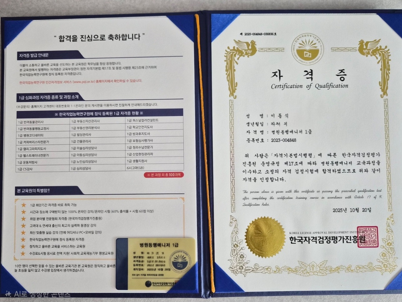 정년이 넘어 여러가지 알아보는중 한국자격증협회를 알게되어 병원동행매니저1급까지 취득하게 되었습니다 하고싶은 다른 공부도 늦었지만 해보고 싶습니다 고맙습니다