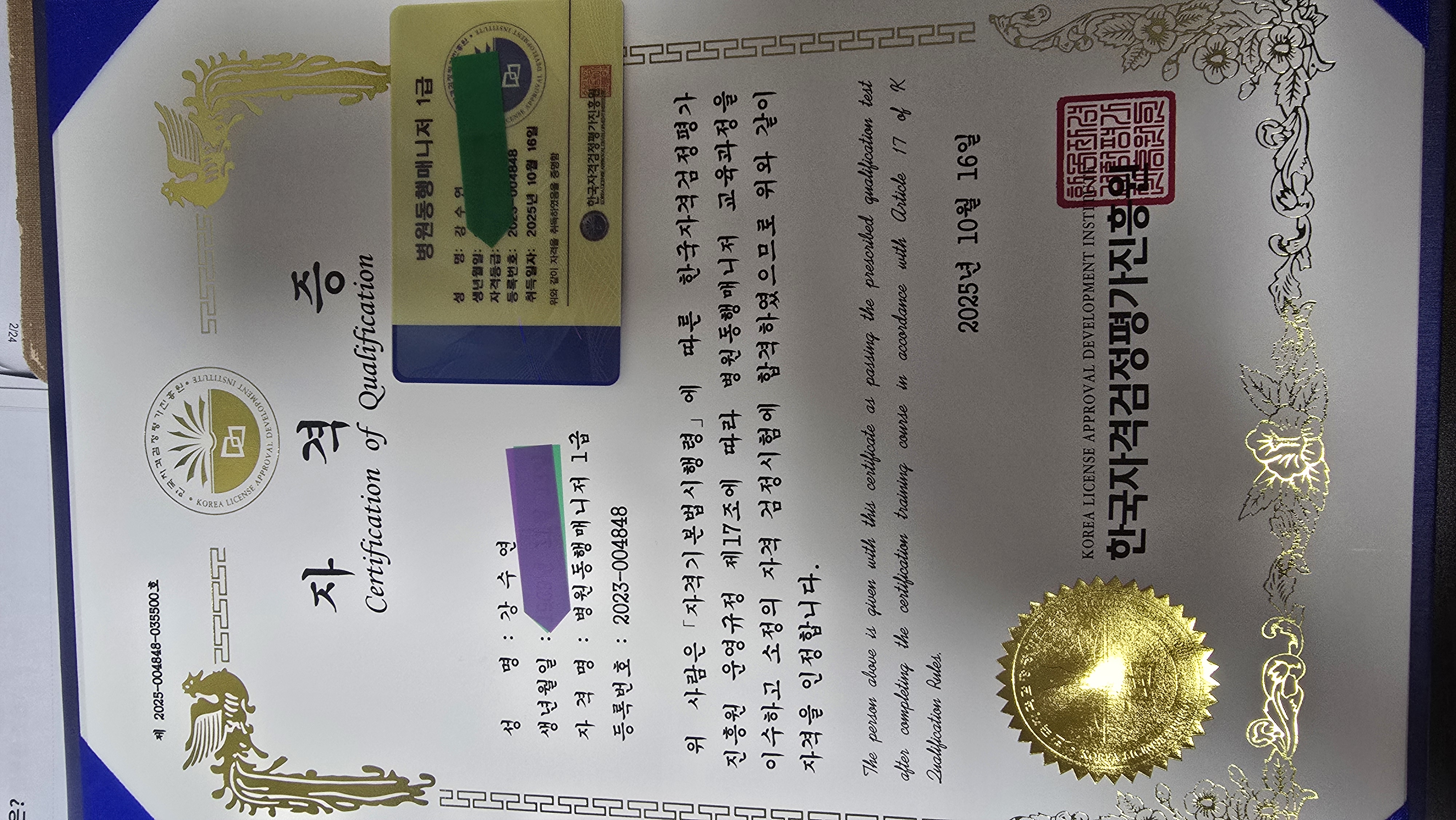 몇년전부터 하고 싶어했었던 과목인데 이번에 좋은 계기로 수강하고 자격증도 받을수 있어서 좋았습니다. 외국인들에게 도움을 줄수 있게되어서 기쁩니다.