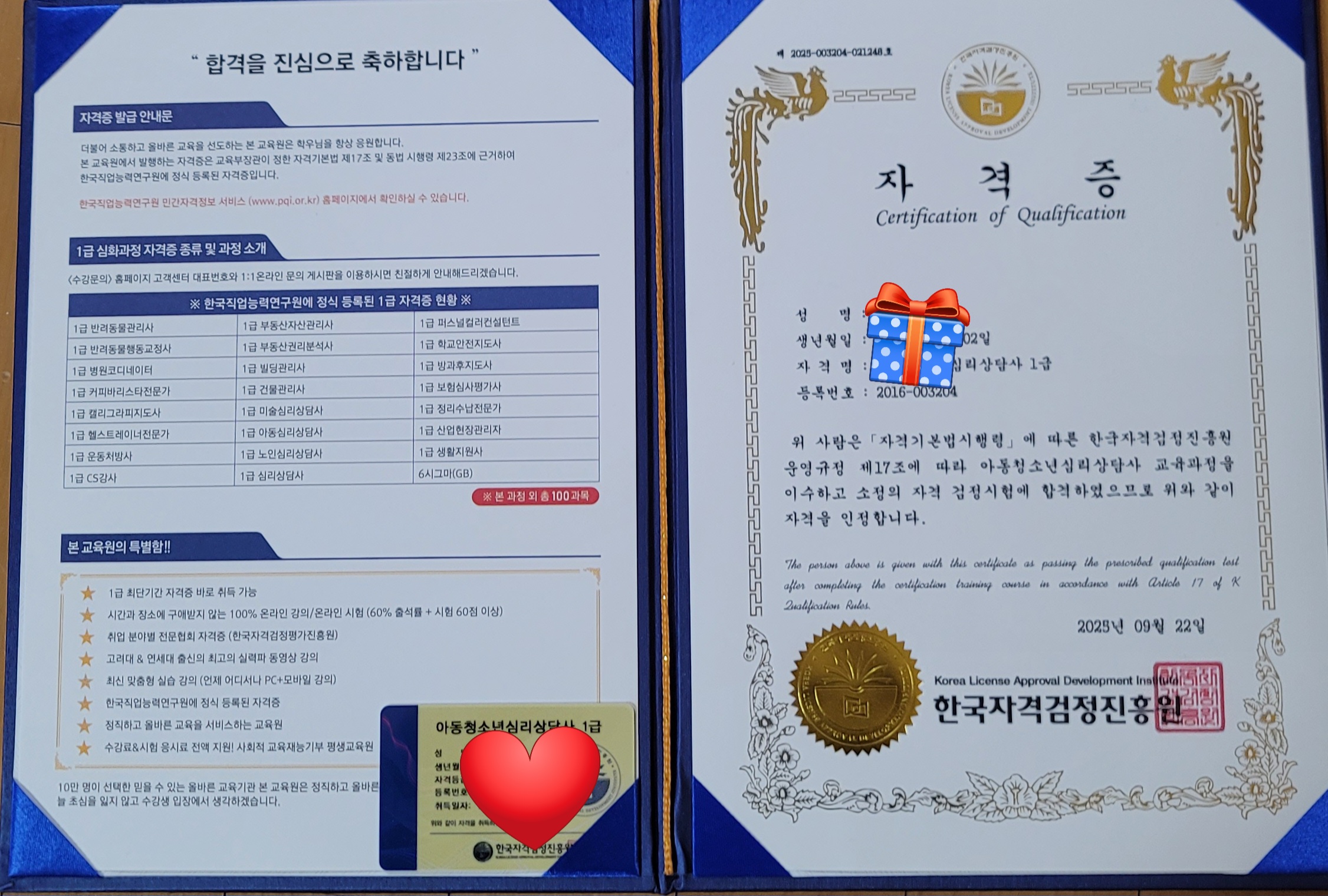 병원동행사 자격증, 노인문학 활동지도사에 이어 북아트지도자 1급 자격증 취득했어요. 채 한 달도 되지 않아 모두 취득해서 뿌듯해요. 자격증 컨텐츠 종류도 많고 퀄리티도 뛰어나서 대만족입니다. 차근차근 준비해서 따낸 자격증을 바탕으로 더 풍성한 삶을 계획하고 있습니다.