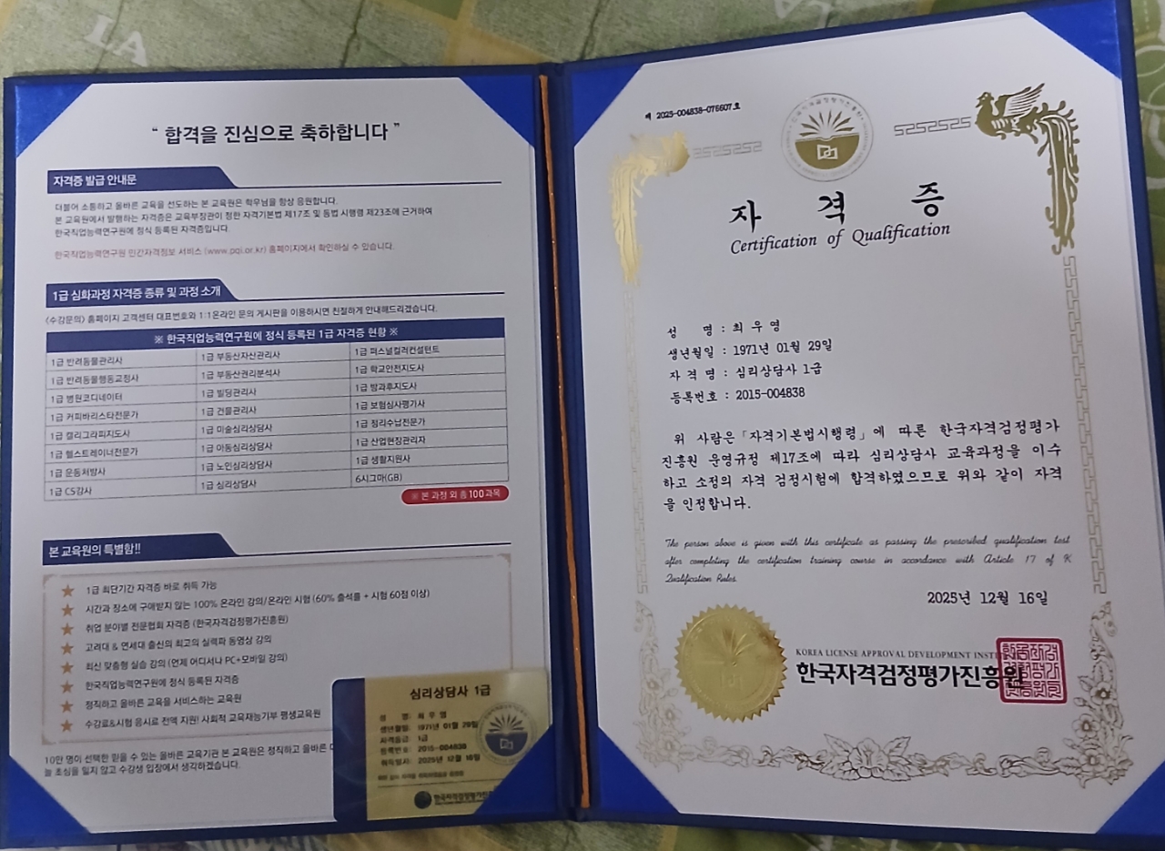 심리상담사 1급 자격증을 획득하였습니다. 앞으로 멋진 심리상담사로 활동하였으면 좋겠습니다. 좋은 자격증을 많이 따냈으면 좋겠습니다.