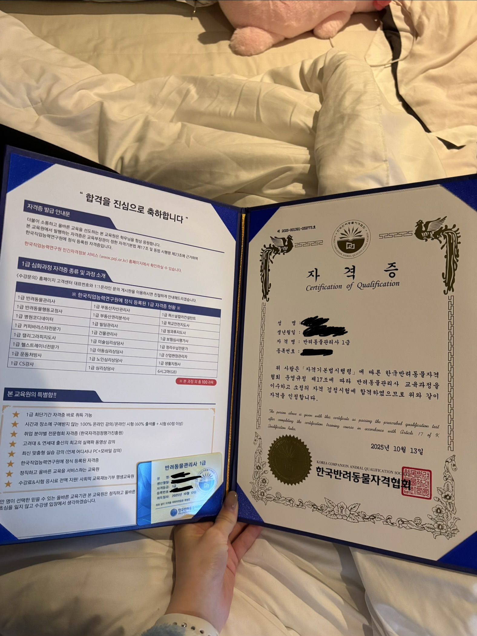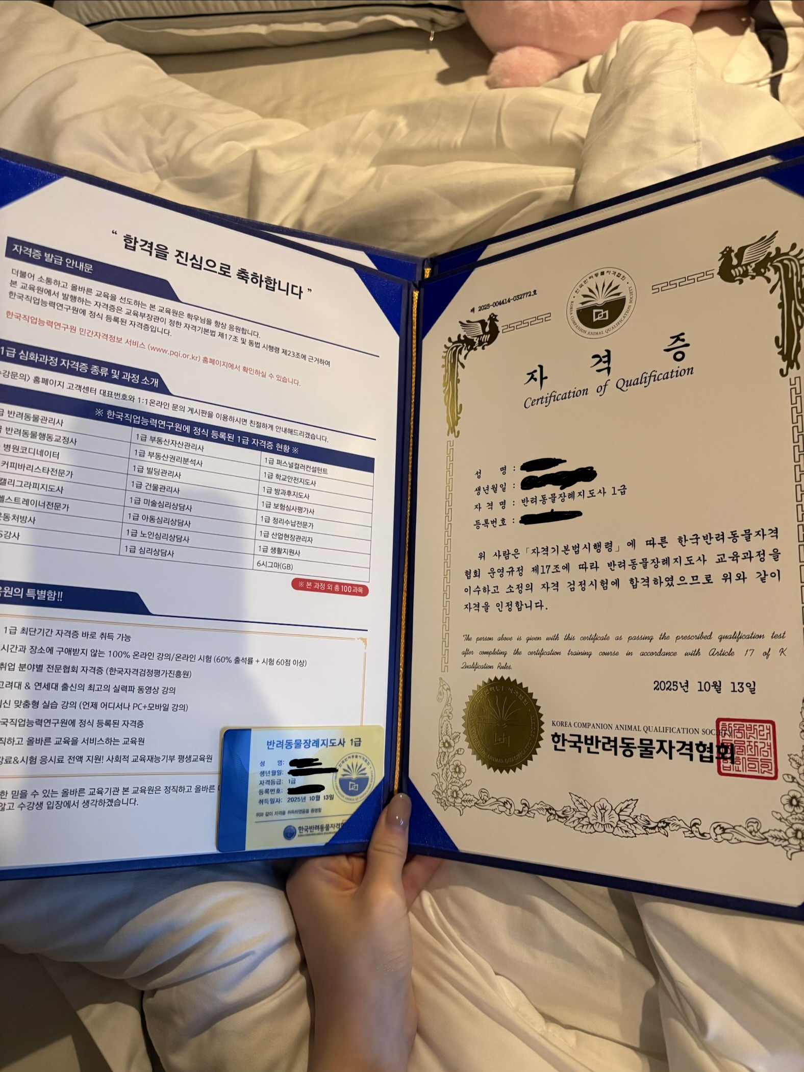 평소에 반려동물에 대해 관심이 많아 자격증을 얻고 싶었던 와중 좋은 자격증을 알게 되어서 취득했습니다!! 합격하니 기분도 좋네요 감사합니다