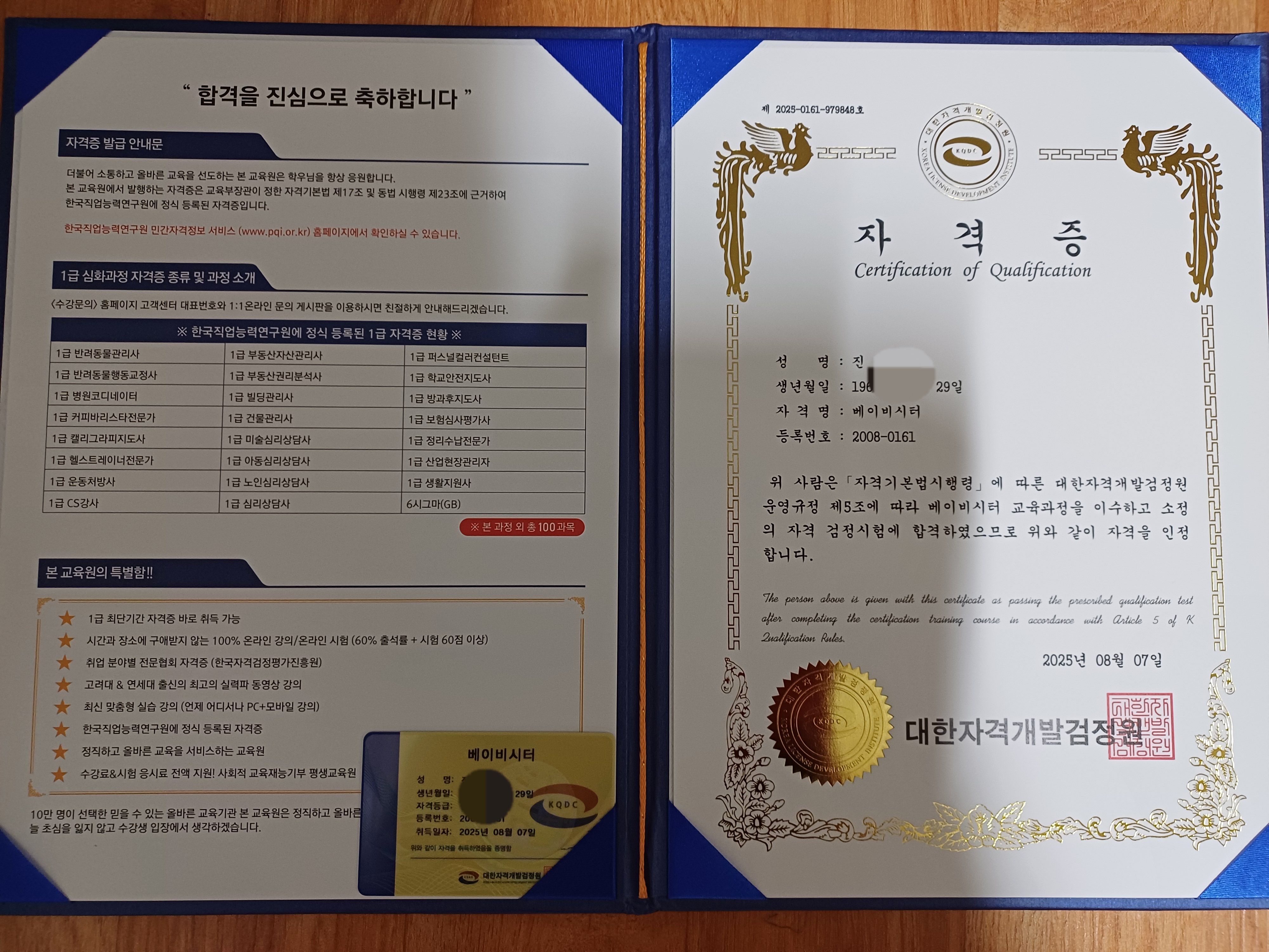 아이만 키워온 저도 큰 어려움없이 자격증을 딸수있다는거에 놀랐어요~~^^;; 더 나아가 일할수있는 범위가 넓어진것같아 넘 뿌듯하고 기분좋네요~~^^