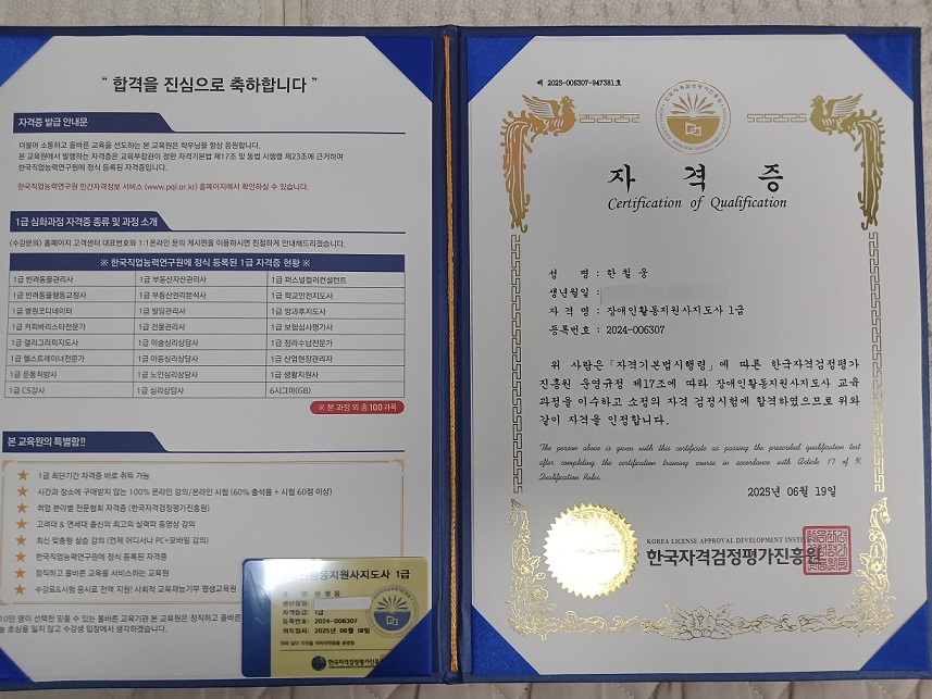 제1인생을 마감하고 제2의 인생을 어떻게 보내야 할까 고민하던터에 한국자격증협회사이트에 들어가보니 여러가지 자격증을 딸 수 있다는 걸 알고 그간 장애인활동보조에 대한 애기를 들었지만 무관심해오던터에 장애인활동지원사지도사란 자격증을 취득했습니다. 뜻하고자 하는걸 해냈습니다.