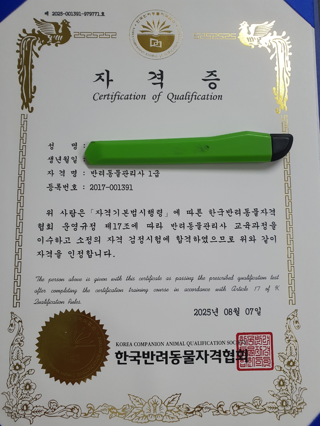 자격증 하나하나 쌓여가는 만족감이 참으로 뿌듯합니다. 반려동물을 기르면서 그냥 키우는게 아니라 공부를 하면서 키워야 함을 느끼면서 이왕이면 자격증이 있음 더욱 좋겠다 싶어서 또 하나의 자격증을 추가해 봅니다.. 알찬 과정과 함께 합격증까지 감사합니다.