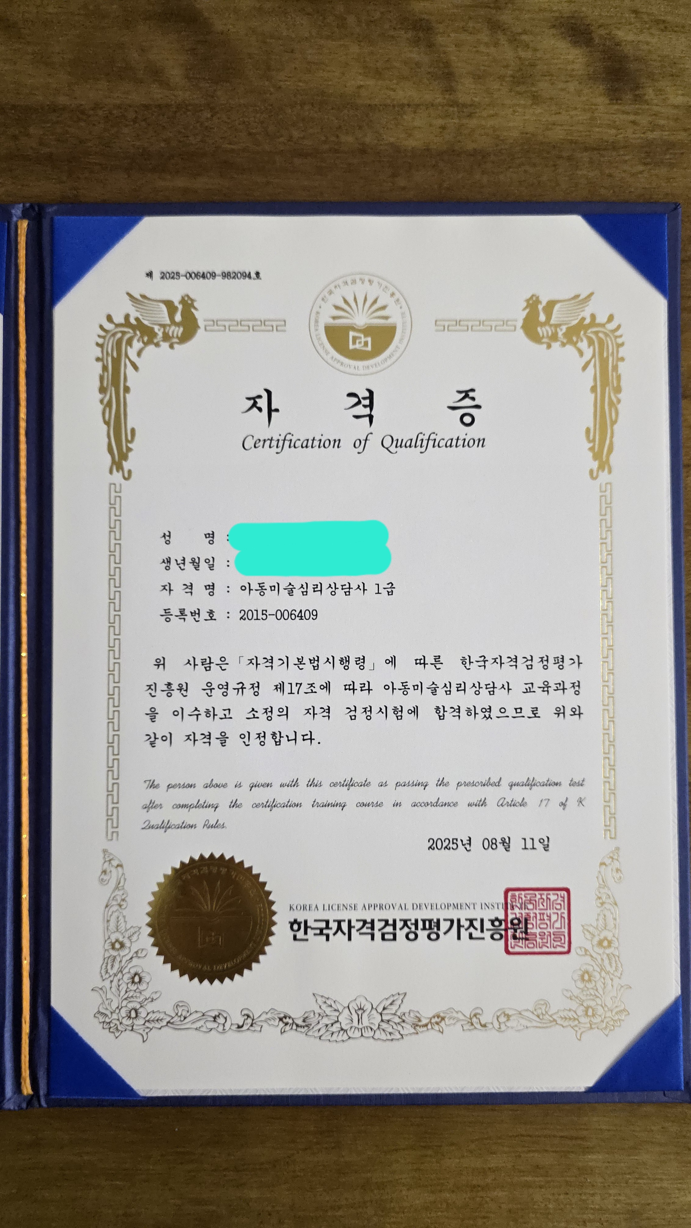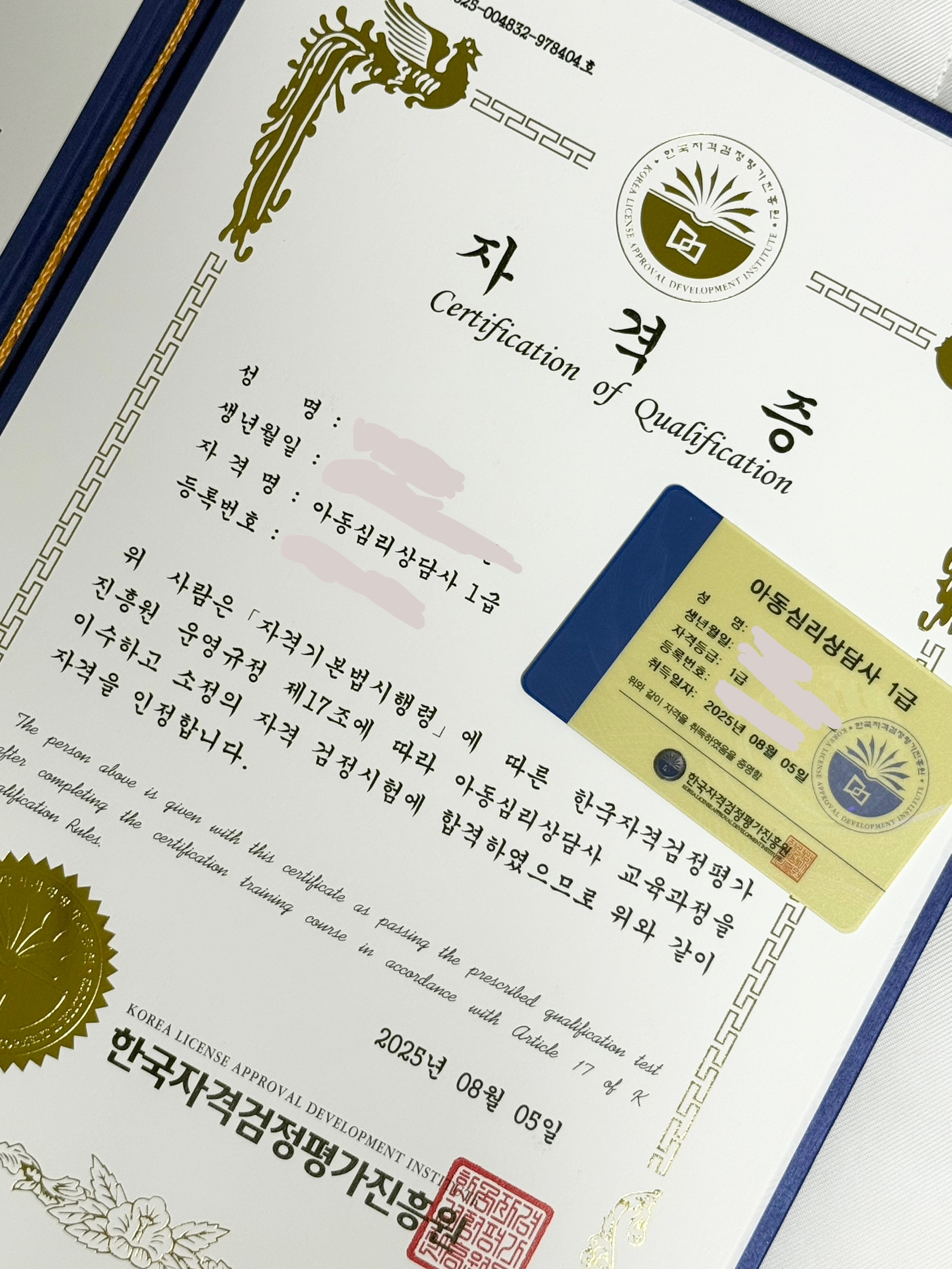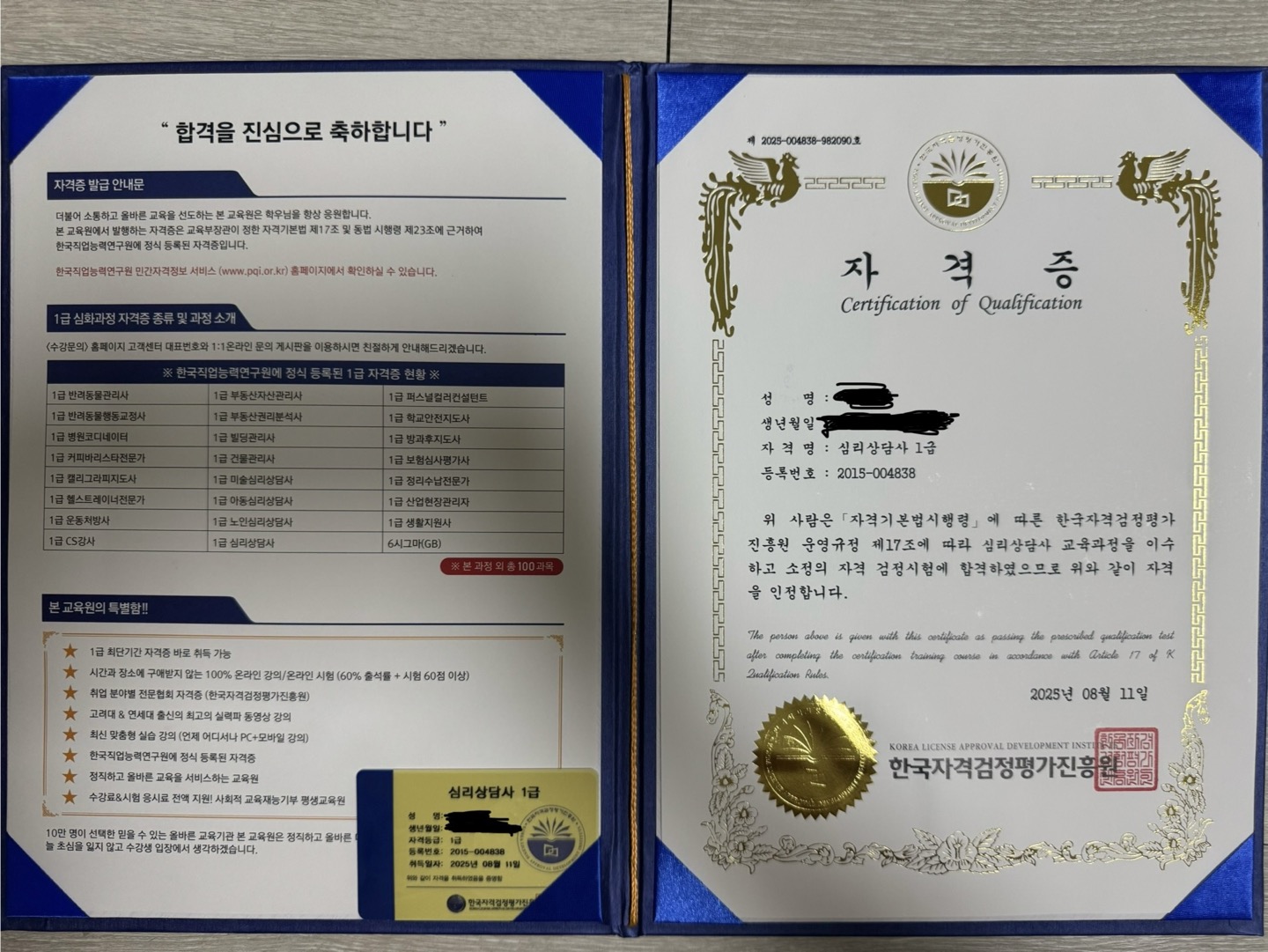 원래심리쪽으로공부했었는대.자격증까지도전할줄몰랐어요 다시확실히 강의들으면서 공부하니 더 도움이되고 더 재밌는거같아요 집도착하니 자격증까지 딱 도착 너무기분이좋네요~다른것들도 도전해보고싶어지네요