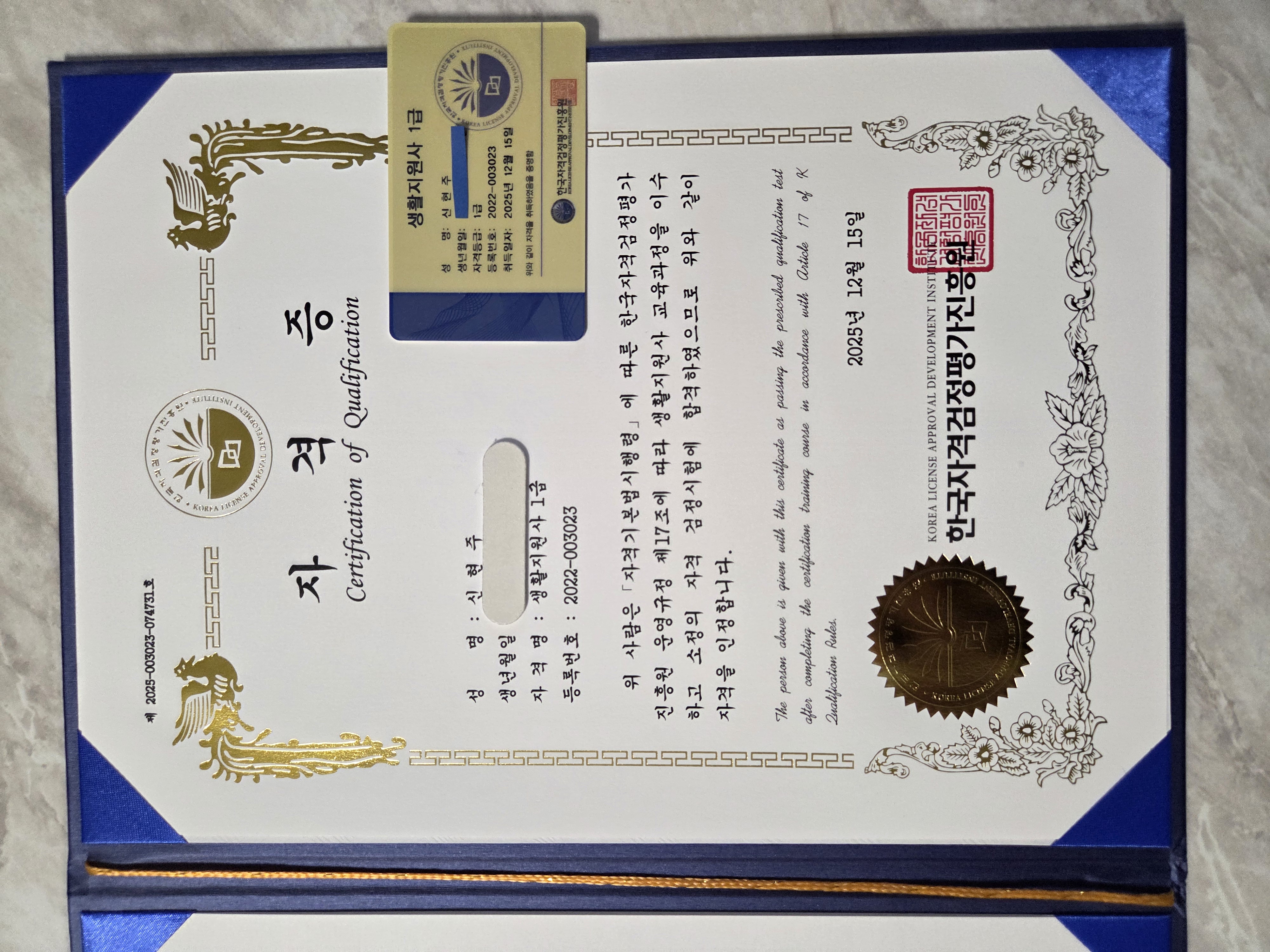생활지원사 1급 자겨증 취득했습니다 응원해주신 분들께 감사드리며, 마음으로 돕는 지원사가 되겠습니다
