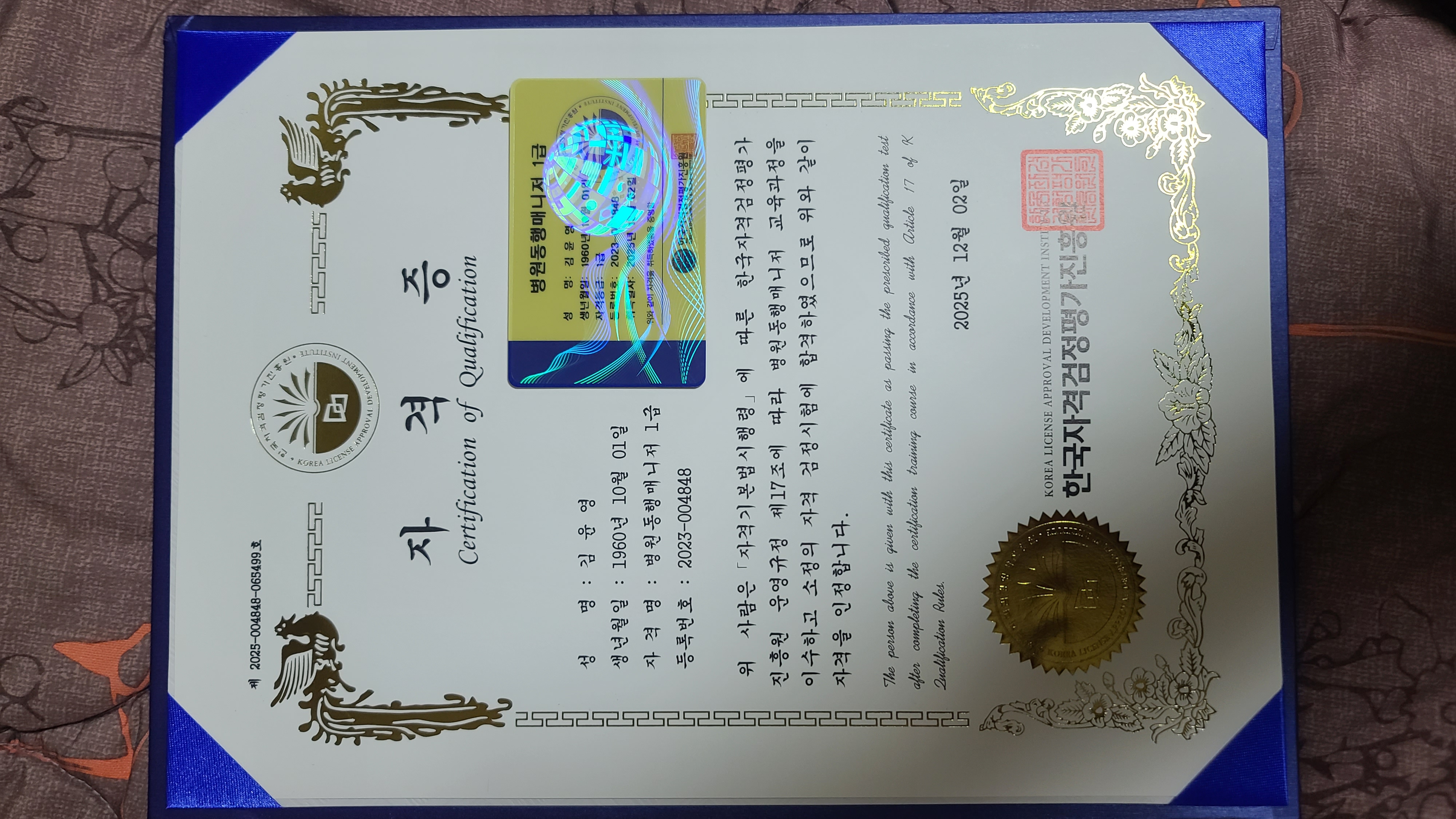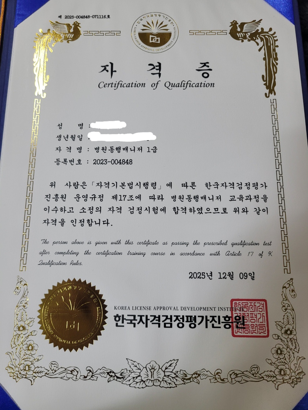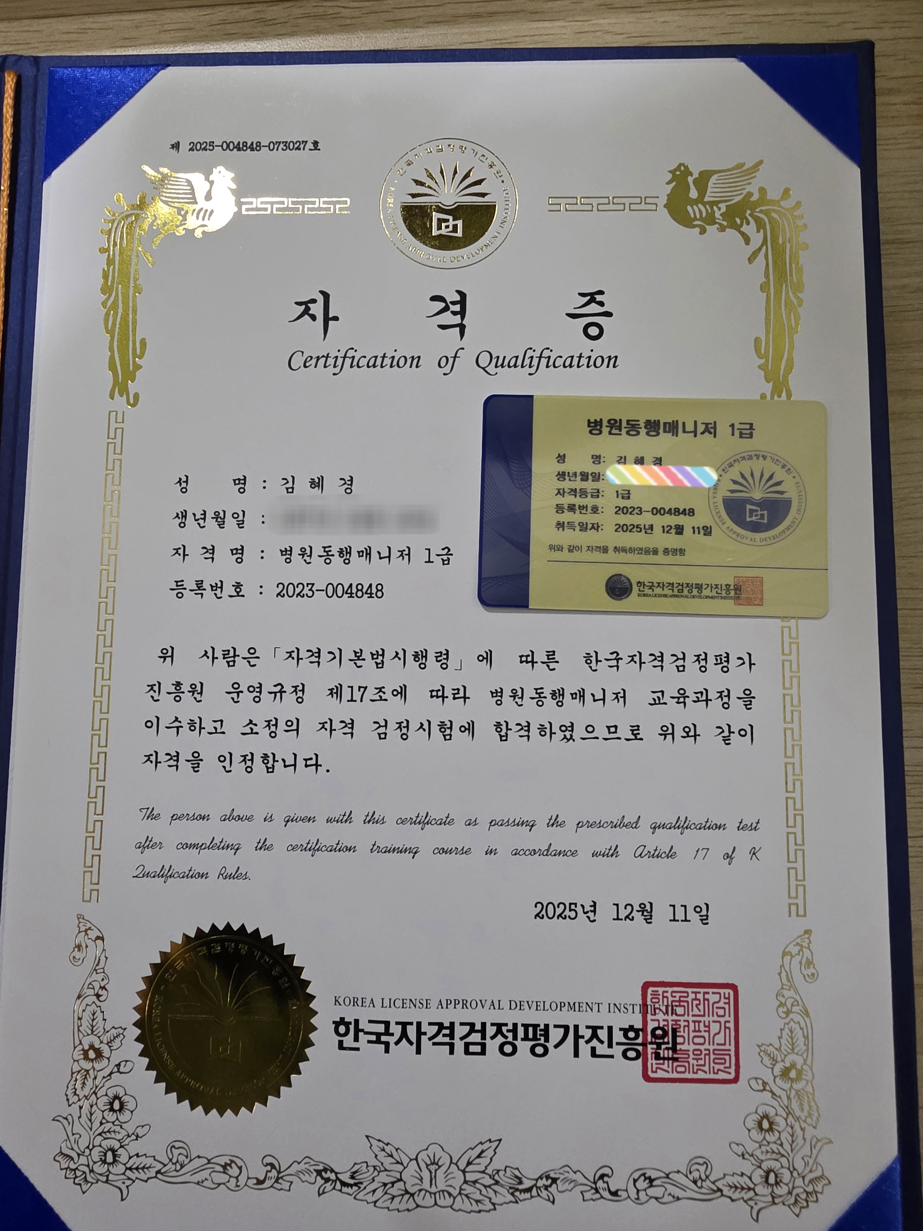 2025년 뭐라도 하나는 해야겠다는 생각에 병원동행매니저라는 자격증을 보게 되었습니다.부모님께서도 병원에 자주 가시니 혹시나 필요로 할까 도전했는데 쉽게 합격 했어요 다른 자격증도 도전해볼까 합니다~~^^