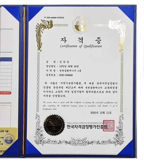 현재 가정주부로서 차후 필요한 자격증이고 부모님모시고 병원도 주기적으로 다니기에 한국자격증협회에서 병원동행매니저 자격증을 알고서 합격하고 자격증을 받으니 너무좋습니다. 다른자격증도 체크해서 따려고합니다...감사합니다