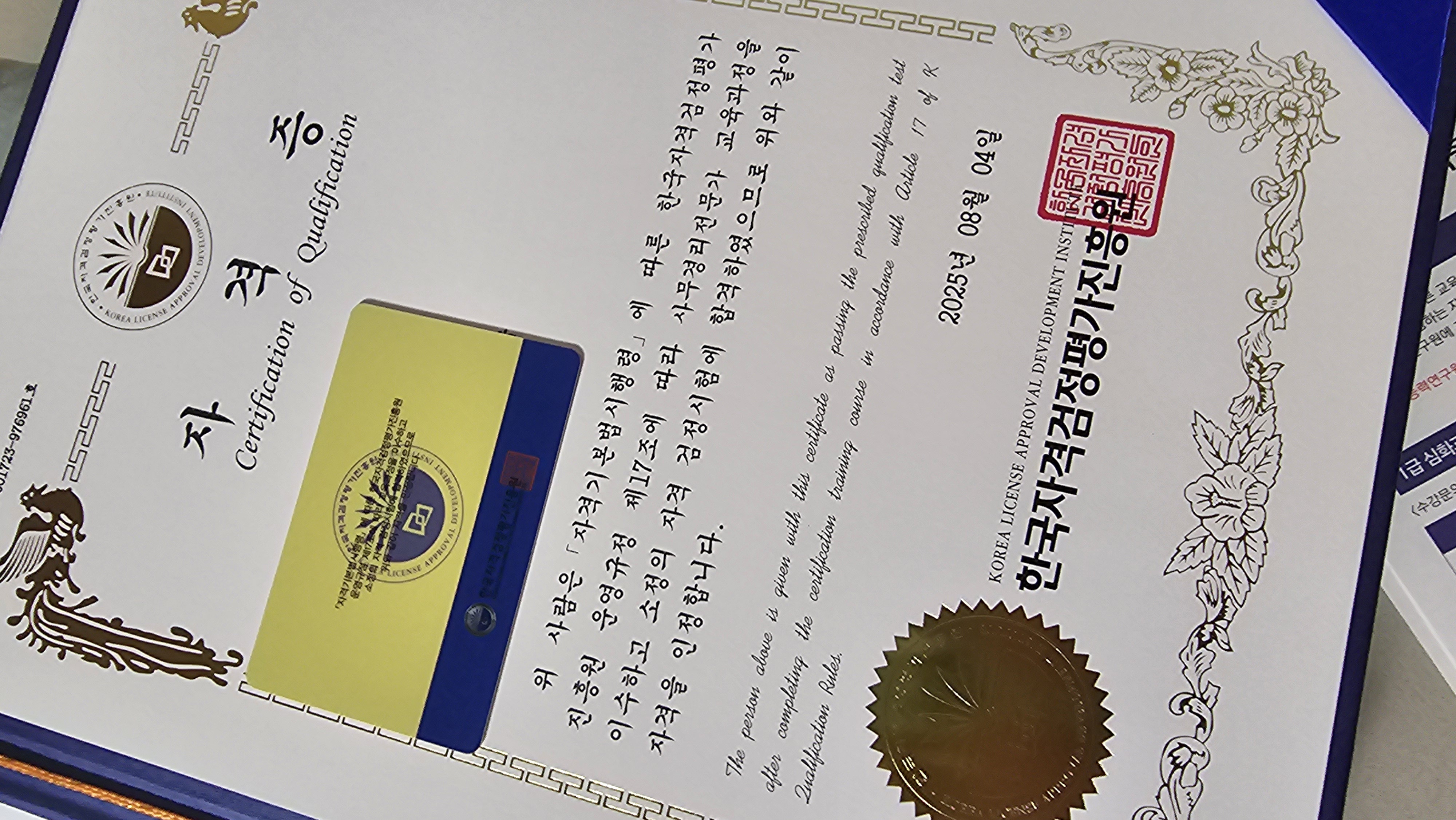 한국자격검정평가진흥원에서 집중스피드로 자격증 취득하였습니다 배움을 갈망하며 아직도 관련 공부는 계속하는중입니다 만학도에게 자신감을 부여해주셔서 감사드립니다 늘