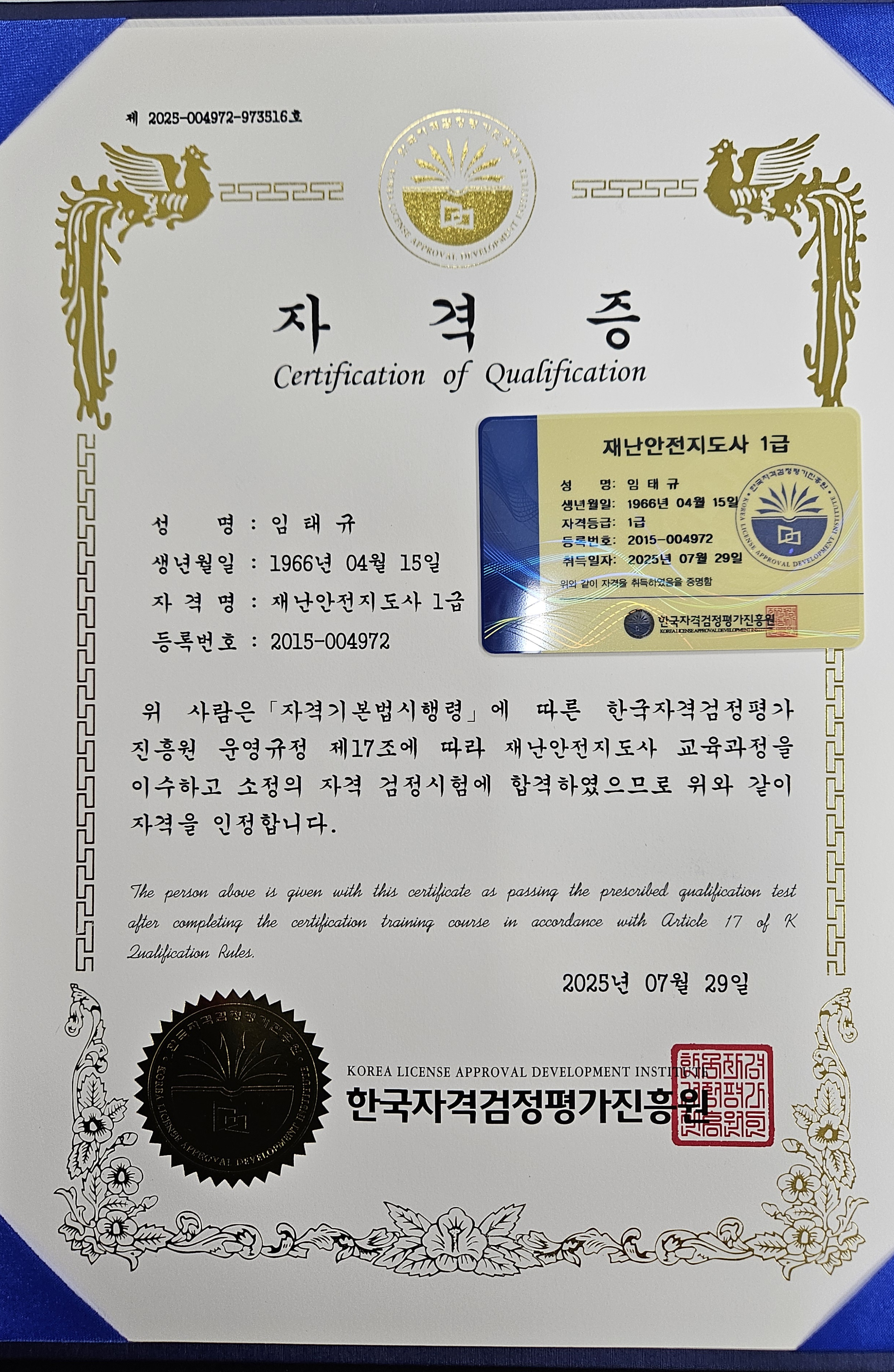 고도화된 산업화로 인한 사회재난과 지구온난화로 인한 자연재해로 부터 생명을 보호하는 안전지킴이가 필요한 시기인것 같습니다. 토목공학을 전공했고 공직생활 30년이상을 건설분야와 재난분야에 근무했기에 누구보다도 재난의 필요성을 피부로 느끼에 되었고 퇴직후에도 재난안전지킴이 로서도 필요할것 같아 자격증을 취득하게 되었습니다.