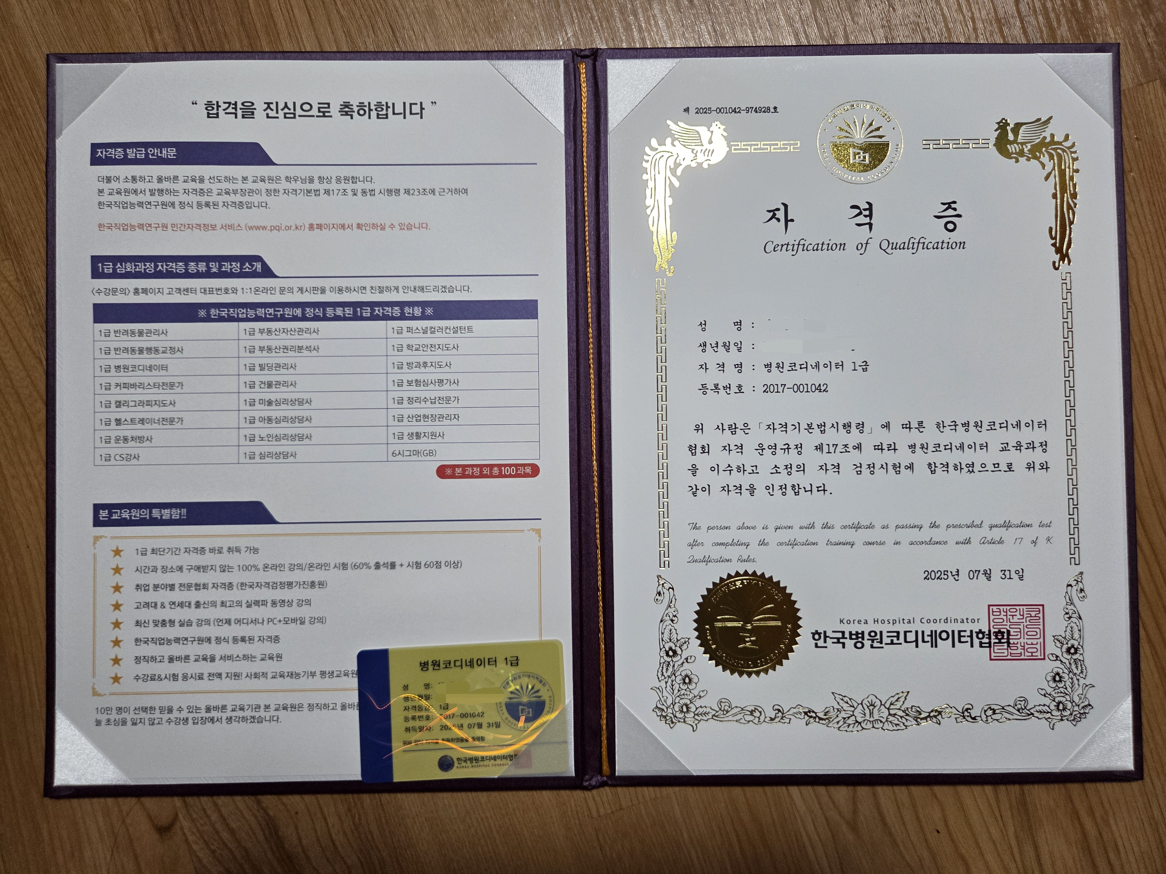 이직을 생각하면서 병원 코디네이터에 관심이 생겼는데, 구인 공고를 보니 병원코디네이터 자격이 있으면 우대해주는 곳들이 있더라고요. 자격증을 취득하면 조금이라도 도움이 될 것 같아 바로 수강해보았습니다. 강의 잘 듣고, 기출 문제 풀어보고 시험을 보니 자격증 취득이 전혀 어렵지 않았어요:) 앞으로도 필요한 자격증이 있으면 또 도전해 볼 생각입니다!