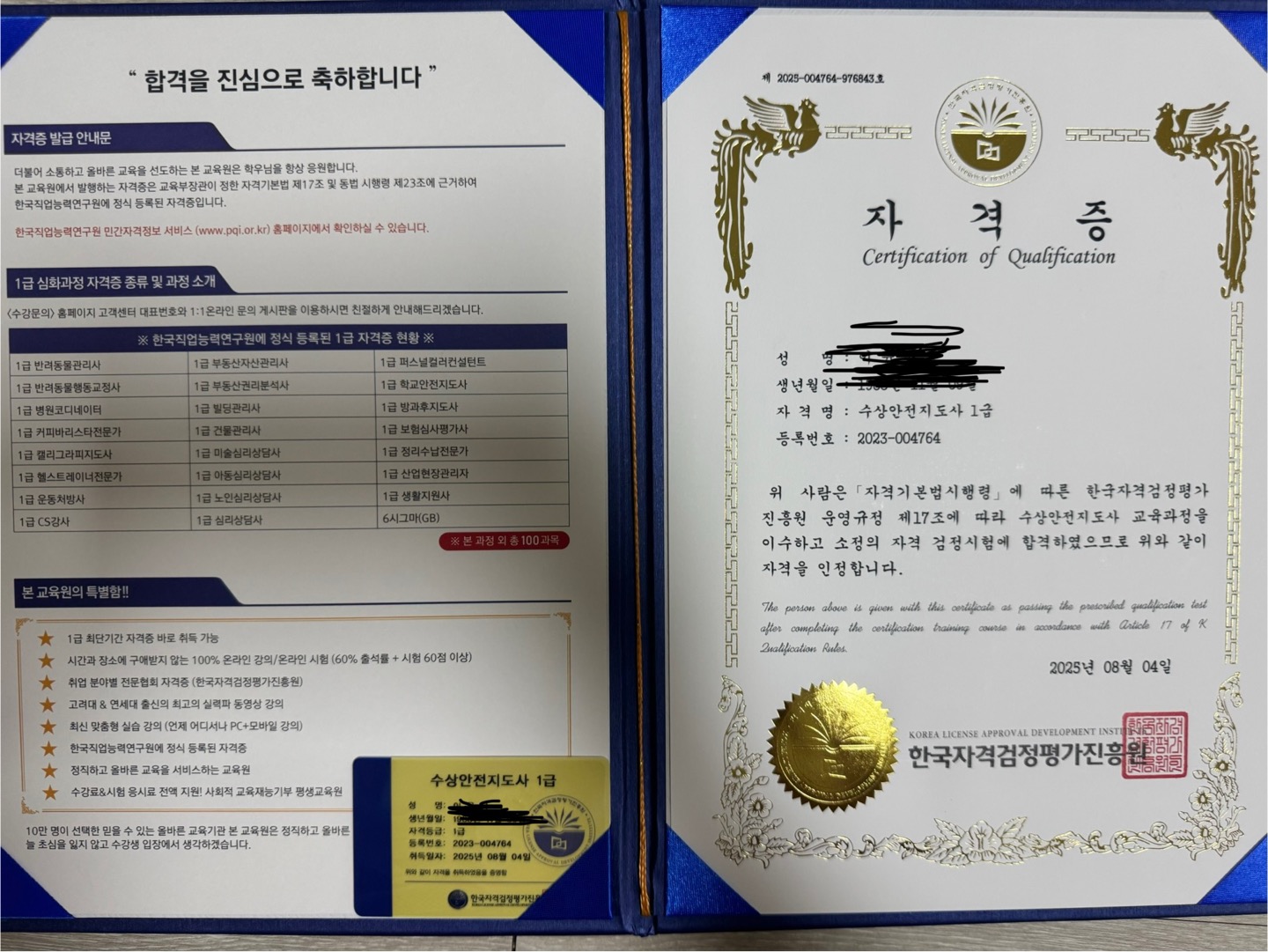원래 라이프가드자격증을 소지하고있는데내년에 갱신을해야되거든요 제가현재 가드일을하기도하고 가드일을하다보면 수상쪽으로필요한것들이많은대 때마침필요했던건대.제가딸수잇을까했고떨리는마음에 초집중해서공부하고시험봤는대 취득했네요 ^^