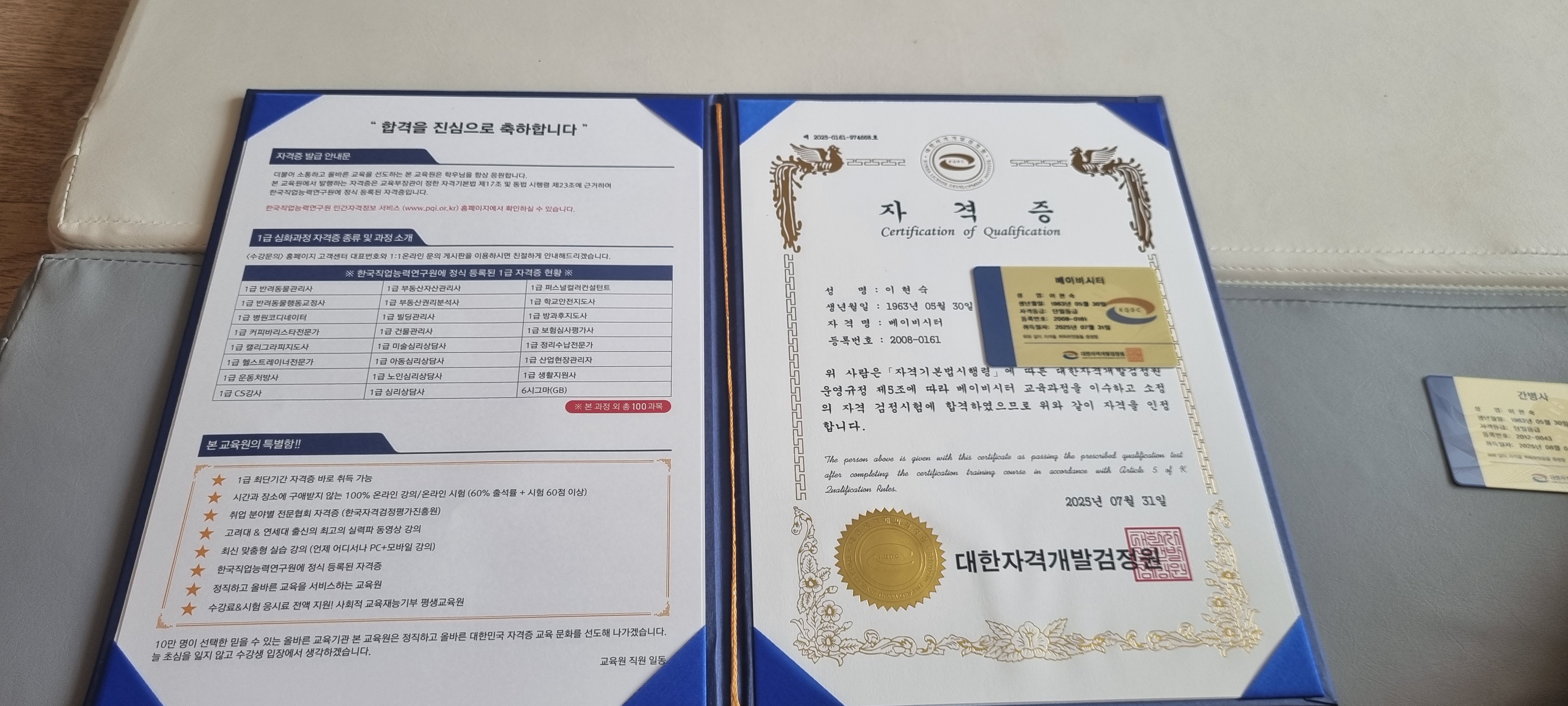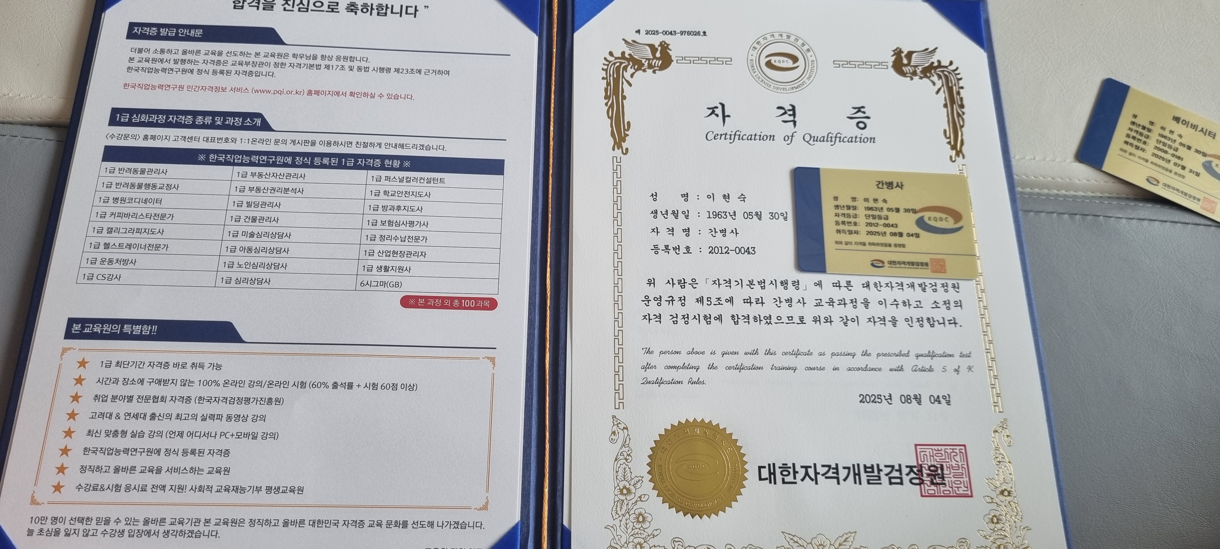 생활지원사 일을 하면서 자격증이 있어야 더 좋을꺼같고 앞으로 우리가 어느일을 하던지 자격증이 있다면 더 든든하지 않을까해서 취득하게 되었습니다ᆢ앞으로도 다른 자격증에 도전해보고 싶어요ᆢ자격증이 주는 자신감이 너무 좋네요 ᆢ