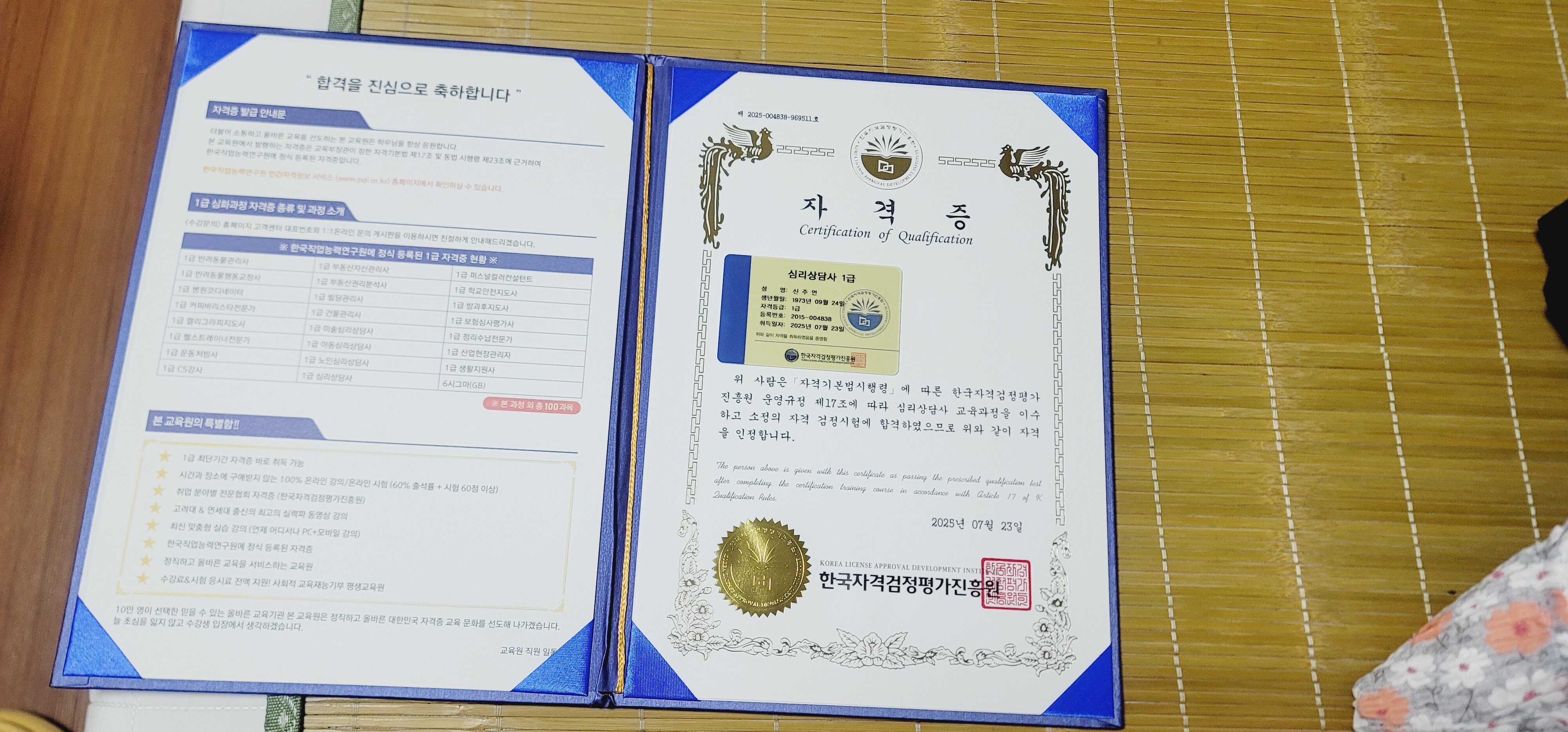 사회복지사2급 공부하면서 같이 연계로 취득하면 좋은 자격증이 심리상담사 자격증이라고 해서 취득하게 되었습니다. 나이들고 취직도 어려워지고, 복지센터, 복지관 근무하고 싶어도 젊은 사람들을 채용 하지 나이 많아지니까?힘이 드네요! 운전면허증, 컴퓨터 활용능력, 심리상담사 자격증으로 나이좀 더 먹어도 계속 일하고 싶습니다. 민간자격증도 많이 따 놓인면 스팩이 쌓이지 않을까요?