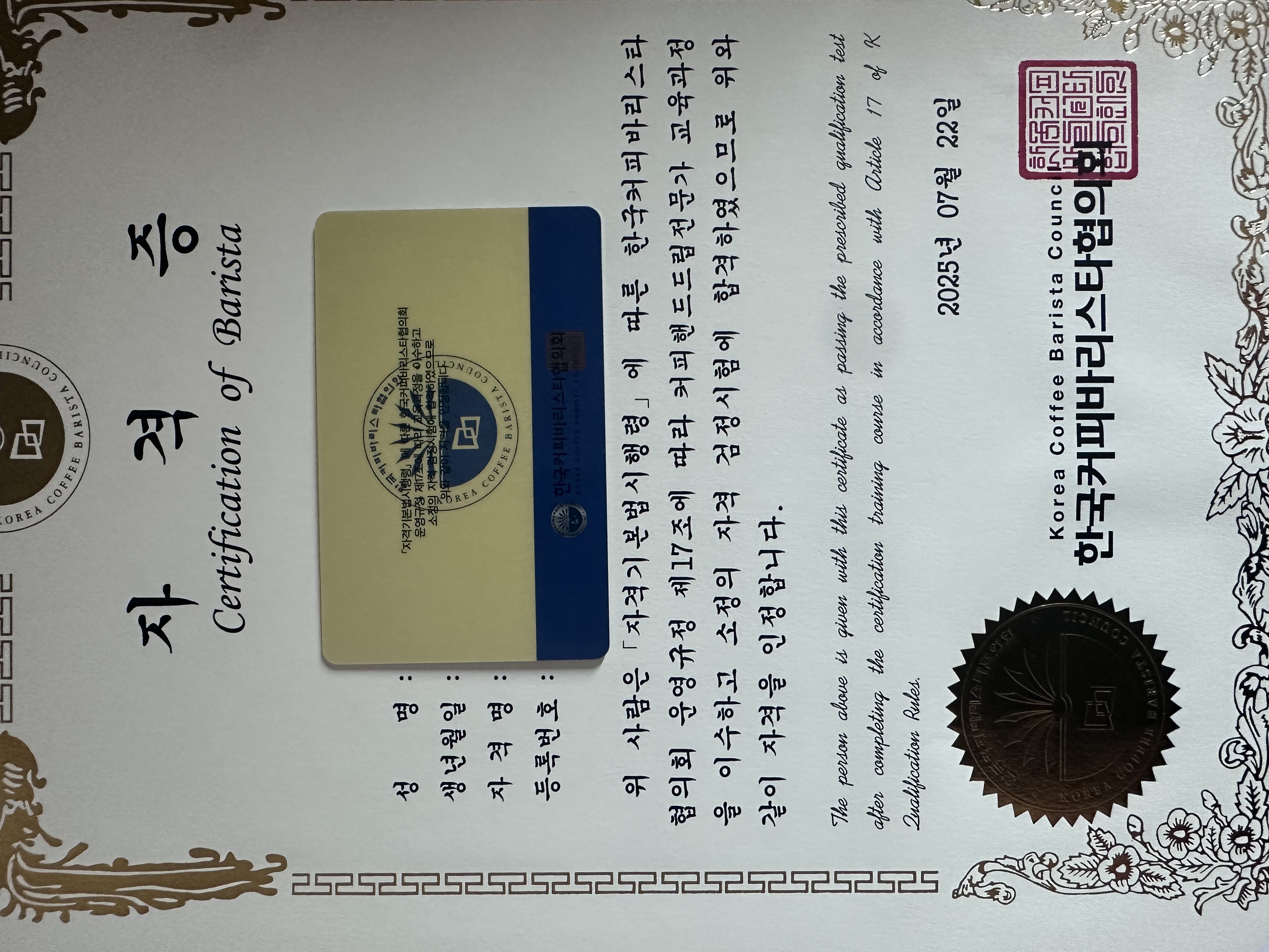 재취업이 어려워 경단녀가 될 위기였지만, 슬퍼하고 자괴감이 들 수 있는 그 시간에 틈틈히 자격증 공부를 시작하게 되었어요. 어릴적 카페 아르바이트를 했던 경험을 살려 자격증을 따보니 자신감이 한껏 붙네요. 감사합니다^^