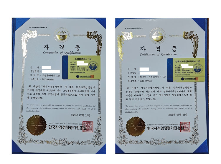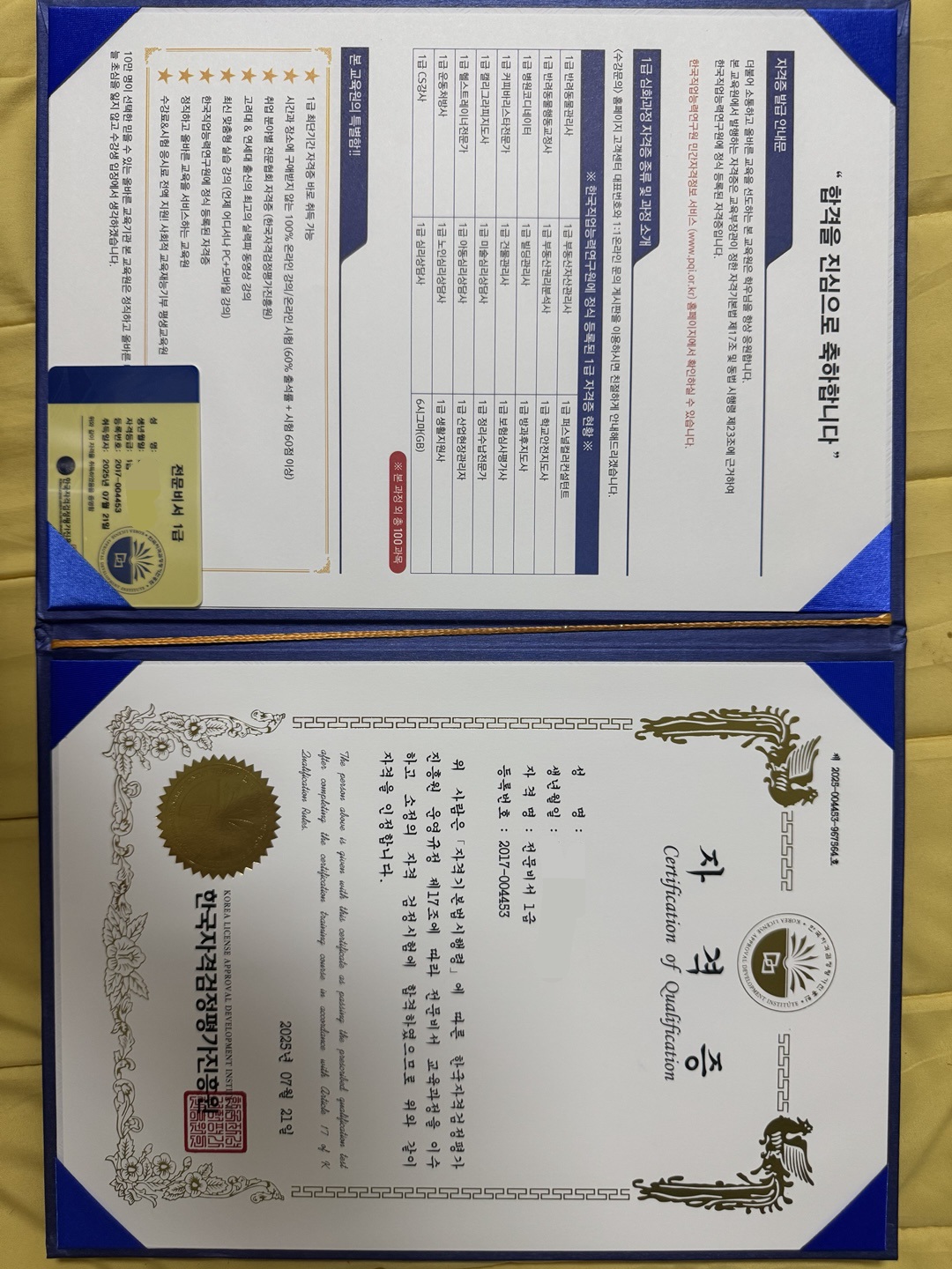 주말에 sns를하다가 광고에나오길래 이게뭐지하고들어가봤는대 자격증을딸수있다기에 직접들을어갈시간은없고 기존에따고싶다는생각은하고있었는대 인터넷으로 강의를듣고딸수있다고하길래 과목도많았고 특히나 내가따고싶었던 자격증을딸수있어서 가장좋았고 그뿐아니라 다른자격증들도딸수있다라는게 가장좋은것같아서 지금도 다른자격증을따고있어서 너무유용하게잘듣고있습니다 꼭내가 따려고하는것뿐만이아니라 다른것들도 따는중이라서 더 좋은것같아요