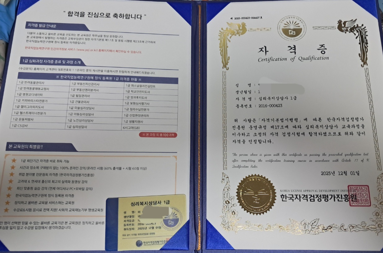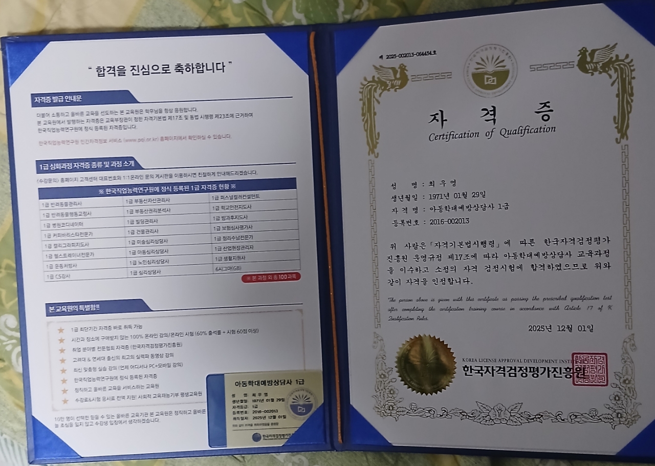 아동들이 학대 당하는 것을 막아내는 일이 얼마나 소중한 일인지 알고 예방을 힘쓰는 상담사가 되어야 합니다. 멋진 자격증이니 기분 좋습니다.