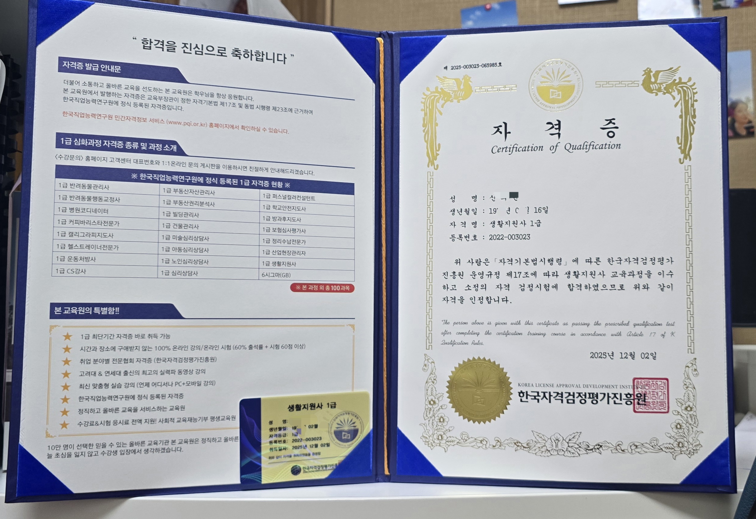 나이를 떠나서 내가 할 수 있는 일, 좋아하는 일 그리고 고령화 시대에 하고 싶은 일을 하려면 먼저 관련 자격증이 필요할 것 같아서 온라인 25강의도 도움이 되었고 자격증 취득하여 취업의 가능성이 높아져서 좋습니다.
