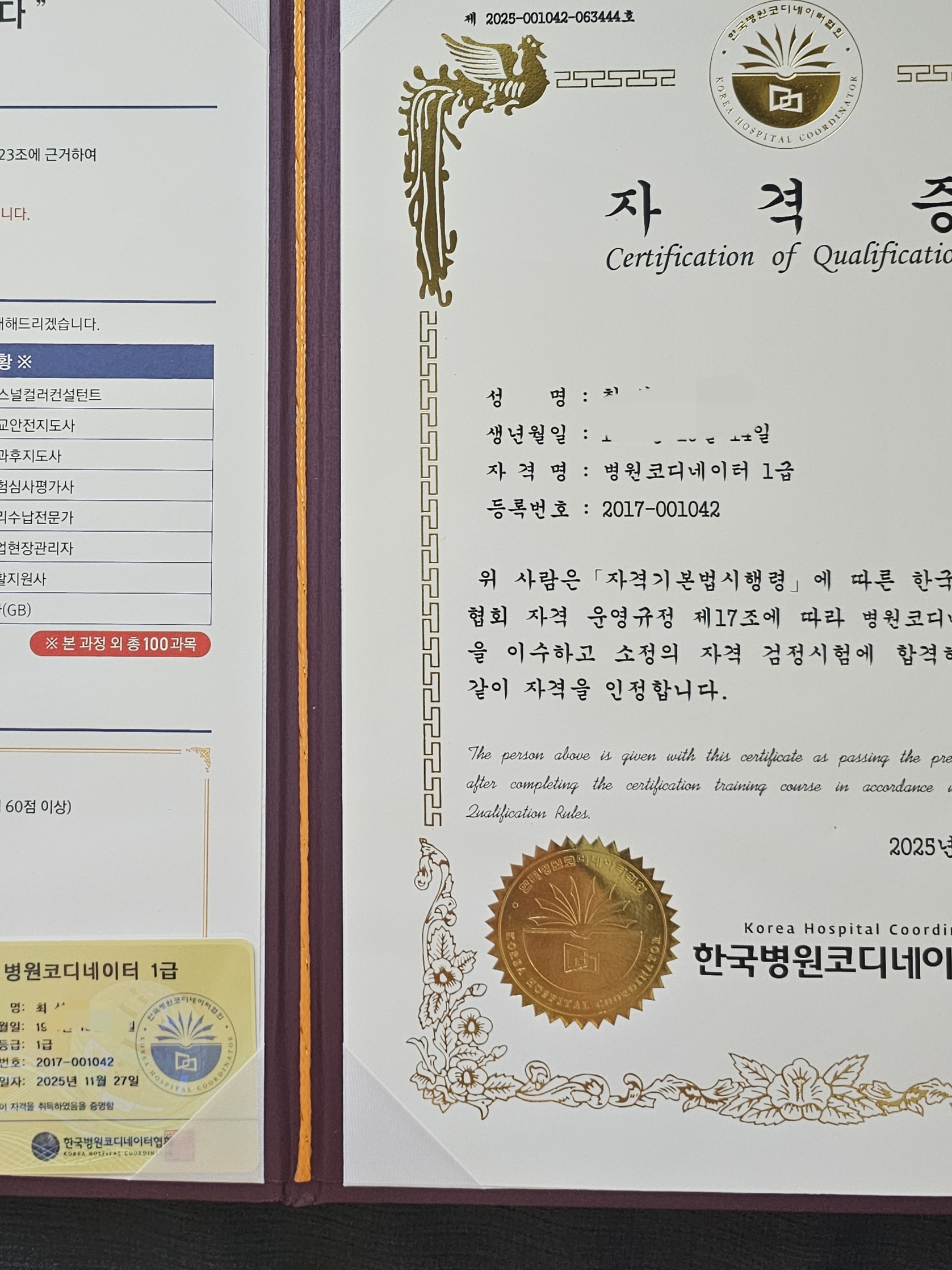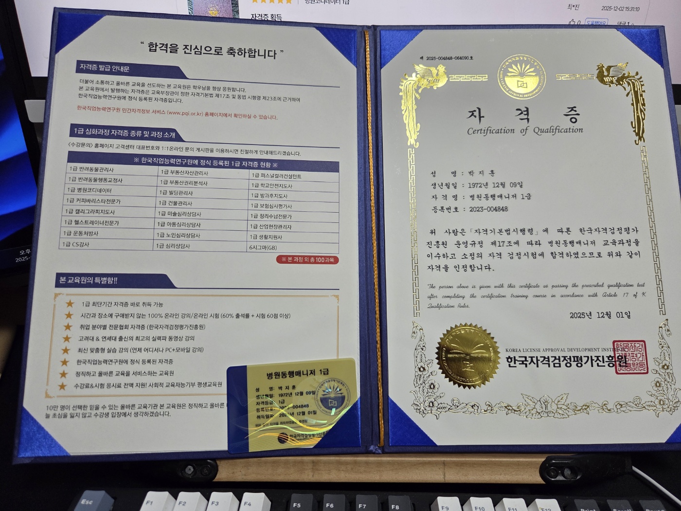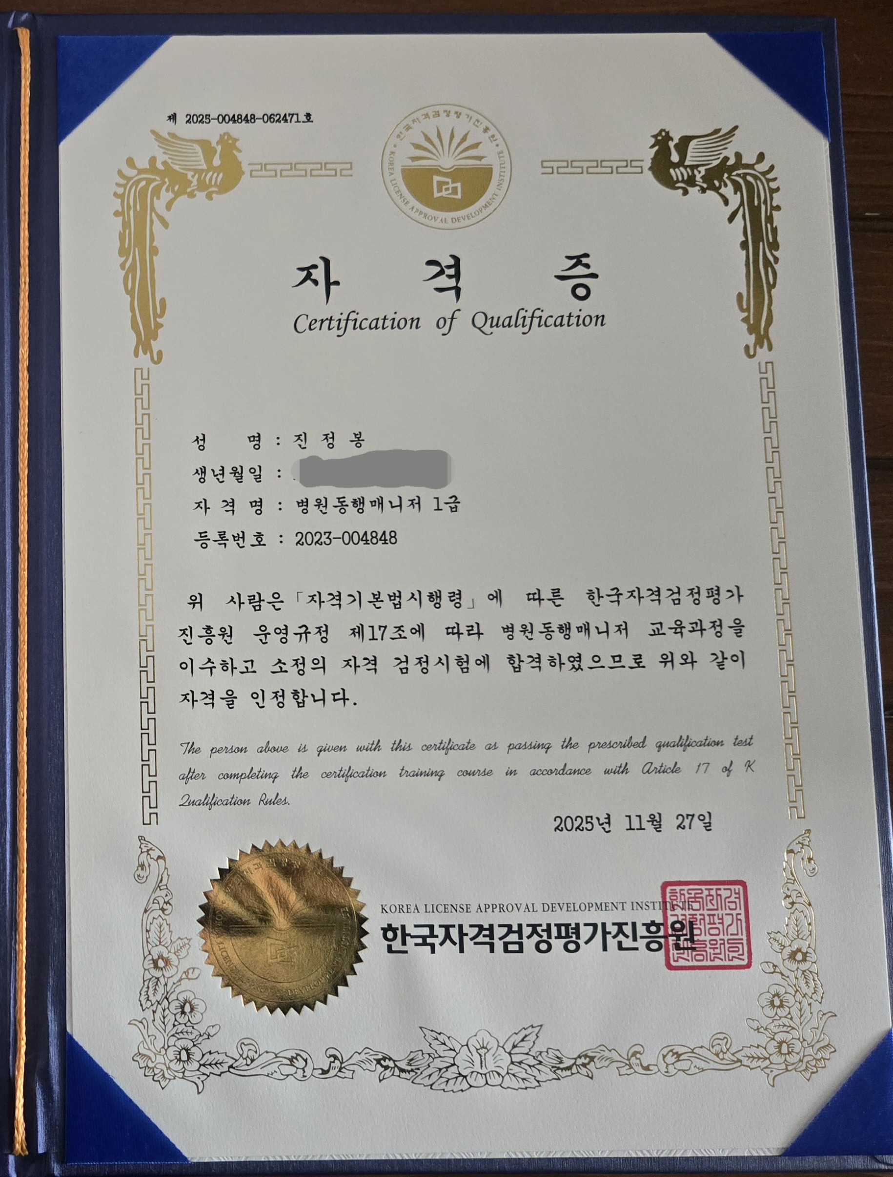 병원동행매니져 자격증 강의를 듣고 하루만에 합격하게 되었네요 새로운 일에 도전하기에 참 좋았던거 같습니다