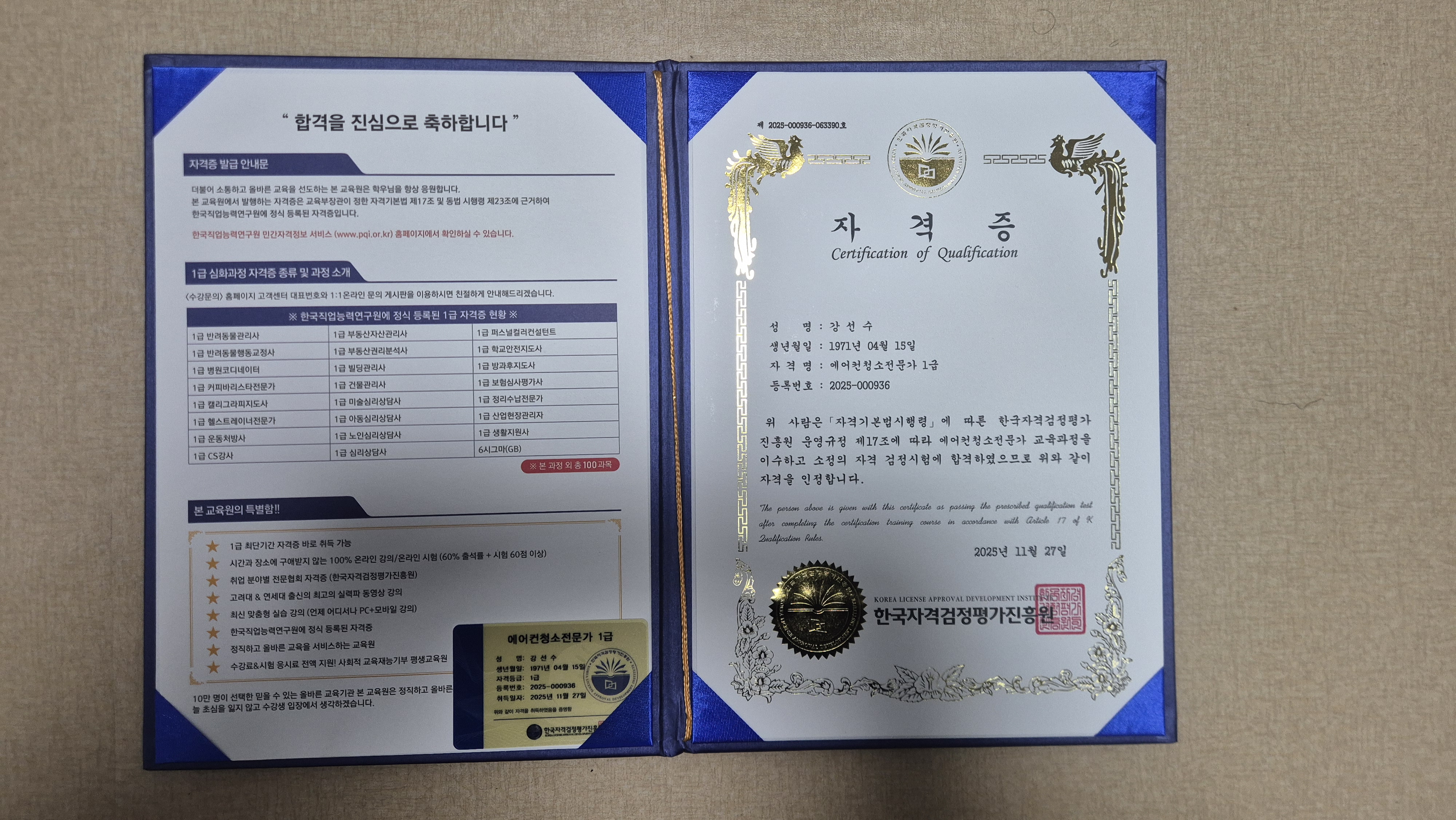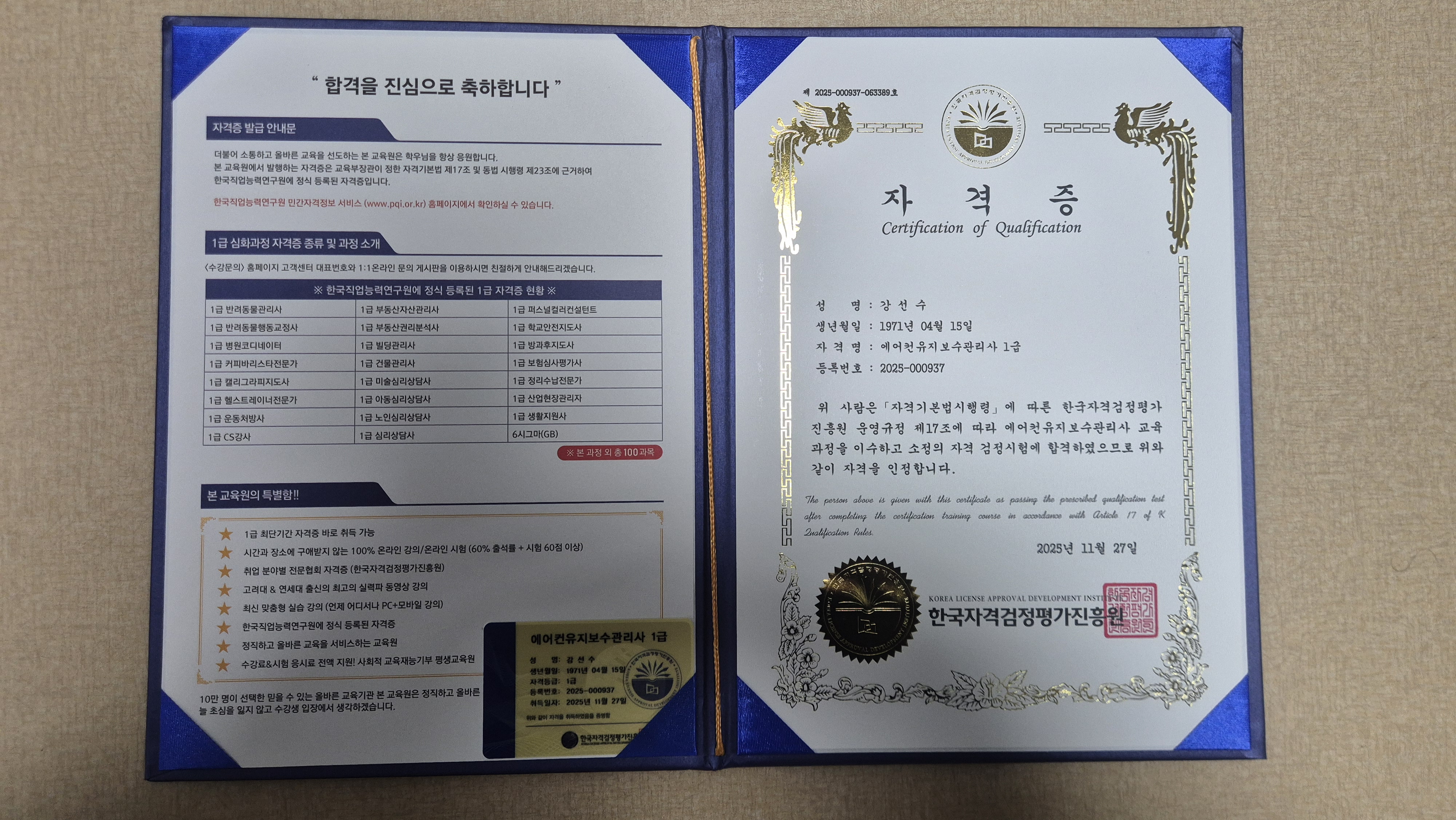 에어컨 청소두하면서 유지보수 자격증 까지~ 취득하게 되서 좋네요
