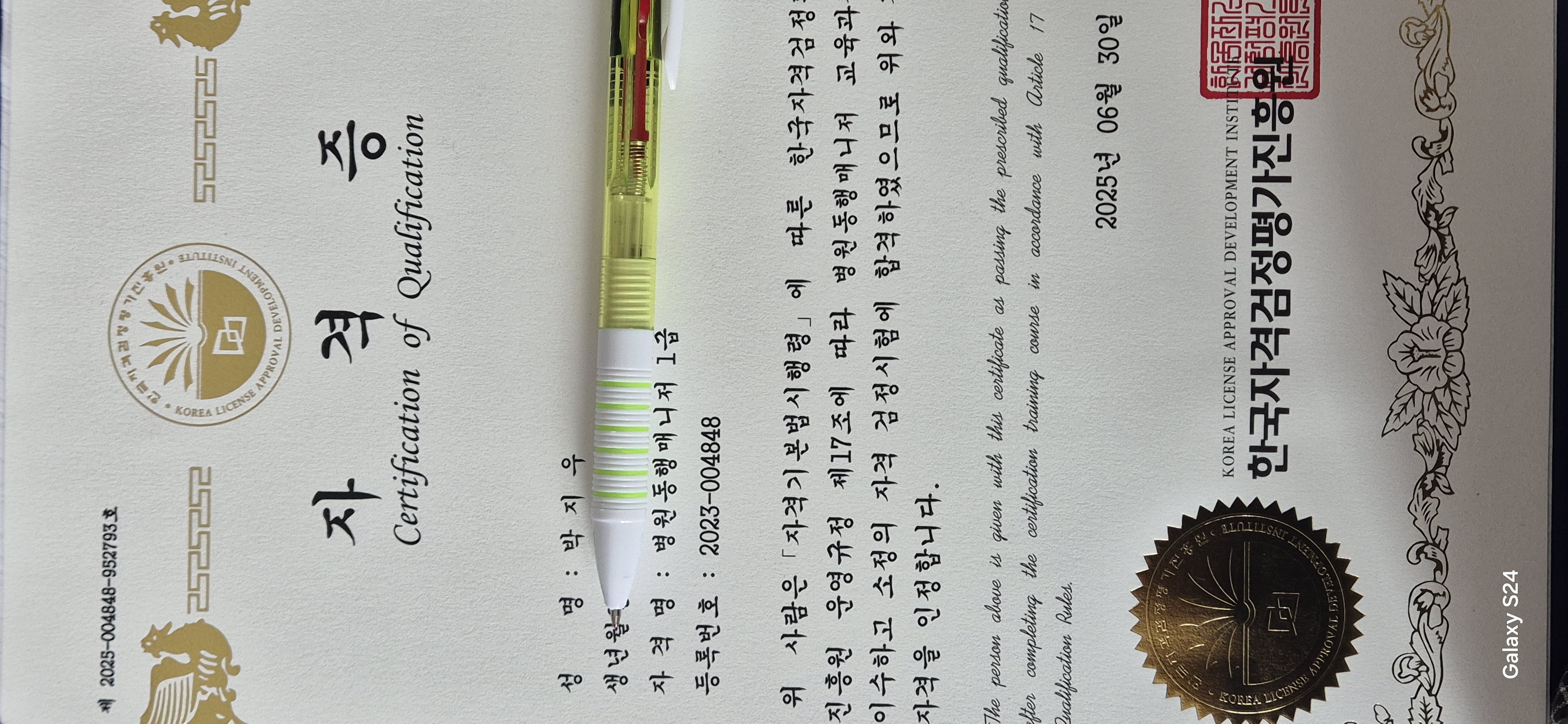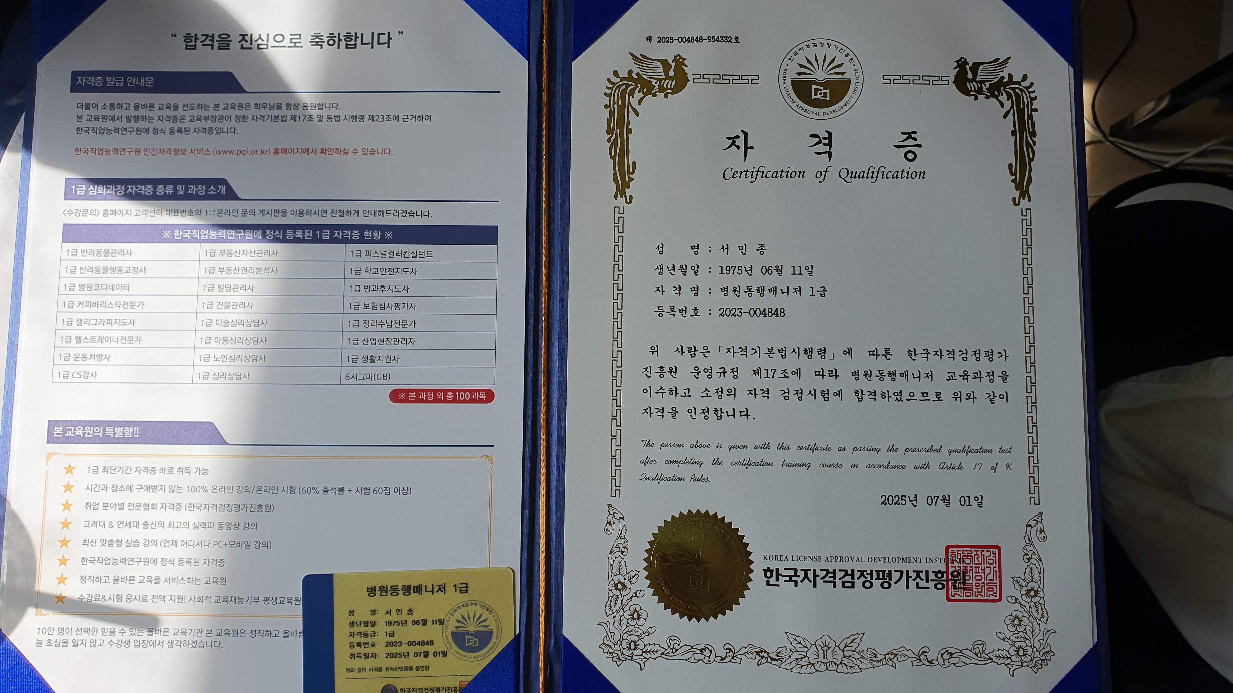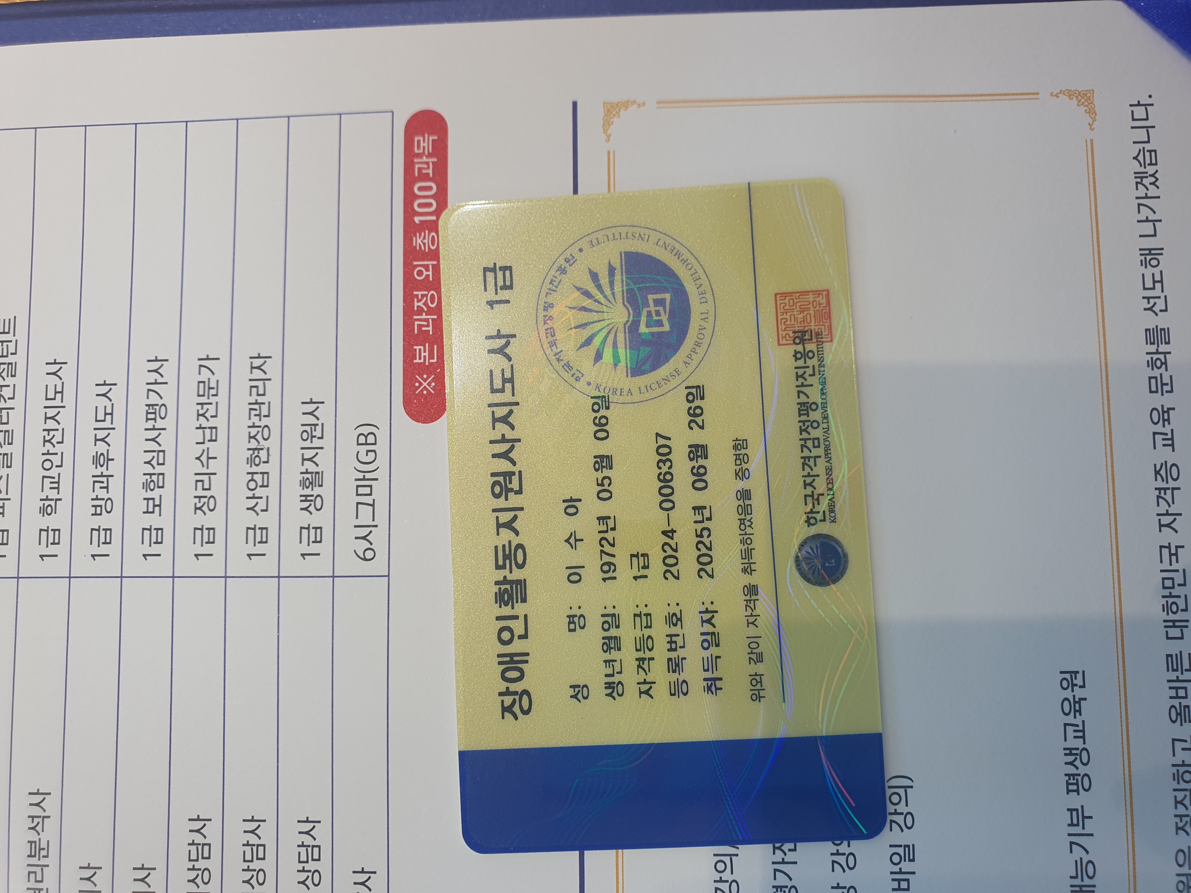 SNS로 생활지원사1급 자격증취득과정 알게되었고 유투브로 잡다한내용 듣던거 끊고 강의에 집중한결과 자격증취득하고배송까지 받았어요, 기분이좋습니다, 병원동행매니저1급도 수강완료하고 자격증신청 해놓았습니다~^^