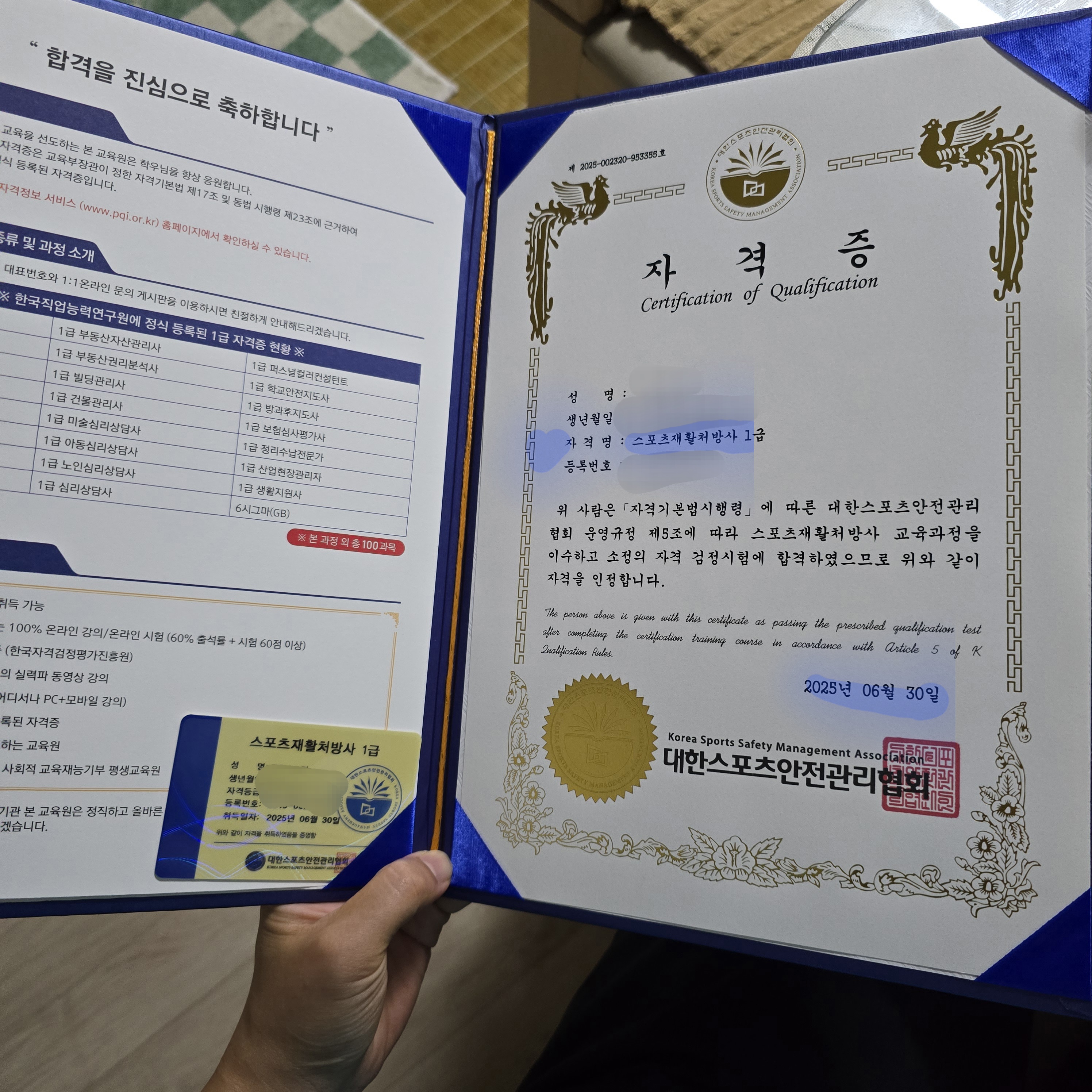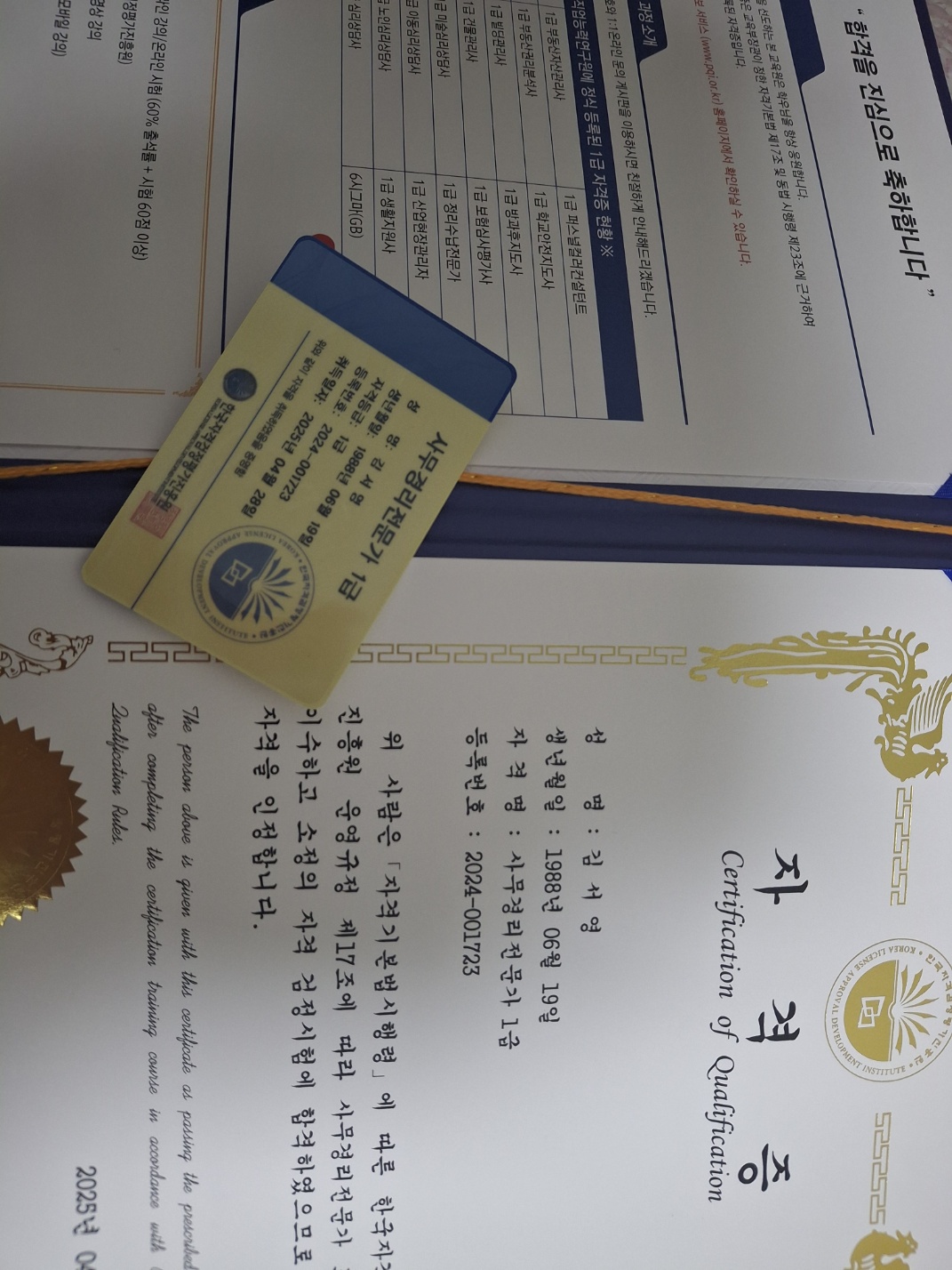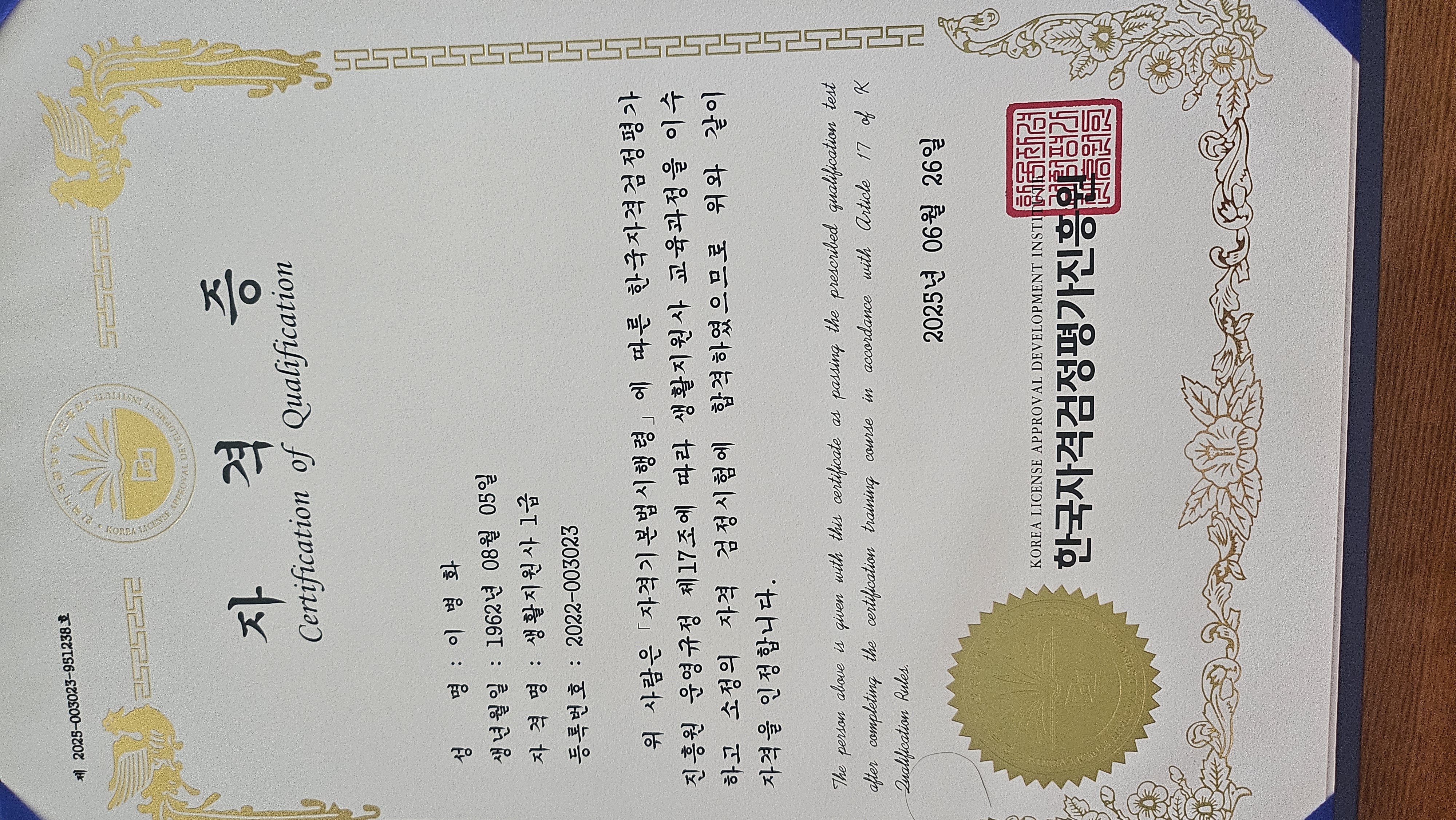 SNS로 생활지원사1급 자격증취득과정 알게되었고 유투브로 잡다한내용 듣던거 끊고 강의에 집중한결과 자격증취득하고배송까지 받았어요, 기분이좋습니다, 병원동행매니저1급도 수강완료하고 자격증신청 해놓았습니다~^^