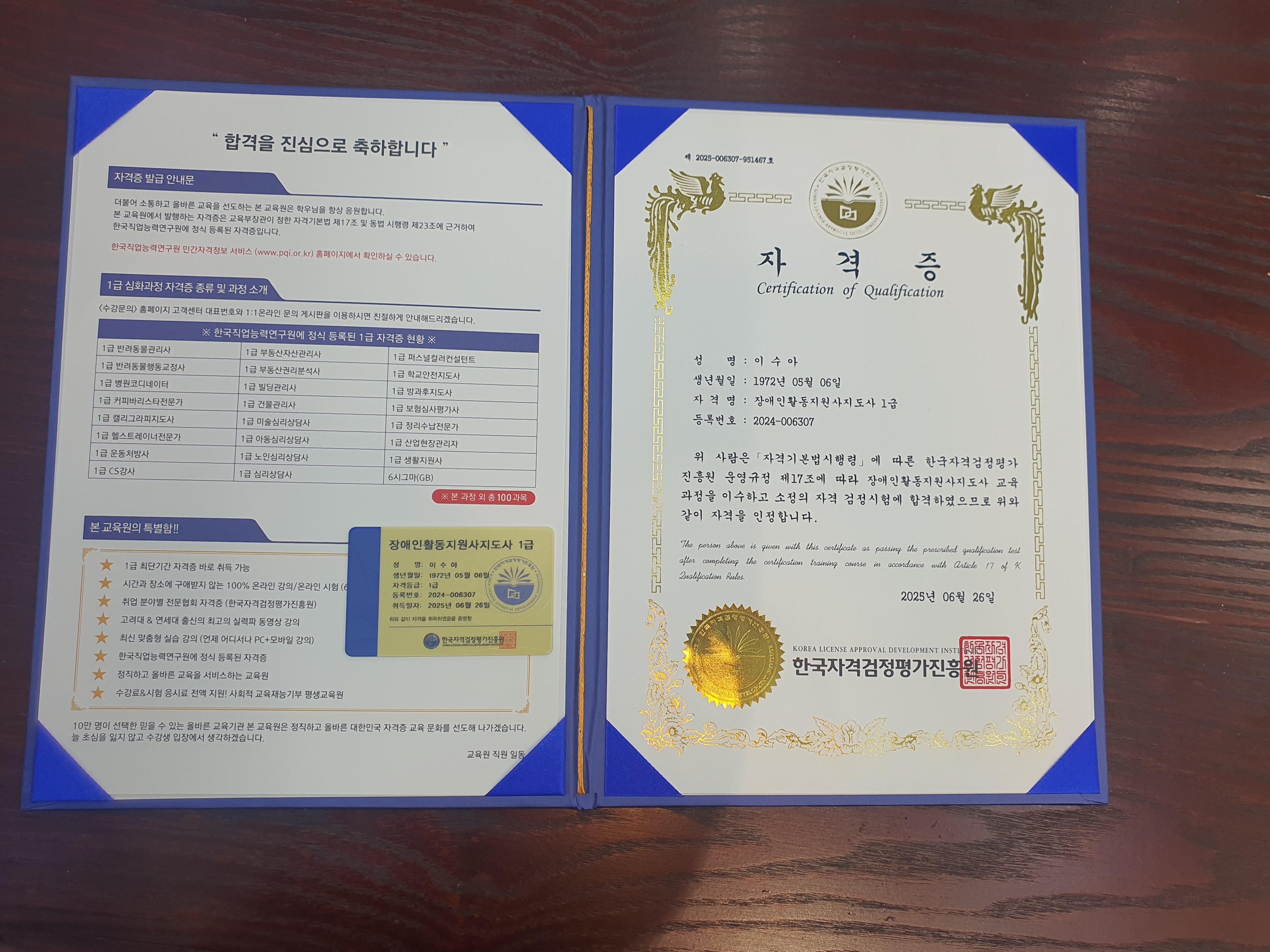 동생이 장애인이라 장애인관련된일에 관심을가지고있었는데 행동으로 못옮기다 좋은기회에 자격증을 쉽고 빠르게 취득할수 있어서 좋았어요 지금은 하는일이 있어 당장 일을할수없지만 일 이년후쯤 직업전환예정입니다 올해 여기에서 3개 자격증 취득이 목표예요