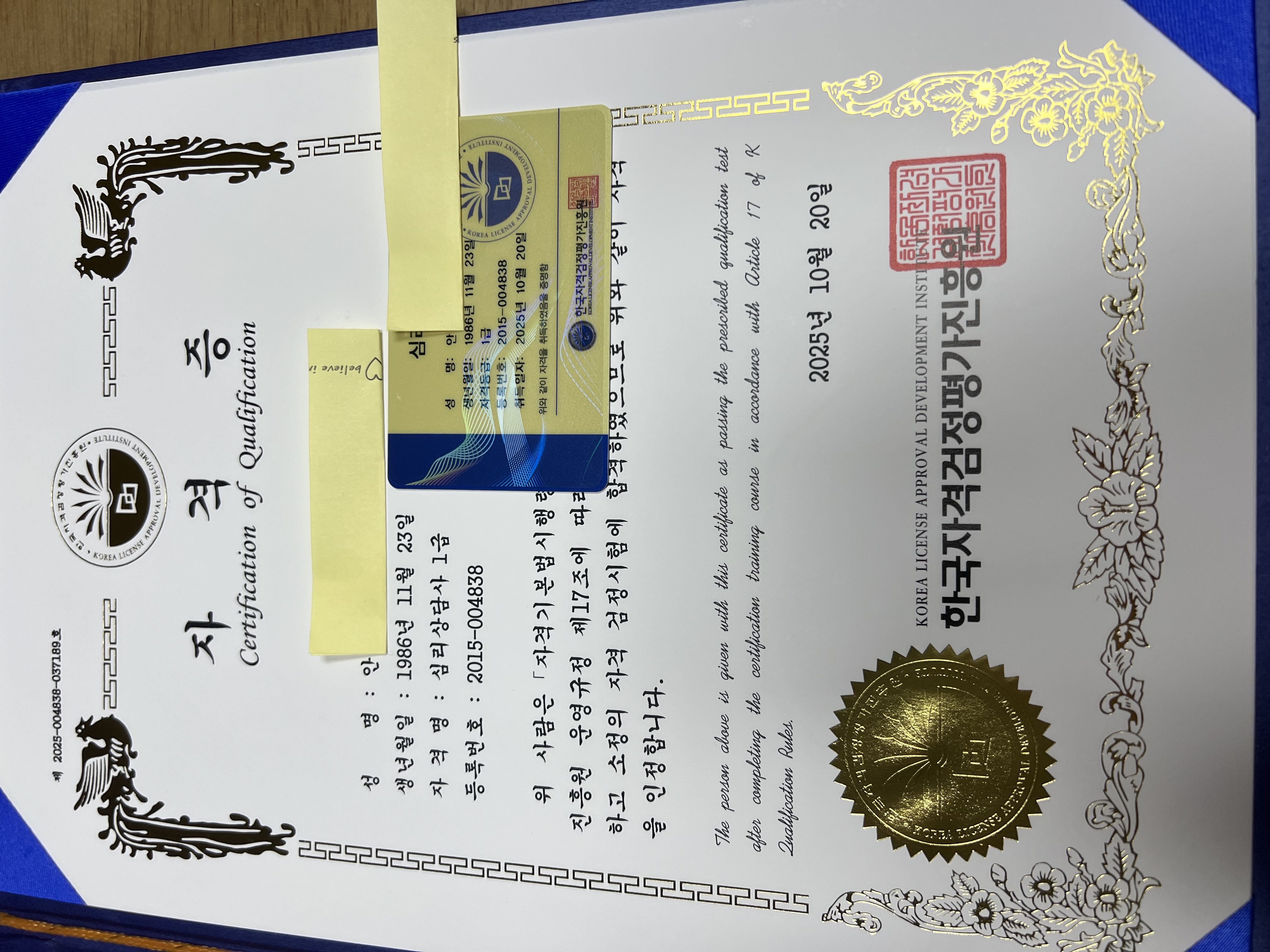 심리상담사 1급 취득했습니다!