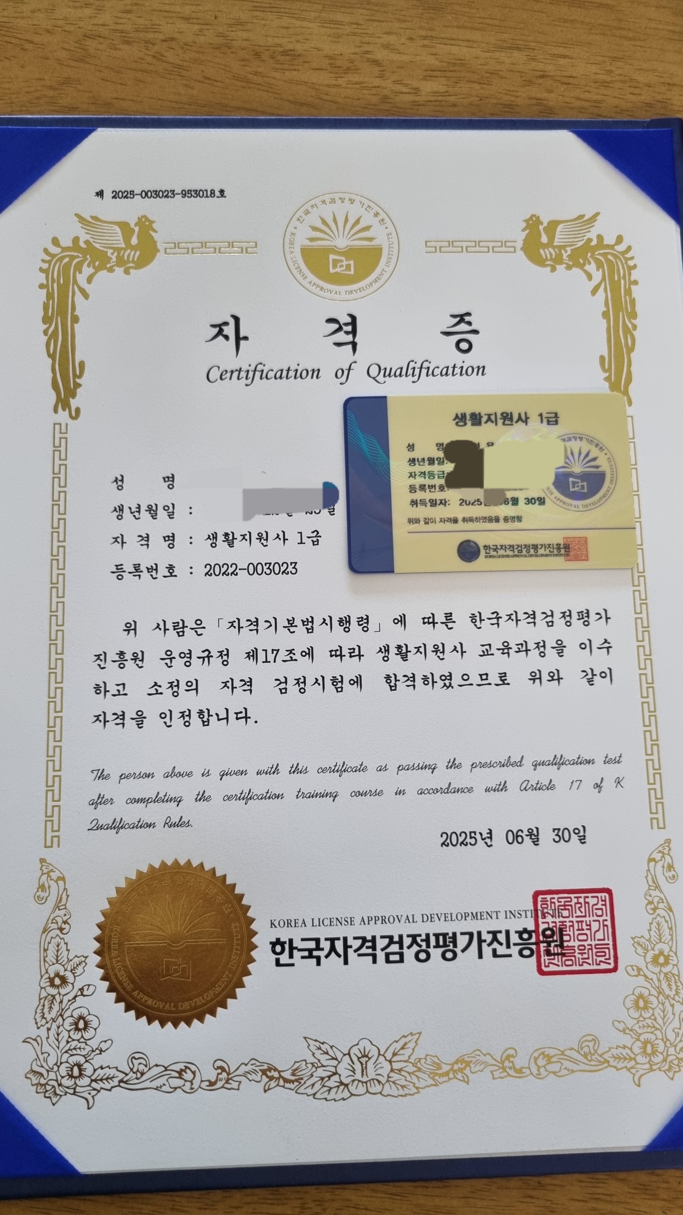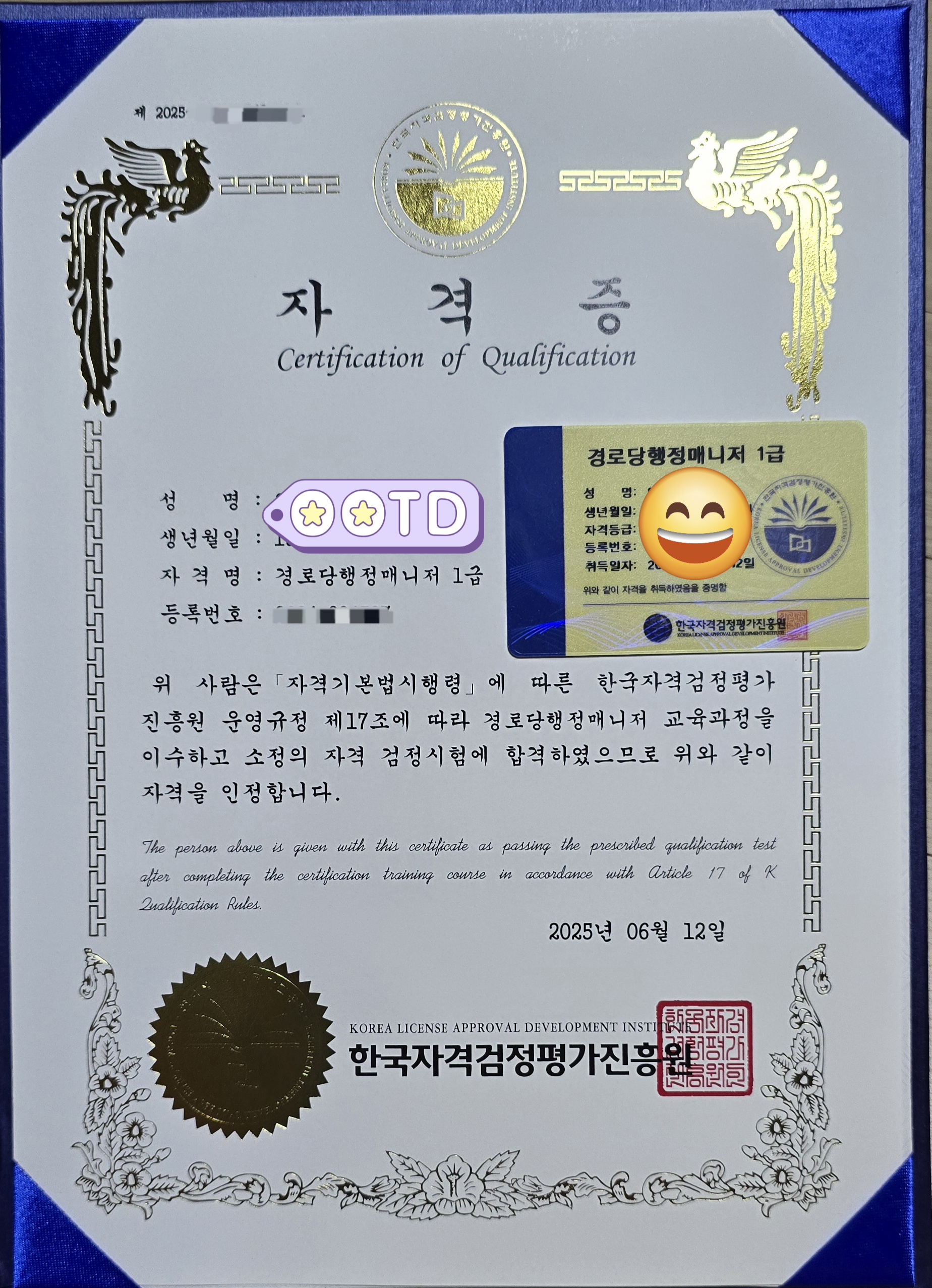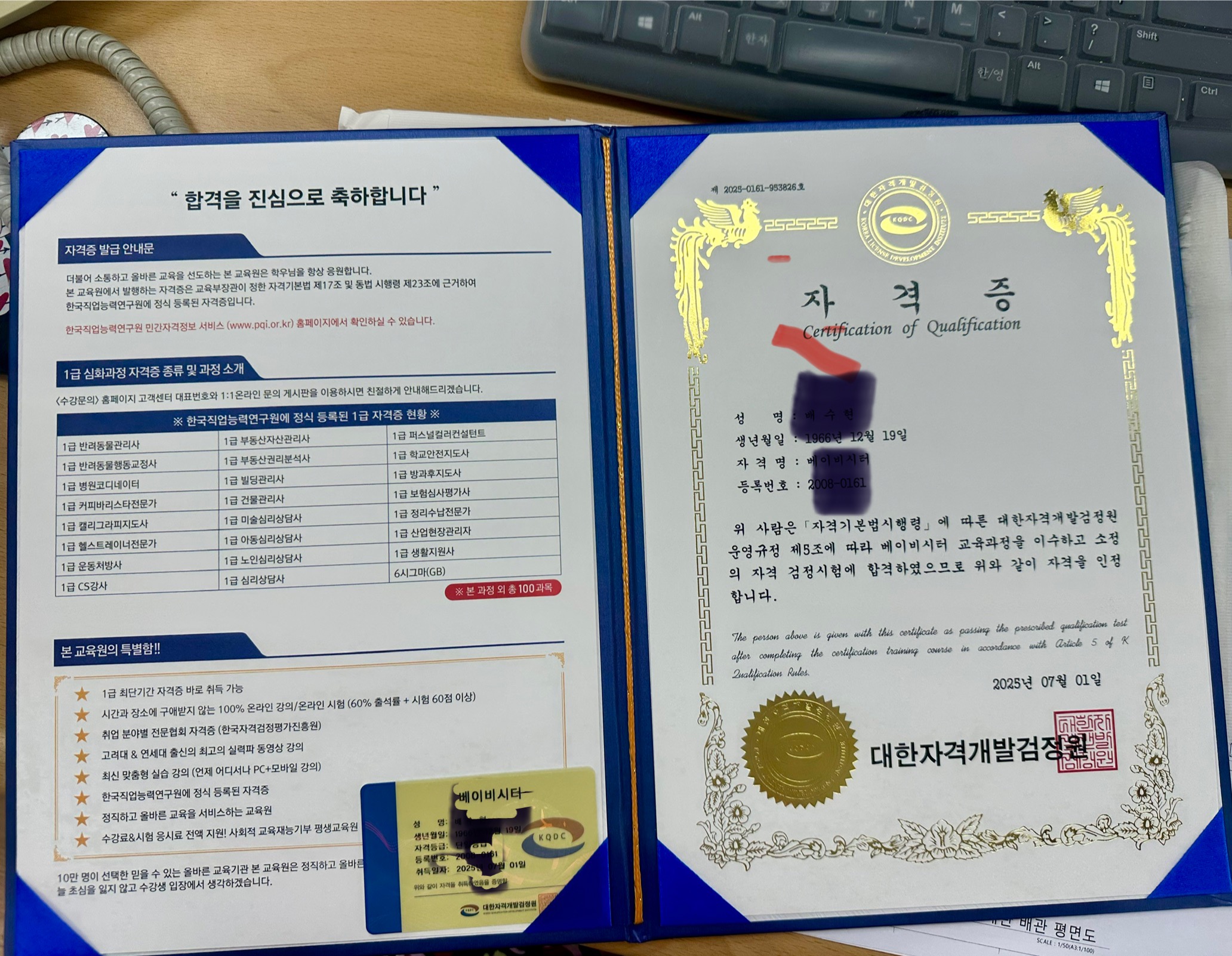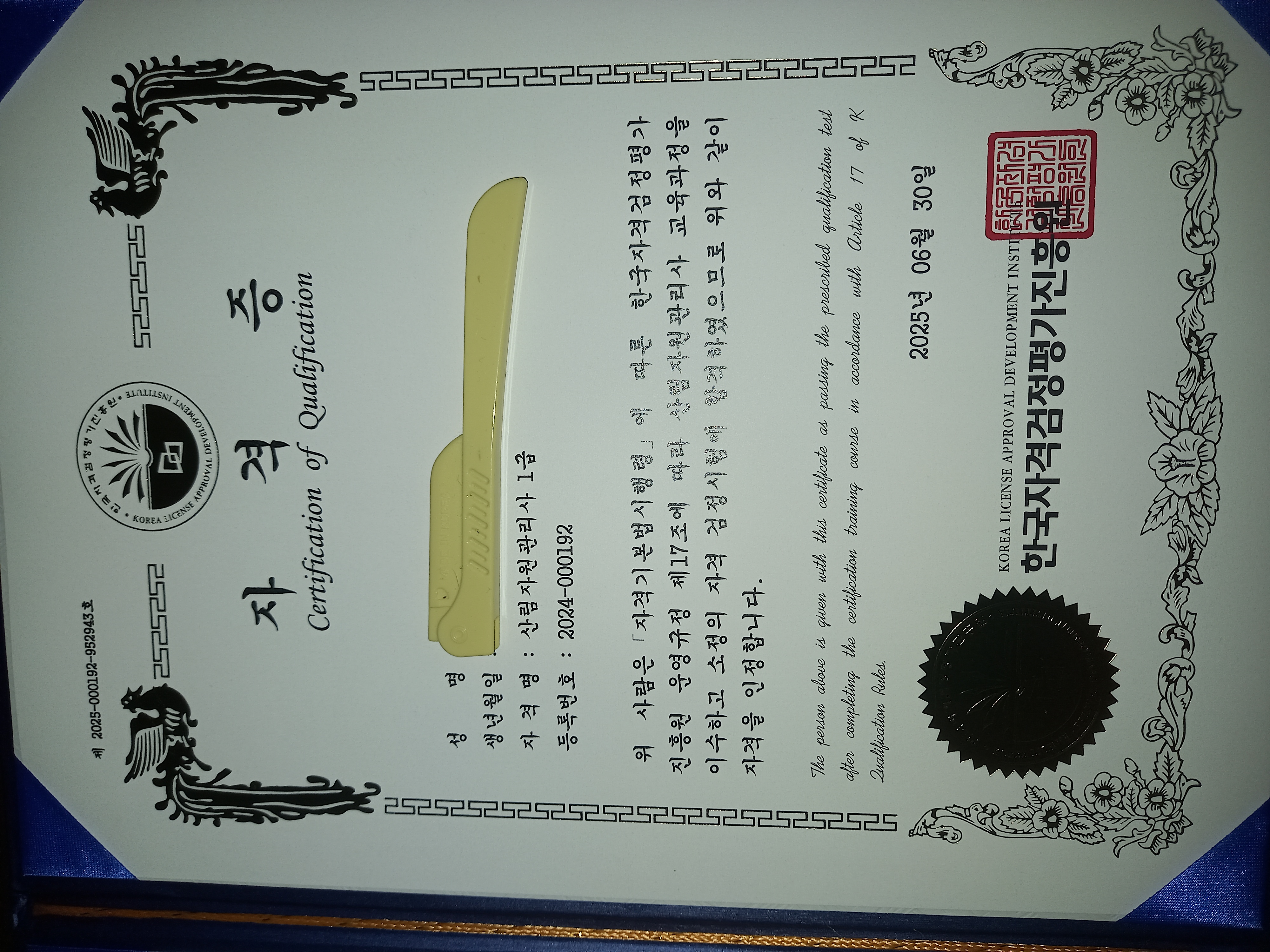 자영업을 하다 힘든 경제난으로 폐업을 한뒤 무슨일을 할까 고민 하던중 노후도 준비할겸 자격증을 따봐야 겠다 싶어 시작했죠 집중해서 공부했더니 이렇게 자격증 취득 했네요 기뻐요