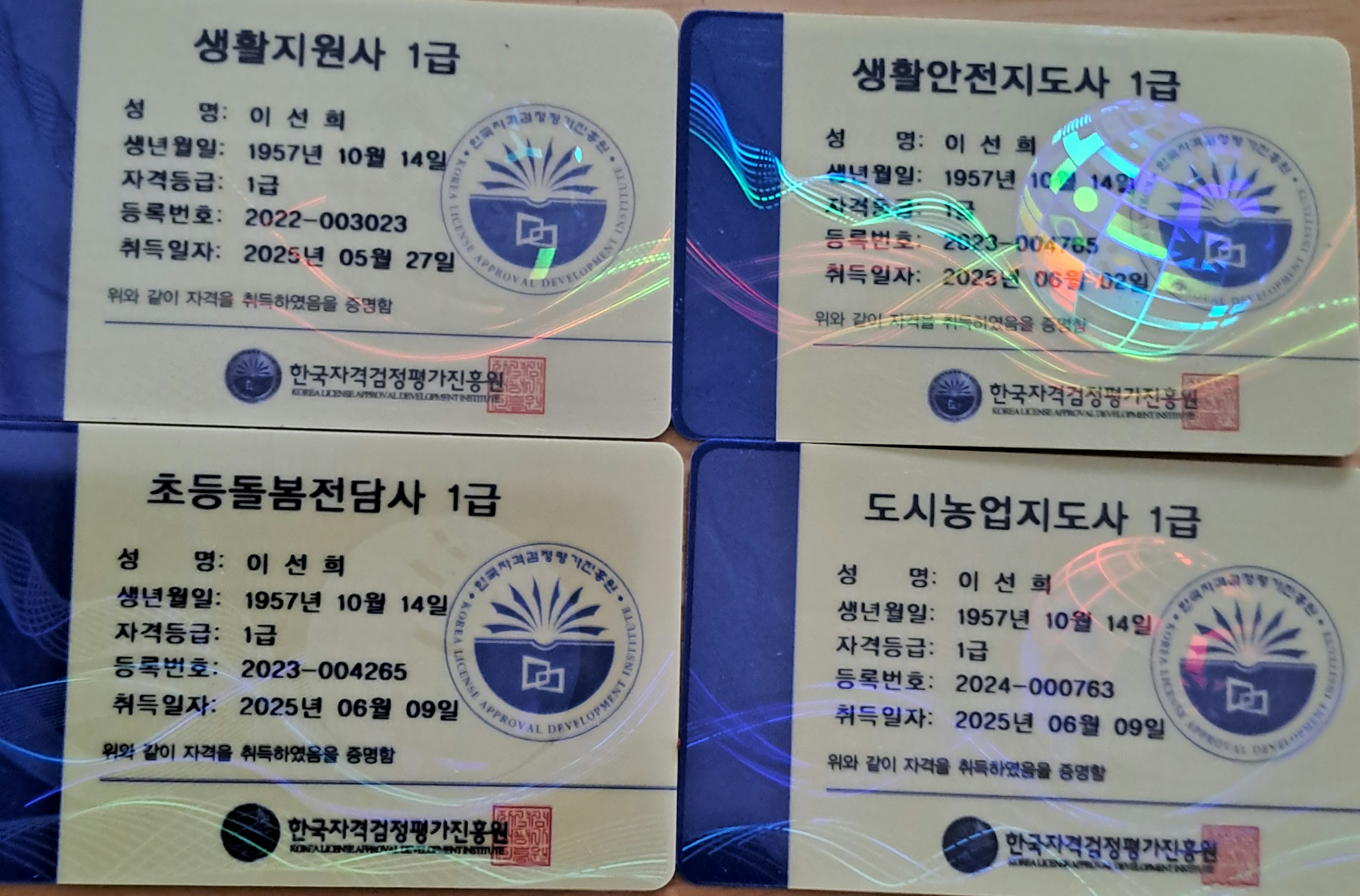 자영업을 하고 있는데 요즘 너무 힘들어서 고민하던 차에 광고보고 이렇게 쉽게 자격증을 딸수 있는곳을 알게 되었네요..당장 시작할 일이 아니라도 원하는 자격증 차근 차근 준비해 놓고 꼭 필요할때 쓰려구요~ 다른것도 준비해 볼 예정입니다. ^^