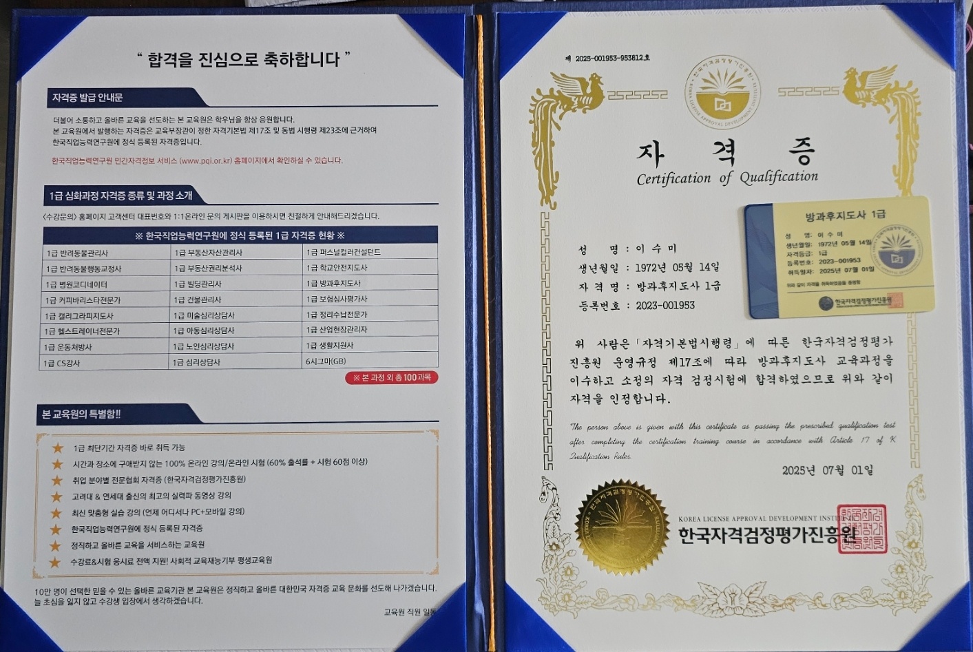 나이가있어 망설이다 공부시작했는데 자료도 잘되있고 교수님설명이 귀에쏙쏙잘들어와요 자격증도 너무빠르게 왔네요 감사합니다