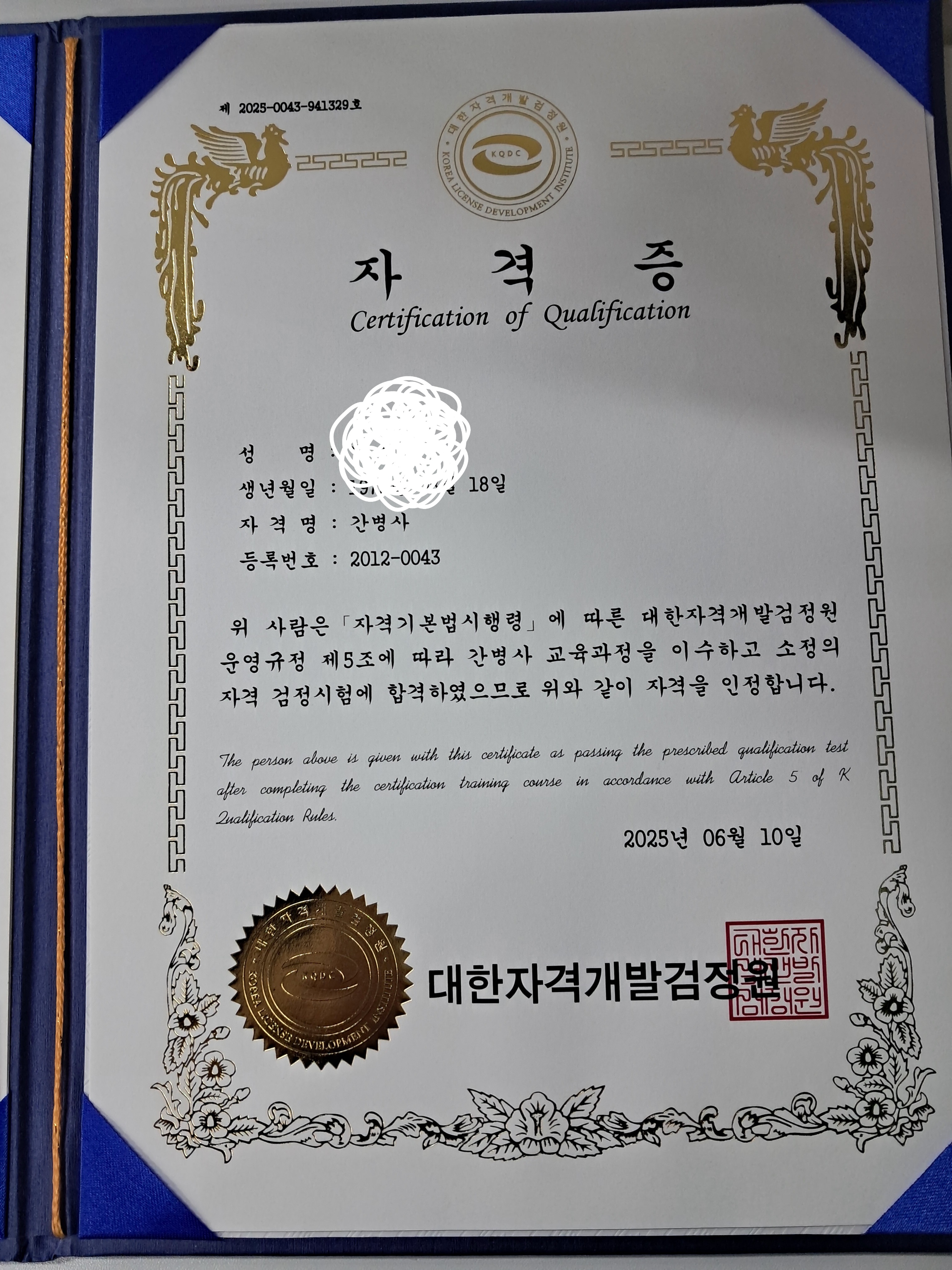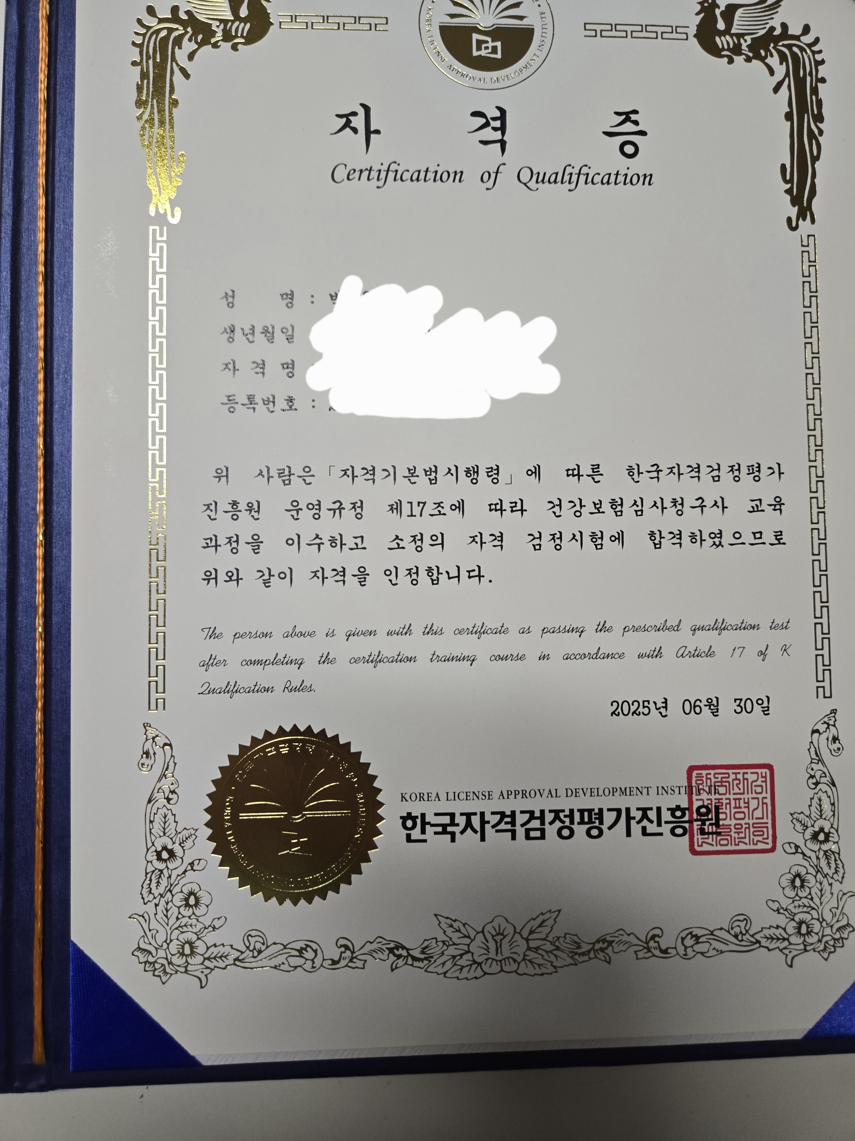 시아버지께서 갑자기 뇌경색으로 쓰러지셔서 며느리로서 조금이라도 도움이 되고자공부했는데 자격증까지 취득하니 더욱 기분이 좋네요. 많은 도움이 될거같아 뿌듯하고 좋고 또 아버지께서도 좋아하셔서 더욱 좋아요