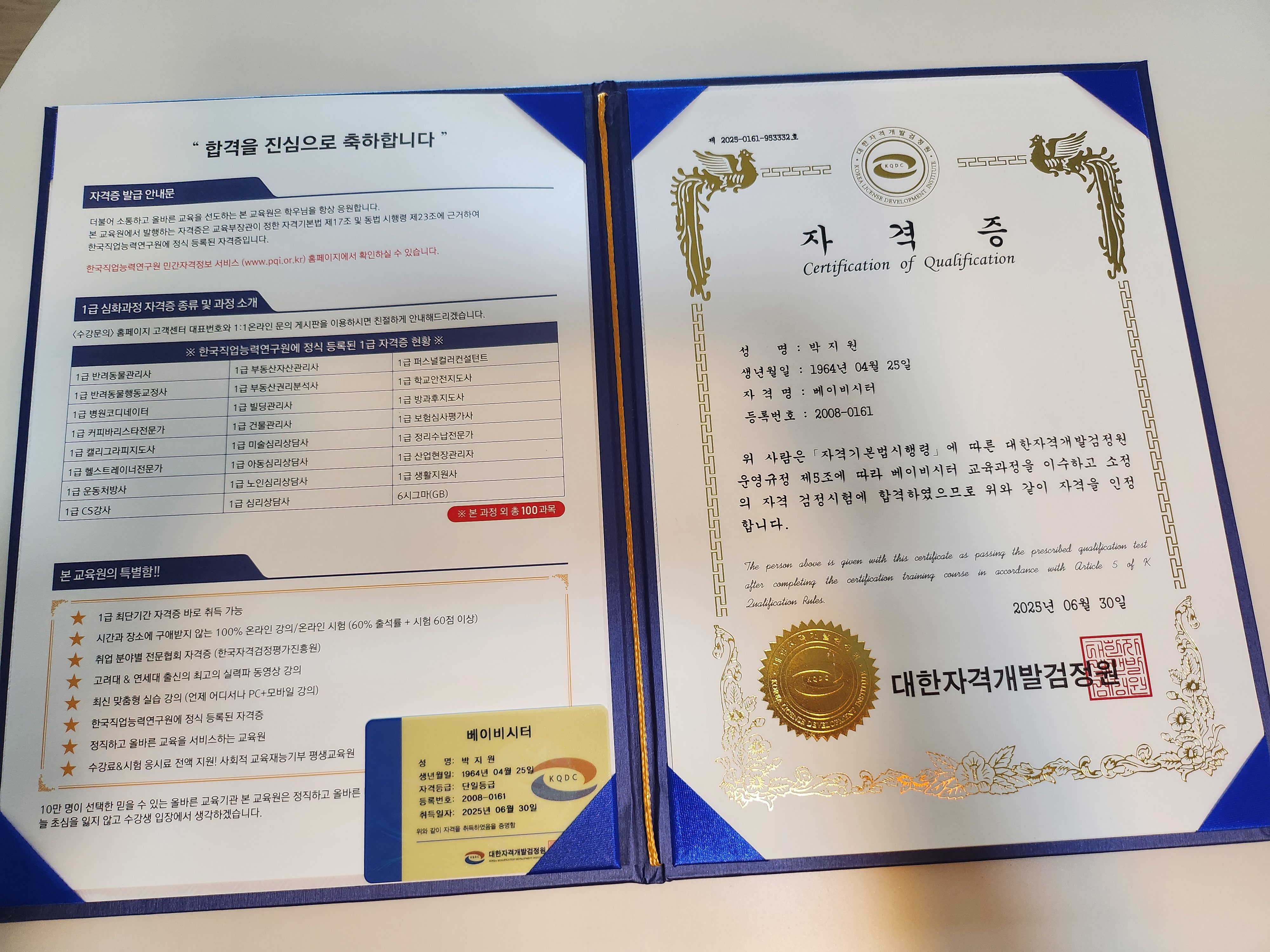 온라인수업으로 공부하고 시험보고 합격증까지 받아서 아주 뿌듯합니다 우리 딸이 아기를 가져서 일반 상식이라도 알기위해 강의를 들었는데 도움이 많이될거같습니다 또한 직업적으로도 자격증이라는게 있으니 든든하네요^^