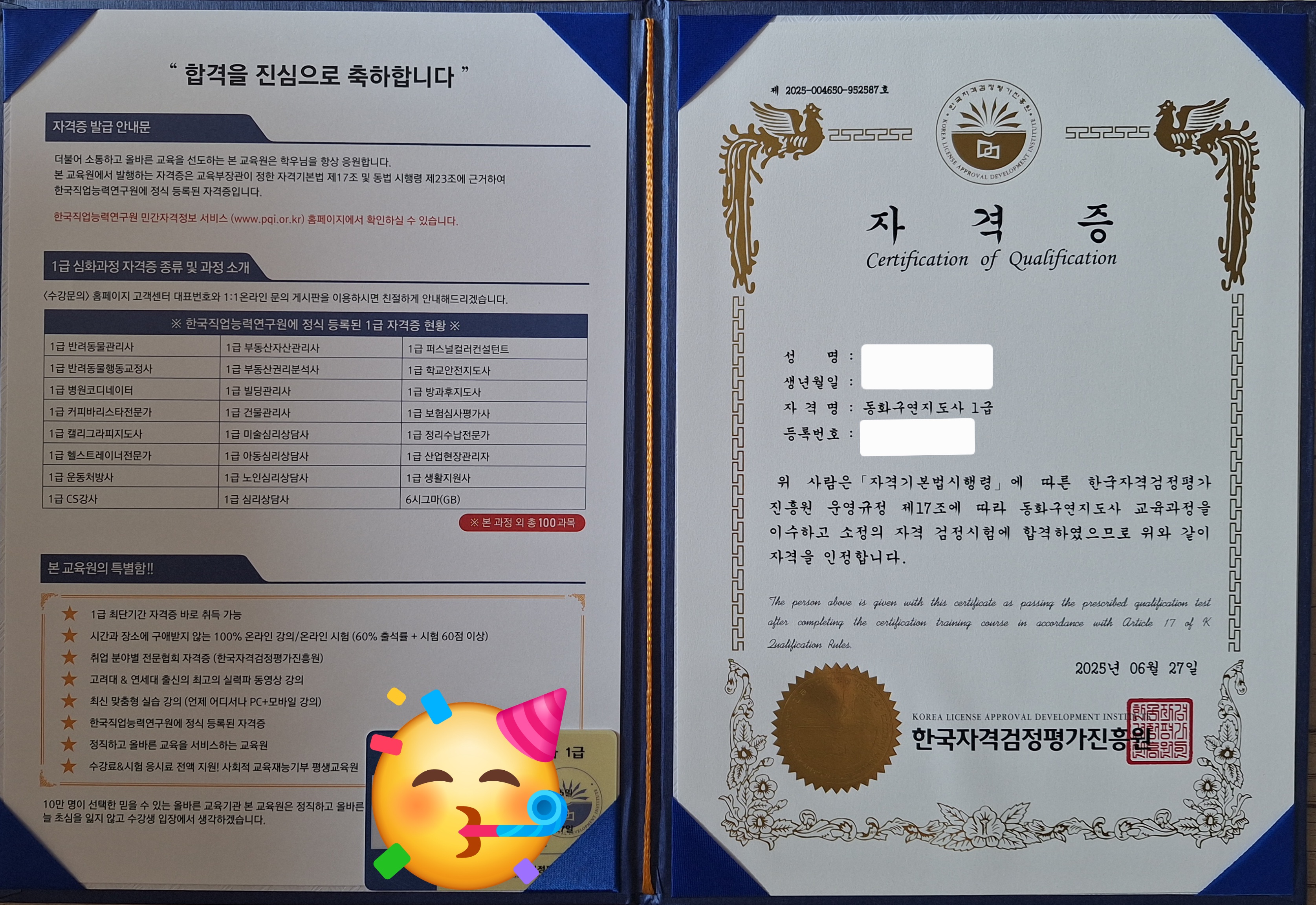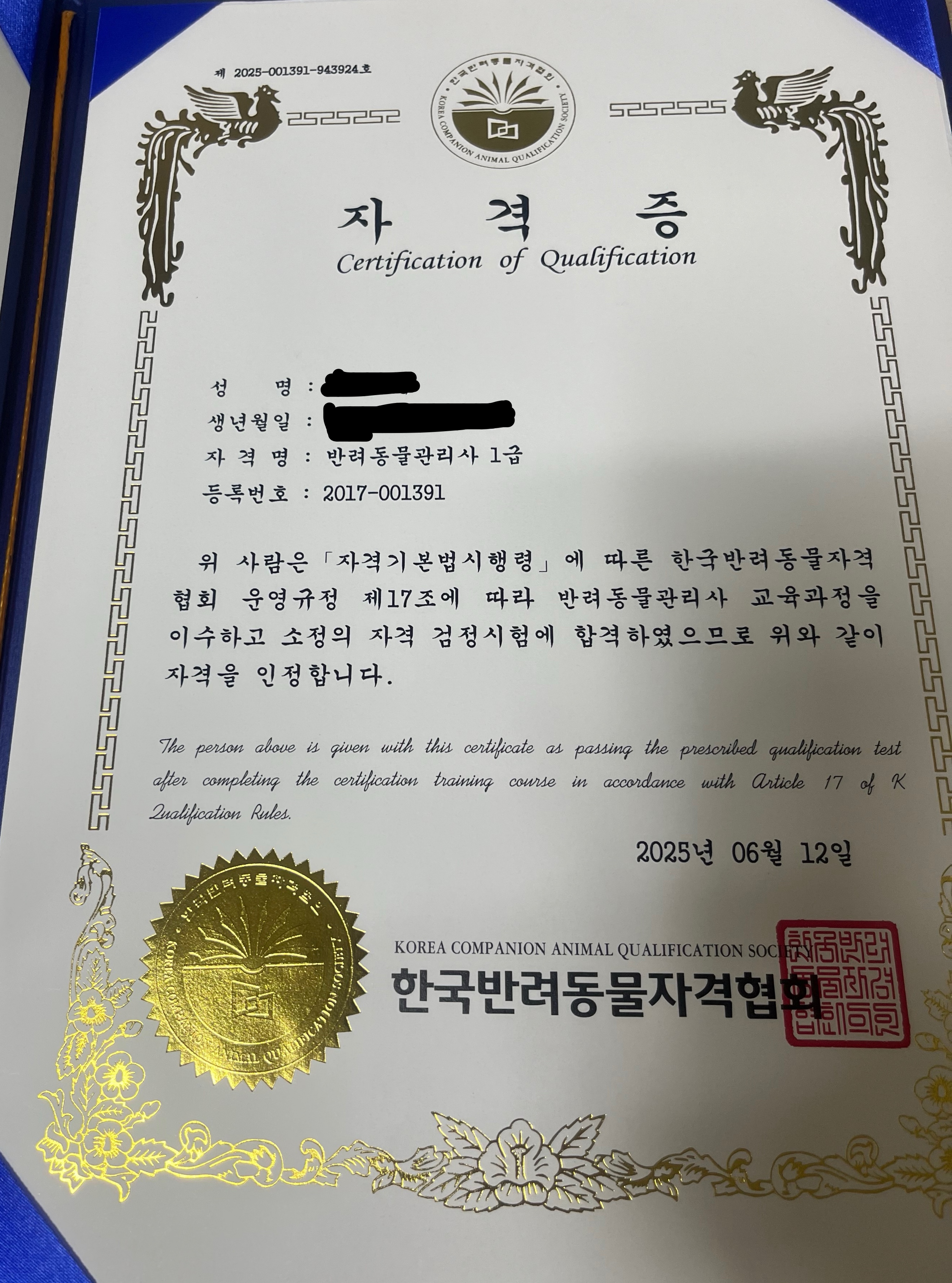 강아지를 좋아하고, 좀 더 전문적으로 배우고 싶어서 자격증에 도전하게 되었습니다. 강의 하나하나가 알차고 실제 현장에서도 바로 활용할 수 있을 만큼 실용적이라 정말 만족스러웠습니다. 덕분에 재미있게 배우며 합격까지 할 수 있었고, 앞으로 반려동물과 관련된 진로에도 큰 도움이 될 것 같습니다! 감사합니다 :)