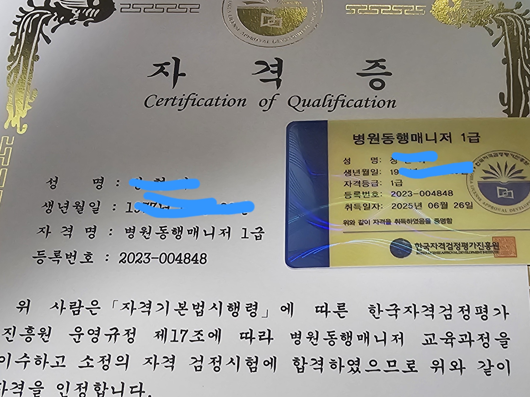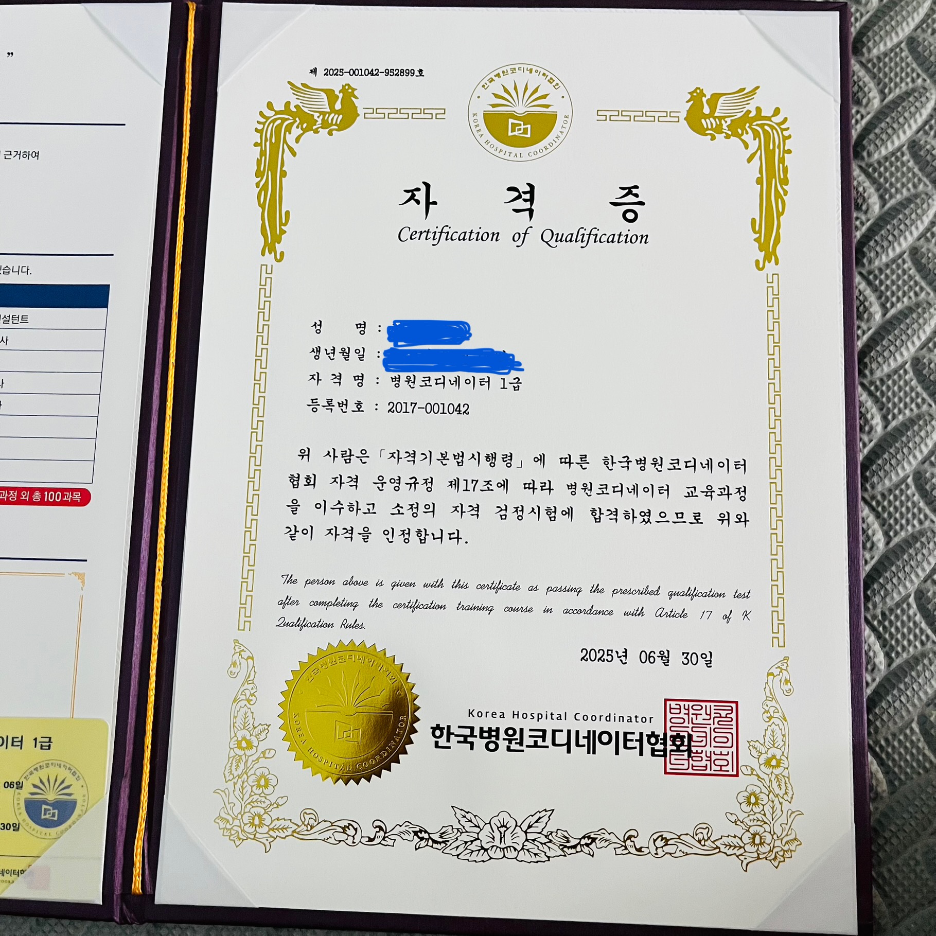 예전 부터 따고 싶었던 자격증 드디어 취득 했어요!!기존 간호조무사 >간호조무사 +병원코디네이터 한층더 업그레이드!! 강의퀄리티도 아주 굿 누구든 열심히 하면 자격 취득 할수있는 시스템!!