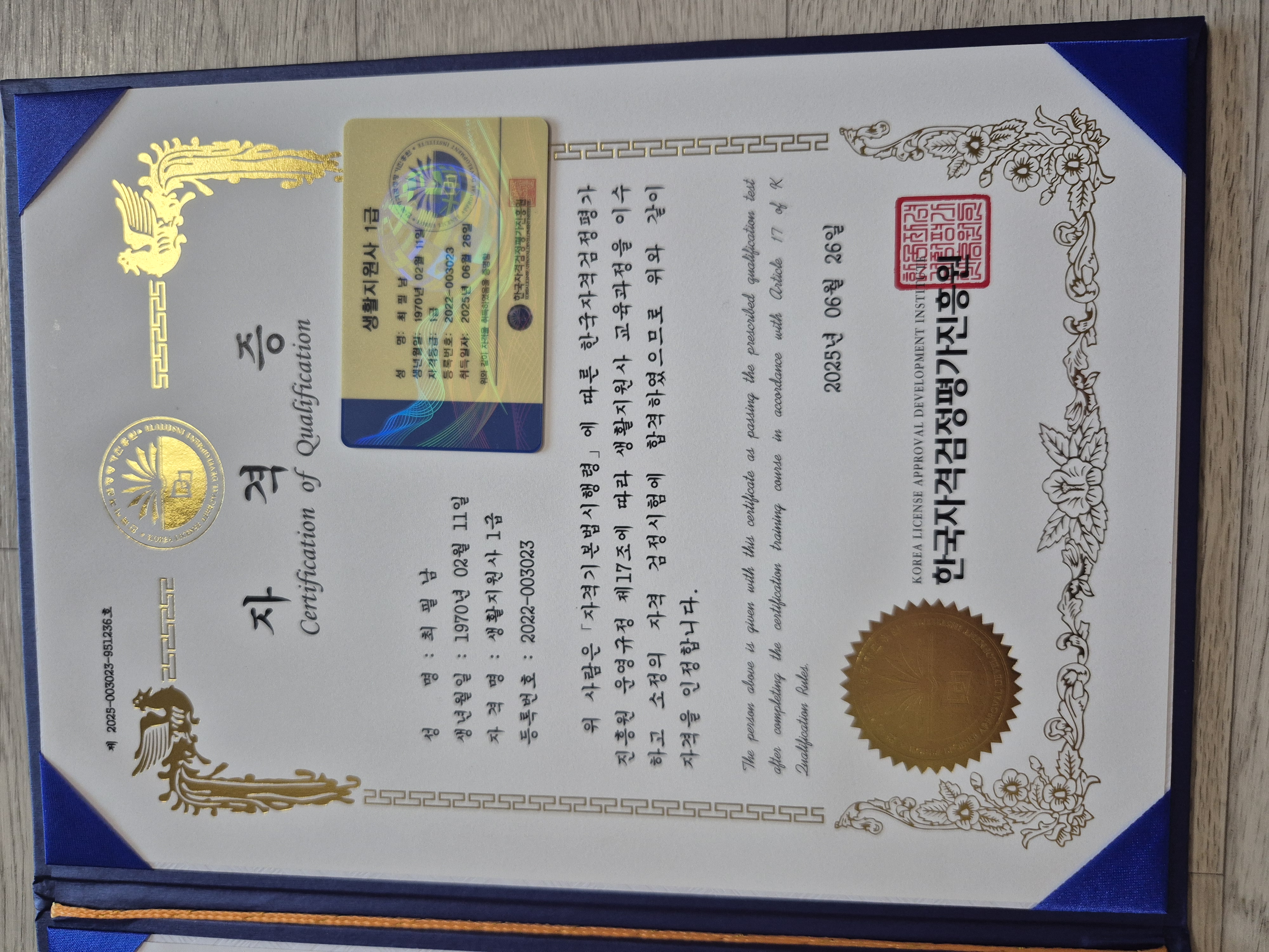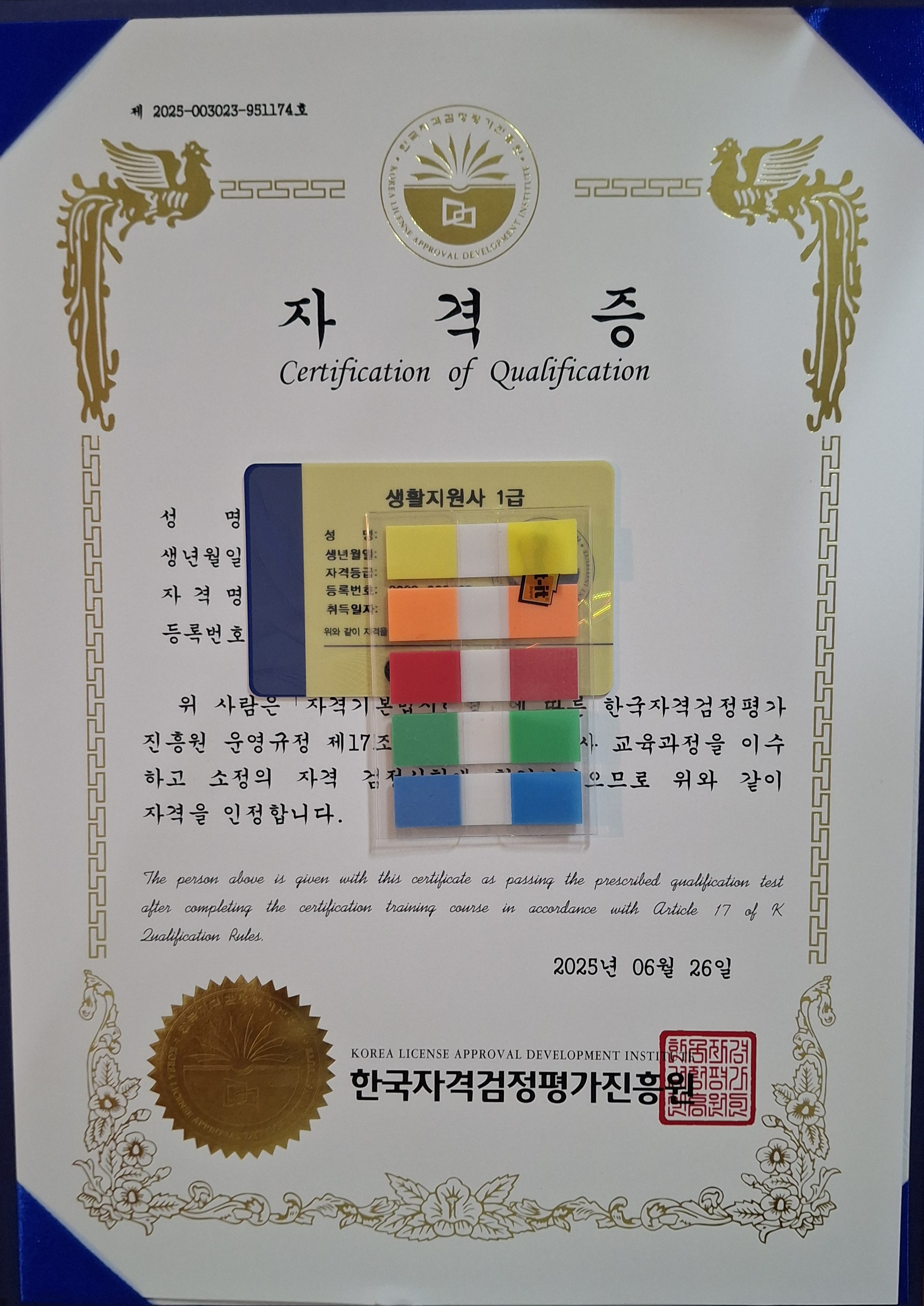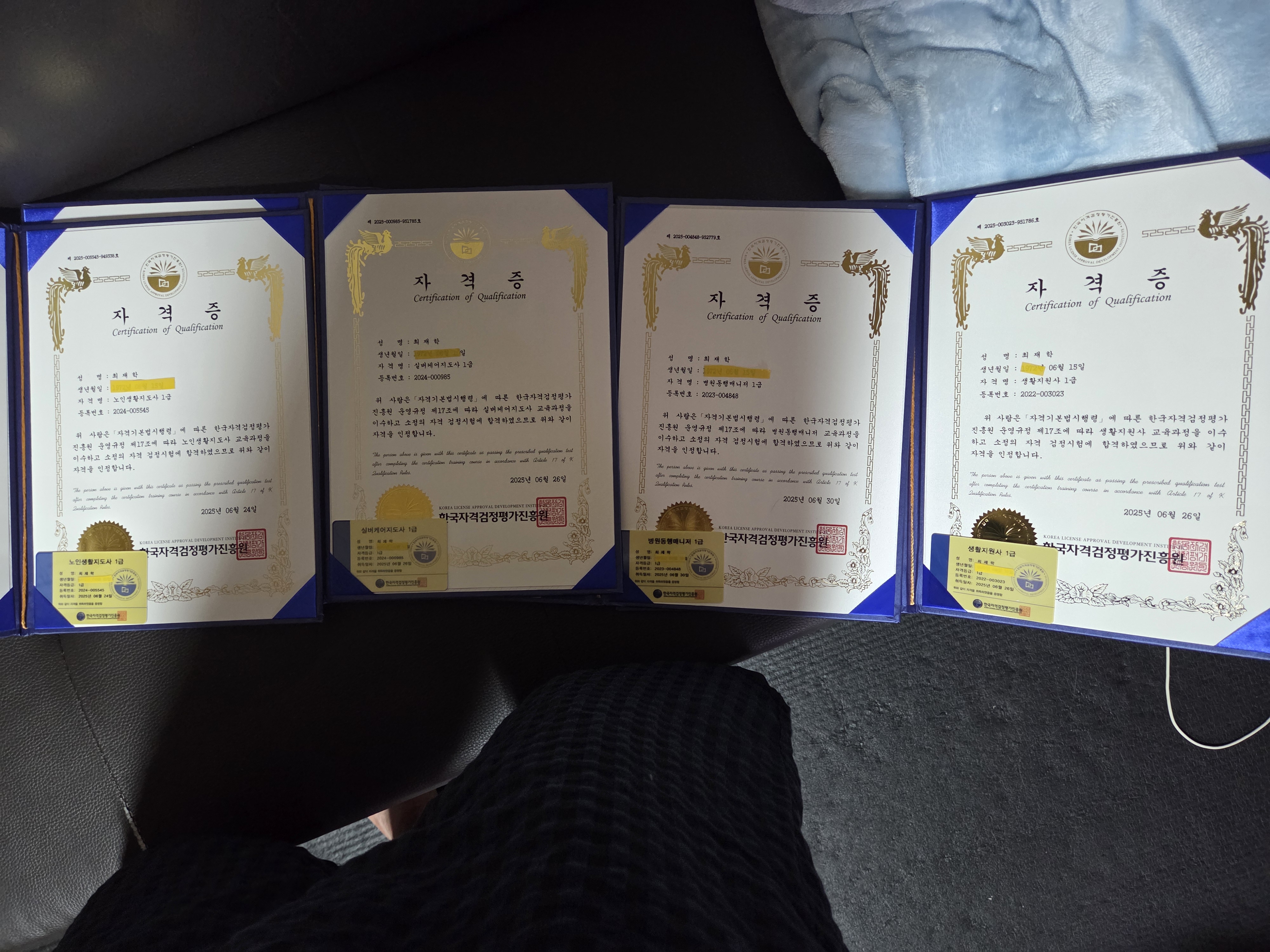 노인생활지도사,생활지원사,실버커어지도사,병원동행매니져 4개의자격증을 취득했습니다. 처음엔 광고를 보고 은퇴후의 할일이 이거구나라는 생각에 노인생활지도사를 취득했습니다. 그리고 생각해보니 자격증취득하기도쉽고 하니 실버 쪽의 자격증을 다 따보자하고 4개의 자격증을 취득하게 됬습니다. 은퇴후의 나의 할일을 준비해두윘다는게 너무나 즐겁고 안심이됩니다. 쉽게 이해할수있게 준비해주신 동영상 너무좋았습니다.