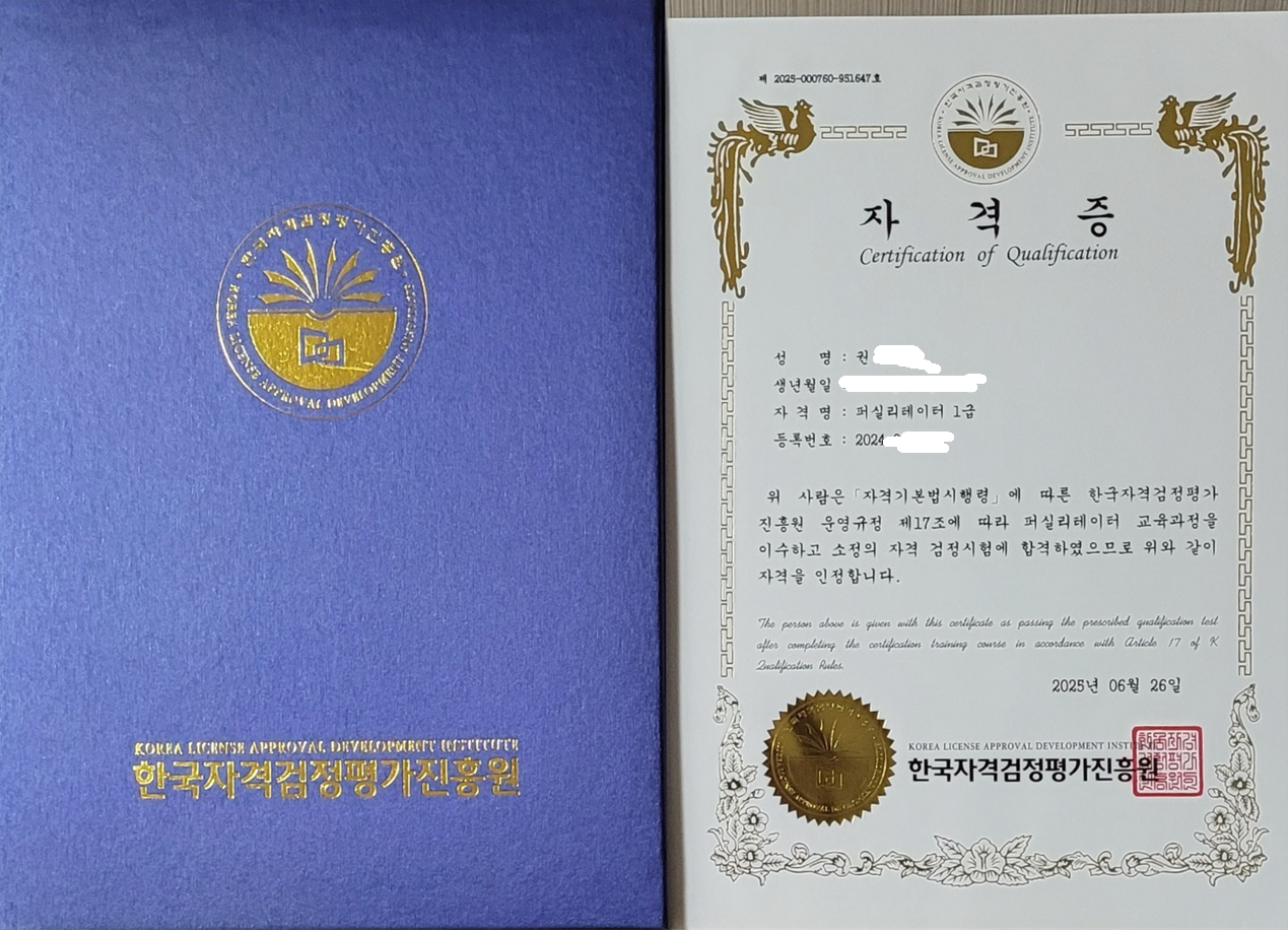 오늘 자격증 받고 진심 뿌듯함을 느꼈습니다. 지금도 무엇인가 도전할수 있다는것에 용기가 생겨서 무엇이든 도전해서 또 자격취득할수 있다는 자신감이 많이많이 생겼습니다.감사합니다