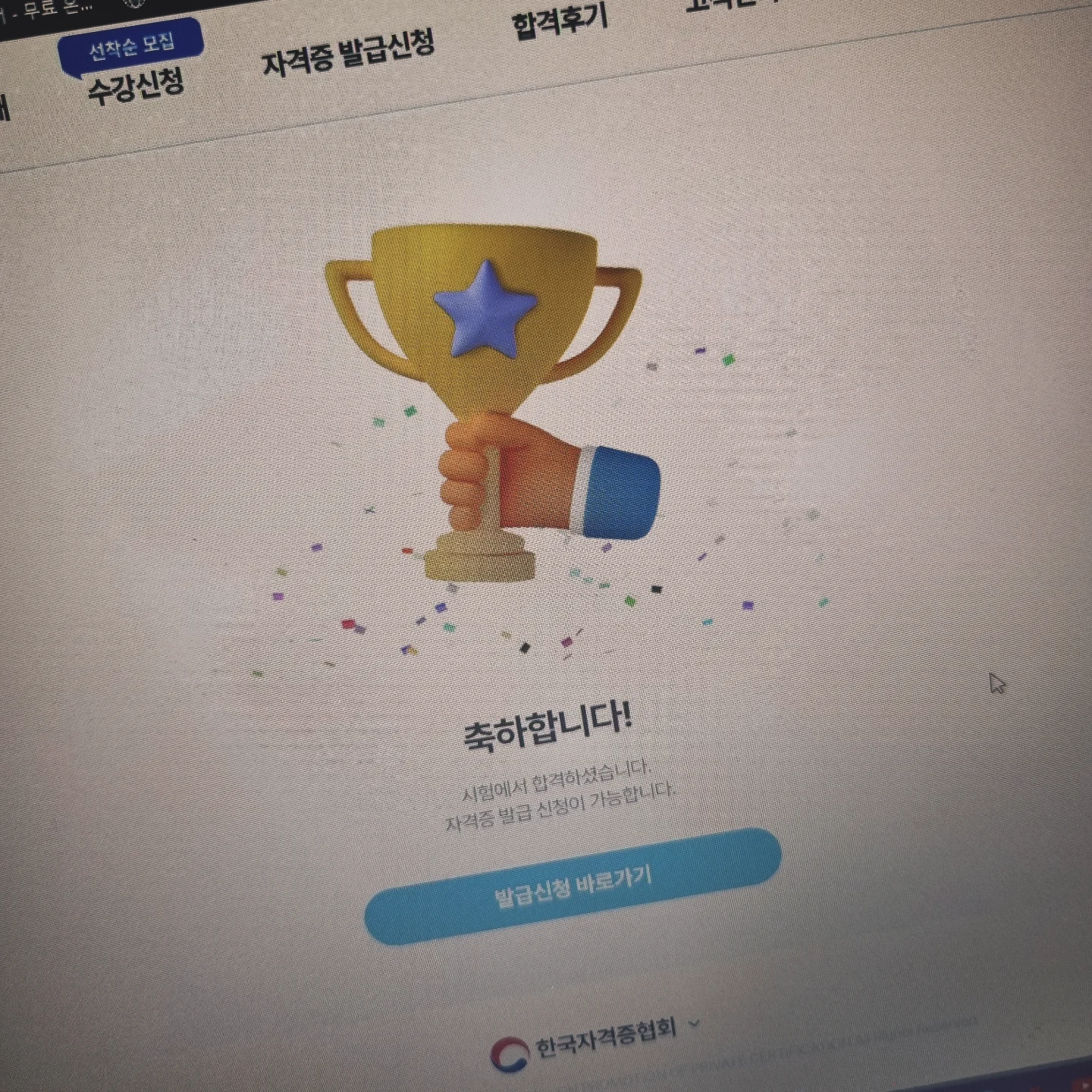 두달전 회사사정으로 퇴사한후 운동만하고 아무것도 안하니 이대로는 안되겠다싶어서 나이더들기전에 자격증을 따놔야겠다 싶어서 시작했는데 두강의듣고 합격했고 다른 공부도 시작하려고요 오늘합격증 받고 공부를 더해야겠다생각하고 컴퓨터 학원도 지원하게 되었네요