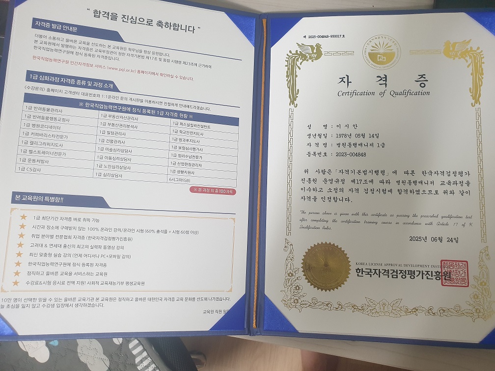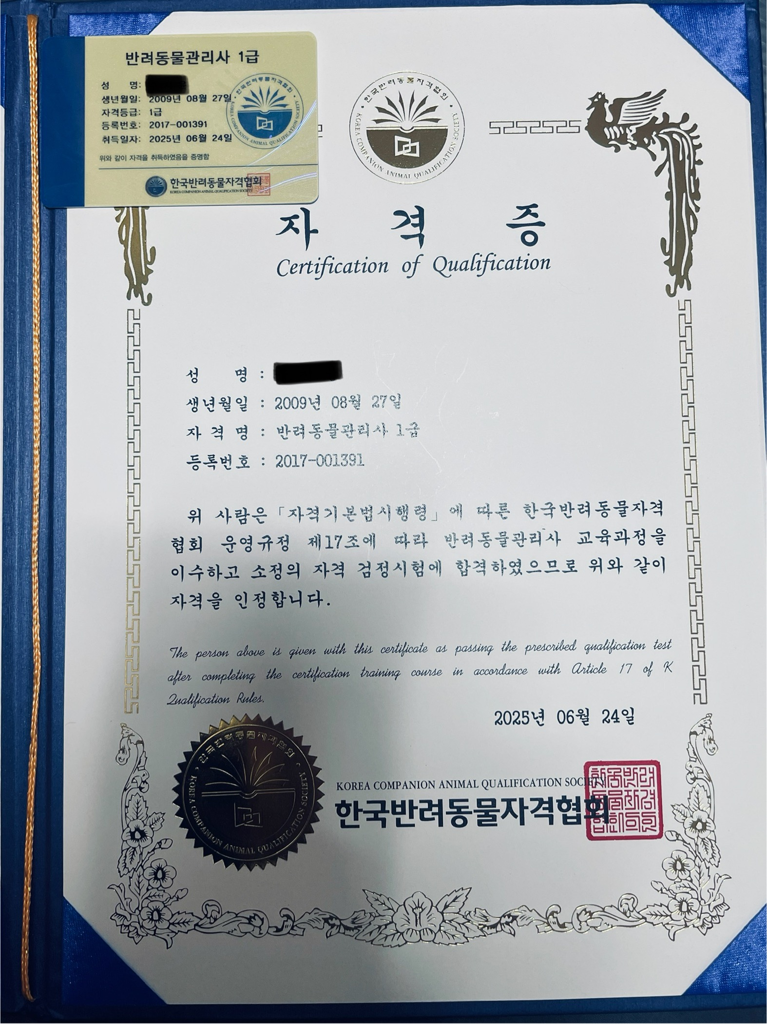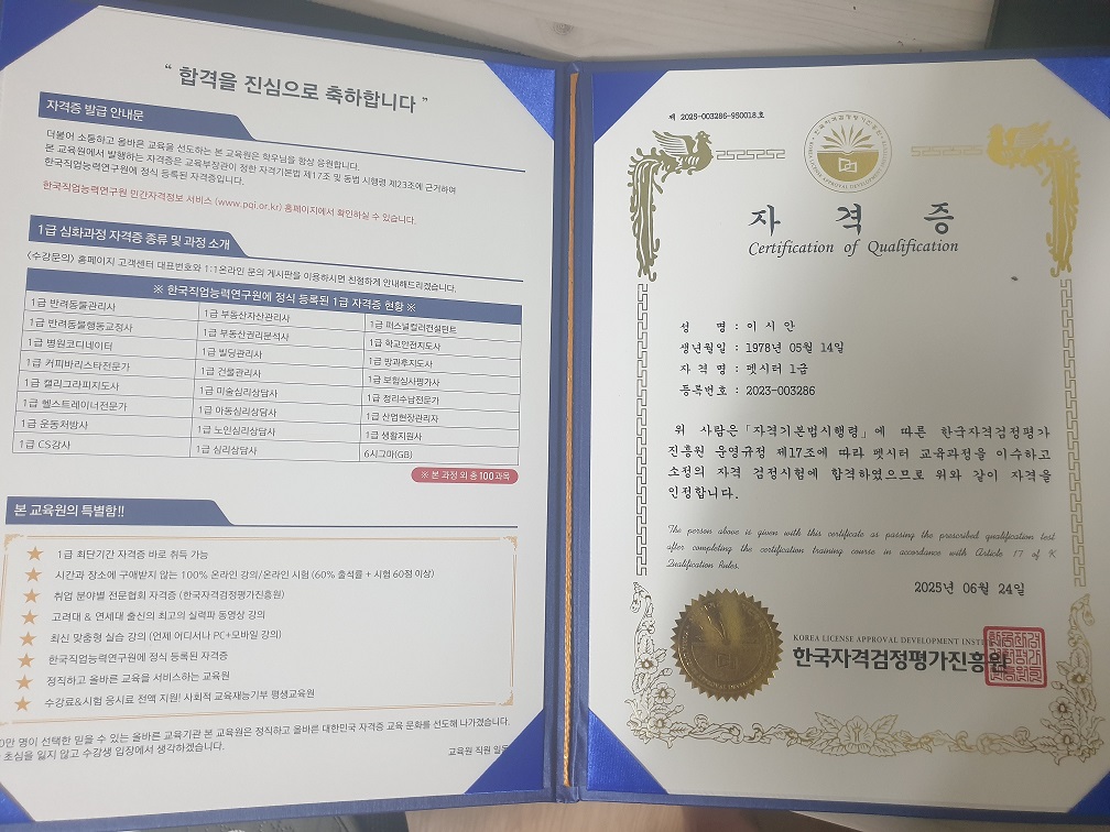 펫시터와 반려동물관리사 자격을 모두 취득 했습니다 강의내용만 잘 들으면 시험은 비교적 쉽고 간단하더라구요 선생님들이 잘 지도해 주신 덕분에 쉽게 취득 하게 되었습니다