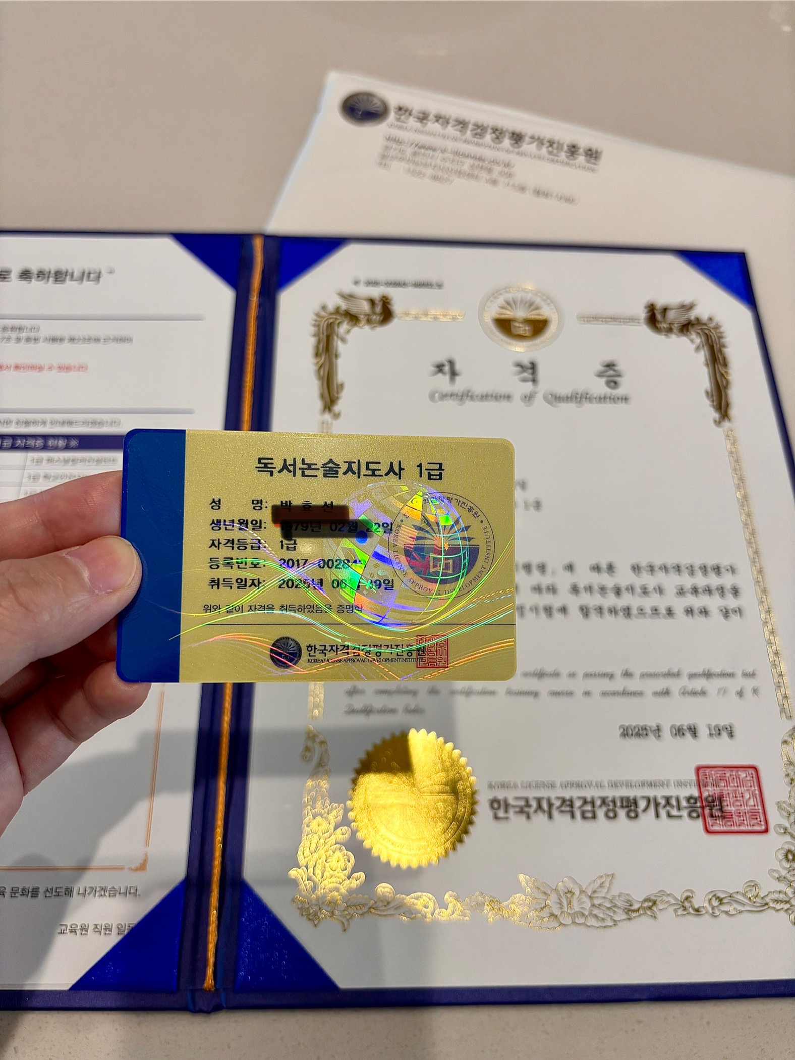 아이들 독서논술 가르치기위해 자격증을 취득하게 되었는데요, 교과과정도 유익했고 선생님의 강의도 훌륭했습니다. 그래서 60프로만 들어도 응시할수 있었지만 저는 90프로 이상 정독했네요~ 자격증이 잘쓰여지길 바랍니다!
