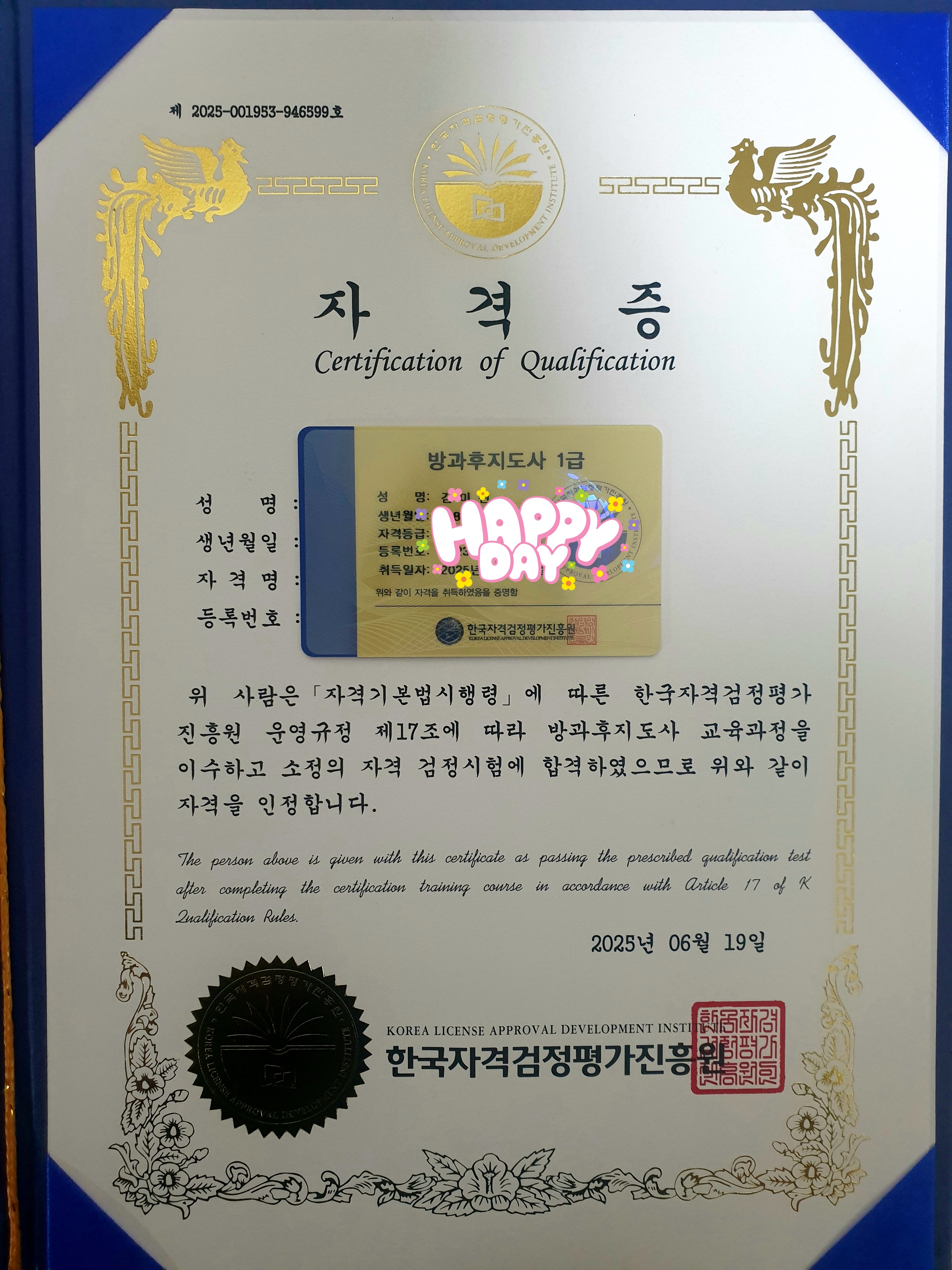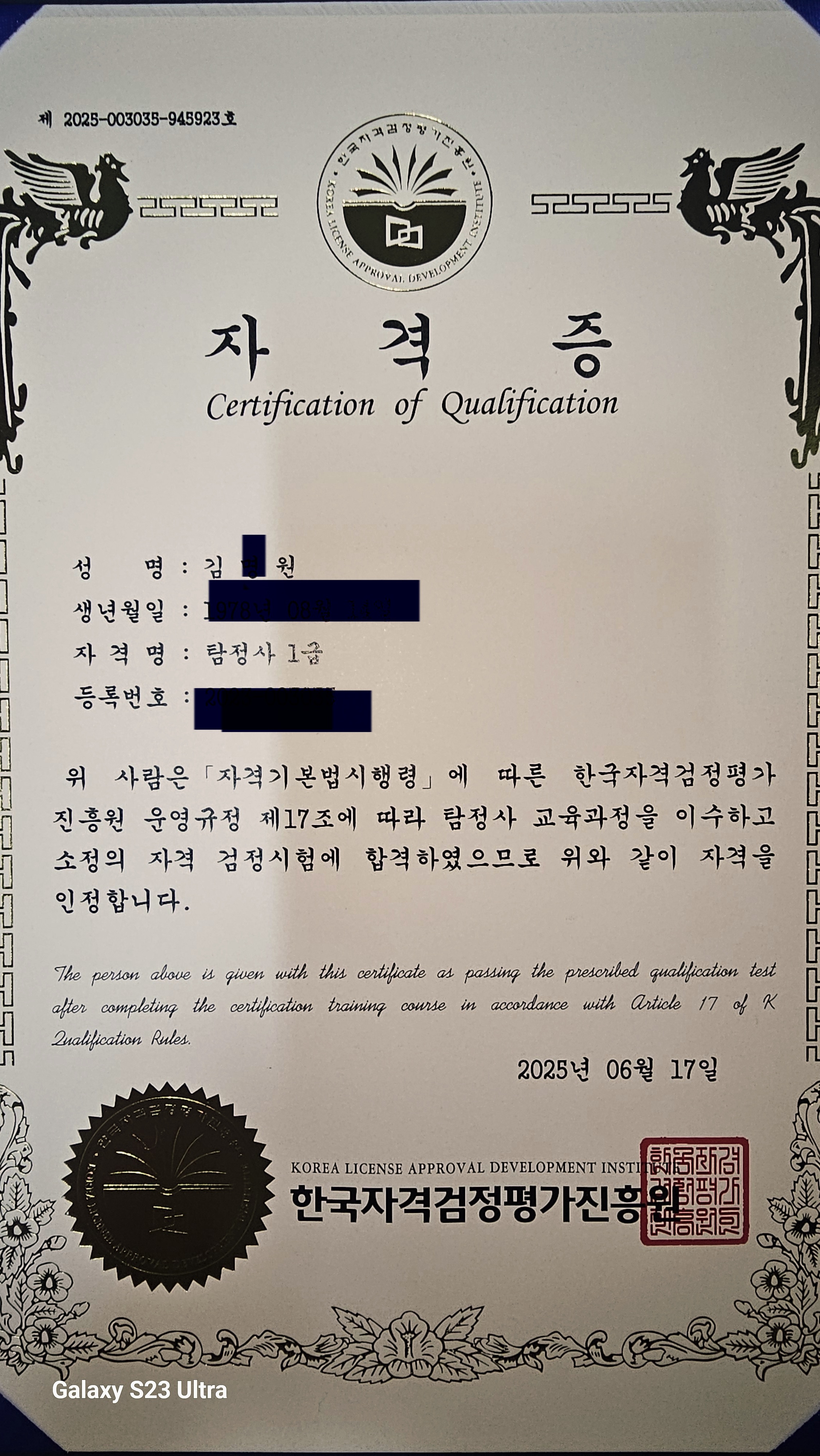 요즘 자영업 하시는 분들 업종을 불문하고 전부 힘드실 겁니다~저도 그 중에 한사람으로 언제가 부터 술에 많이 의존하게 되더라구요 나이는 반백이 다 되었고 즐거움이나 희망은 언젠가부터 저와는 어울리지 않는 단어였습니다~그러던 어느날 지인과 소주한잔 하면서 대화 중 OO대 탐정과가 생겨서 다닌다는겁니다~어릴 때 동경하며 한참을 꿈 꿔온 탐정~^^ 바로 탐정에 대해 서치해서 한국자격증 협회를 알게 되고 합격하고 이렇게 후기를 남기네요~ 한달이라는 자격증 취득시간이 제게는 긴 사막같은 생활에 단비같은 시간이었습니다~ 앞으로 경기가 좋아 지는 날까징 한자협과 함께 하며 저만의 힐링과 자기계발을 하겠습니다~ 모든 자영업 하시는분들 화이팅!