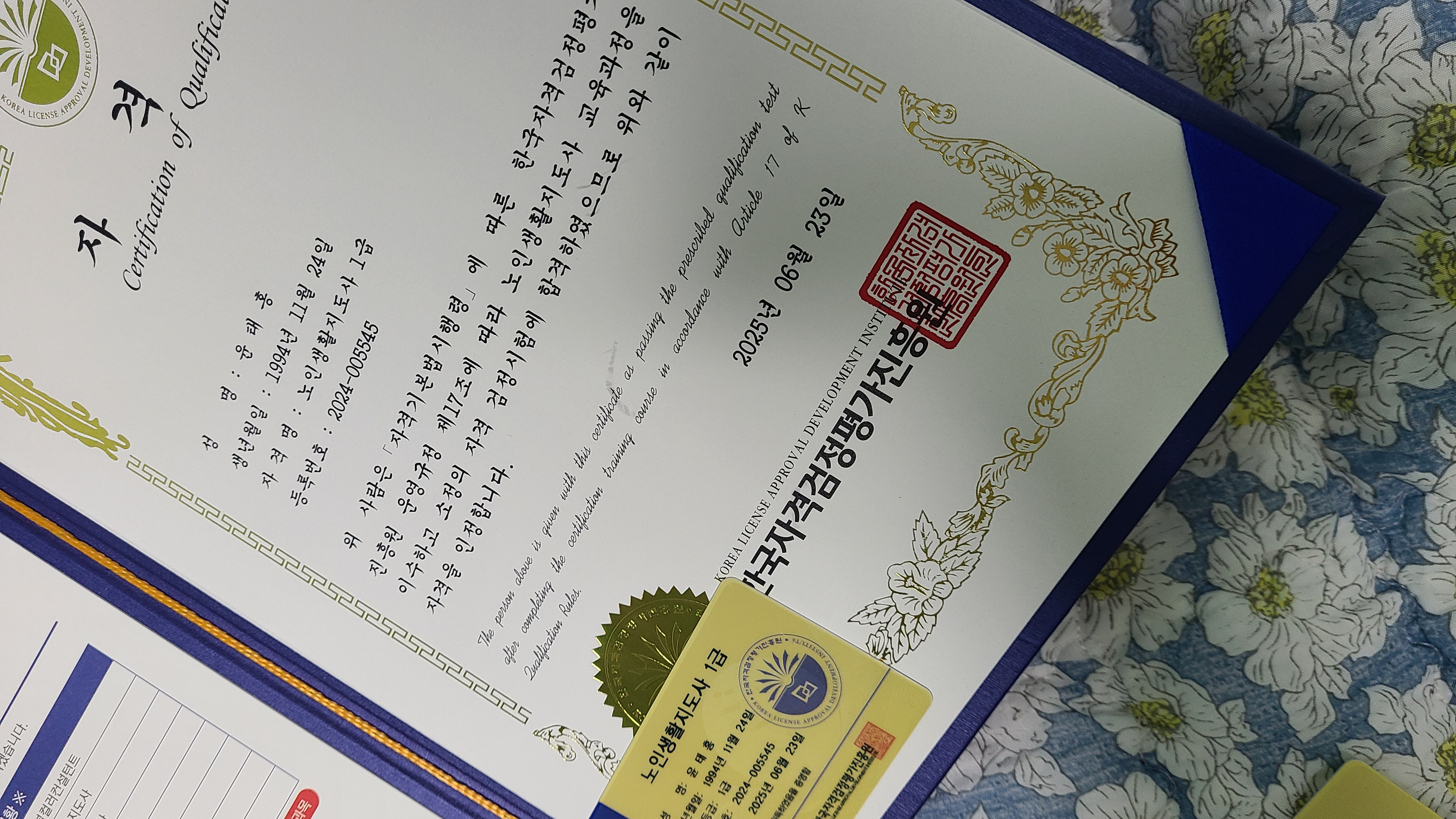 어르신들 돌봄이 적성에 맞는것 같아서 관련된 직종을 우연히 알게되어 자격증을 취득했습니다. 강의가 도움이 많이 됐습니다.