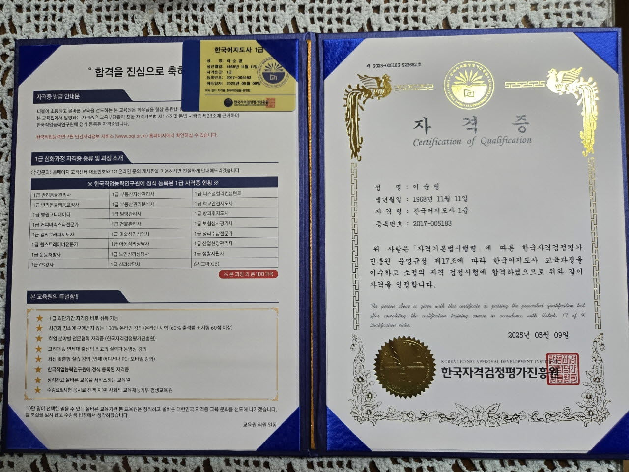 기존하던일은 손놓은지 너무 오래되서 일을하려니 막막했는데 뭔가 새로운 도전도 나쁘지않겠다싶어 공부를 시작했어요. 자격증따기 어렵지않았고 자격증을 보니 아주 뿌듯합니다.