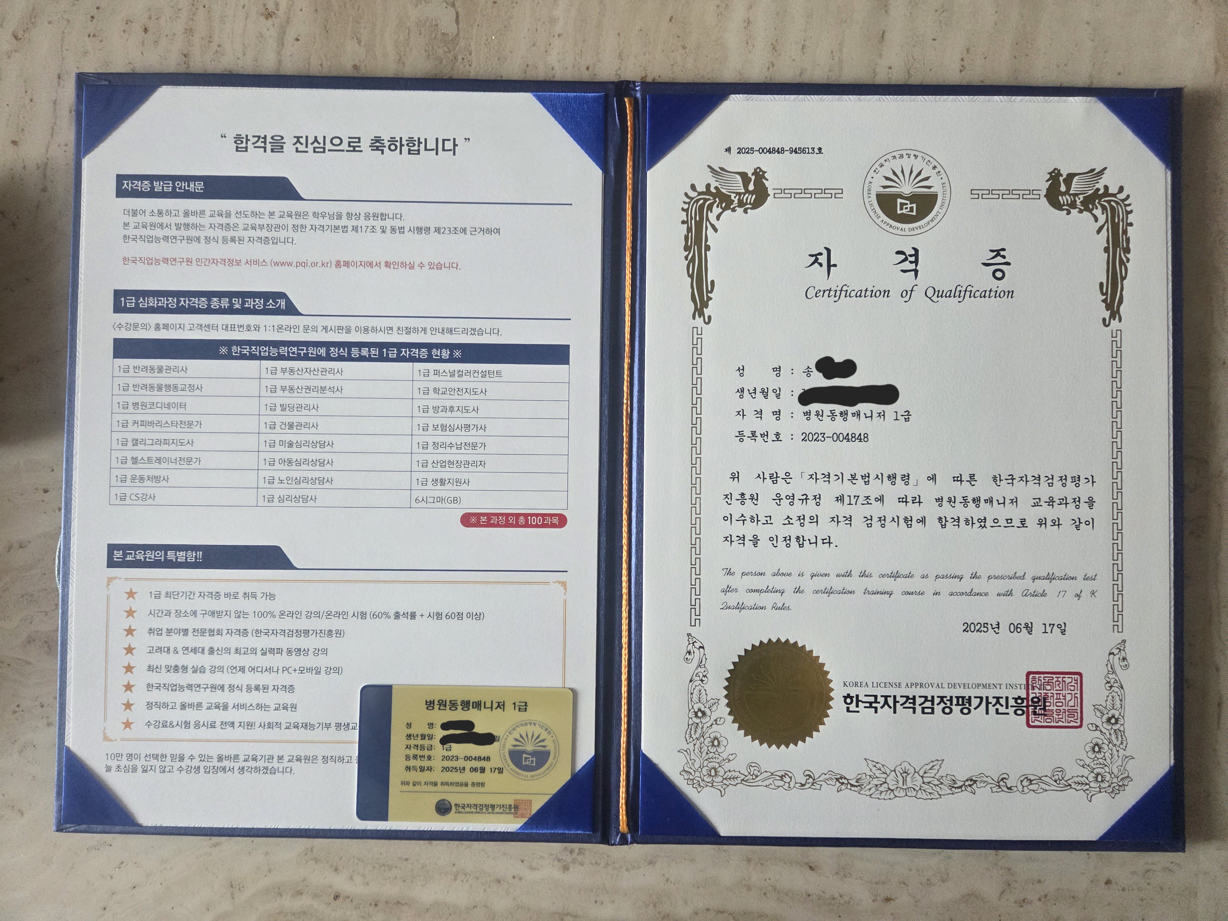 원래 [장애인활동지원사지도사]를 따려고하다가 SNS에 [병원동행매니저 1급] 자격증 광고가 많이 나오기에 신청했습니다. ^^* 교수님의 쉬운 설명 덕분에 수월하게 딸 수 있었어요~~ 앞으로 좋은 동행매니저가 되도록 하겠습니다. 감사합니다.