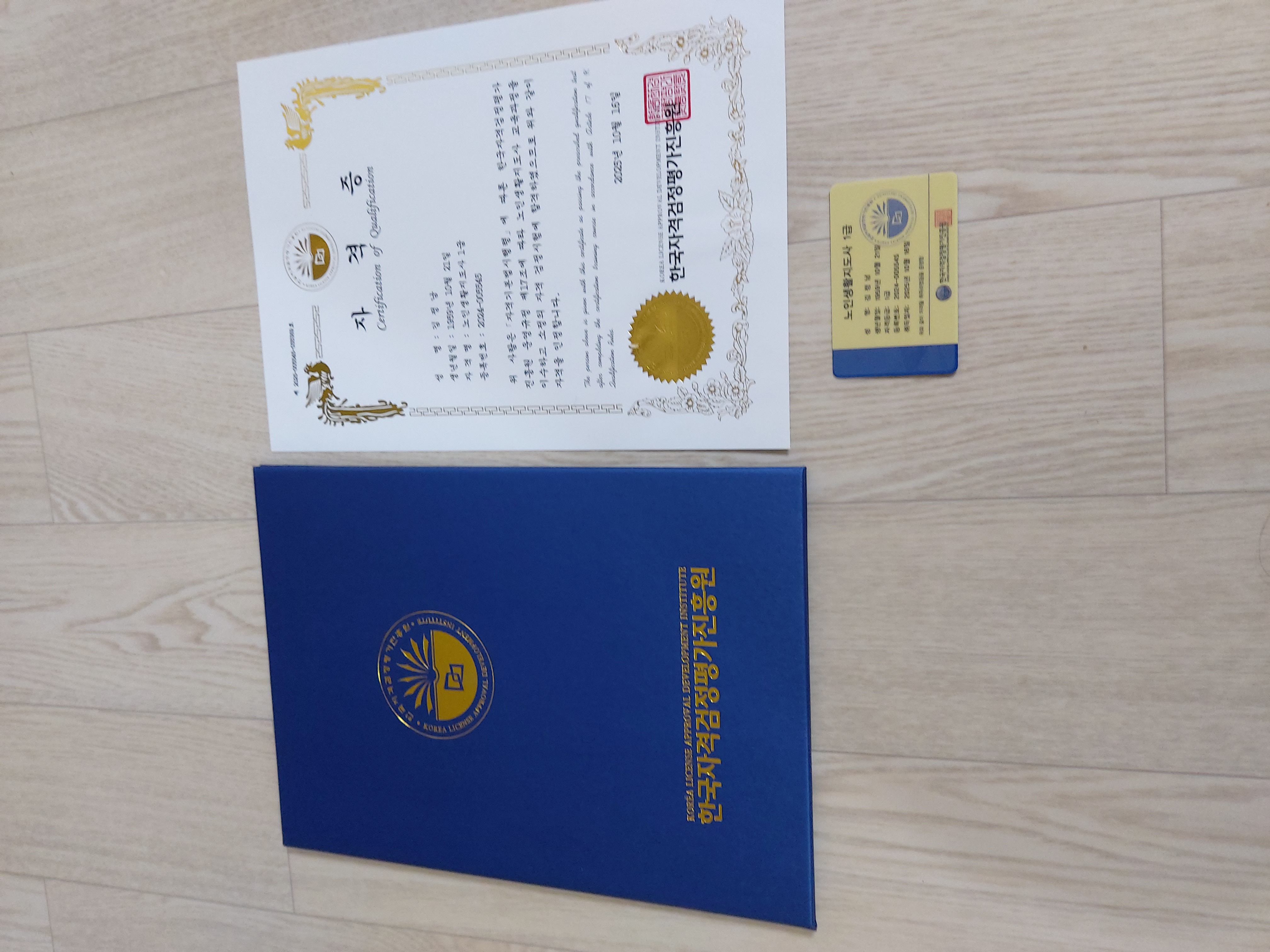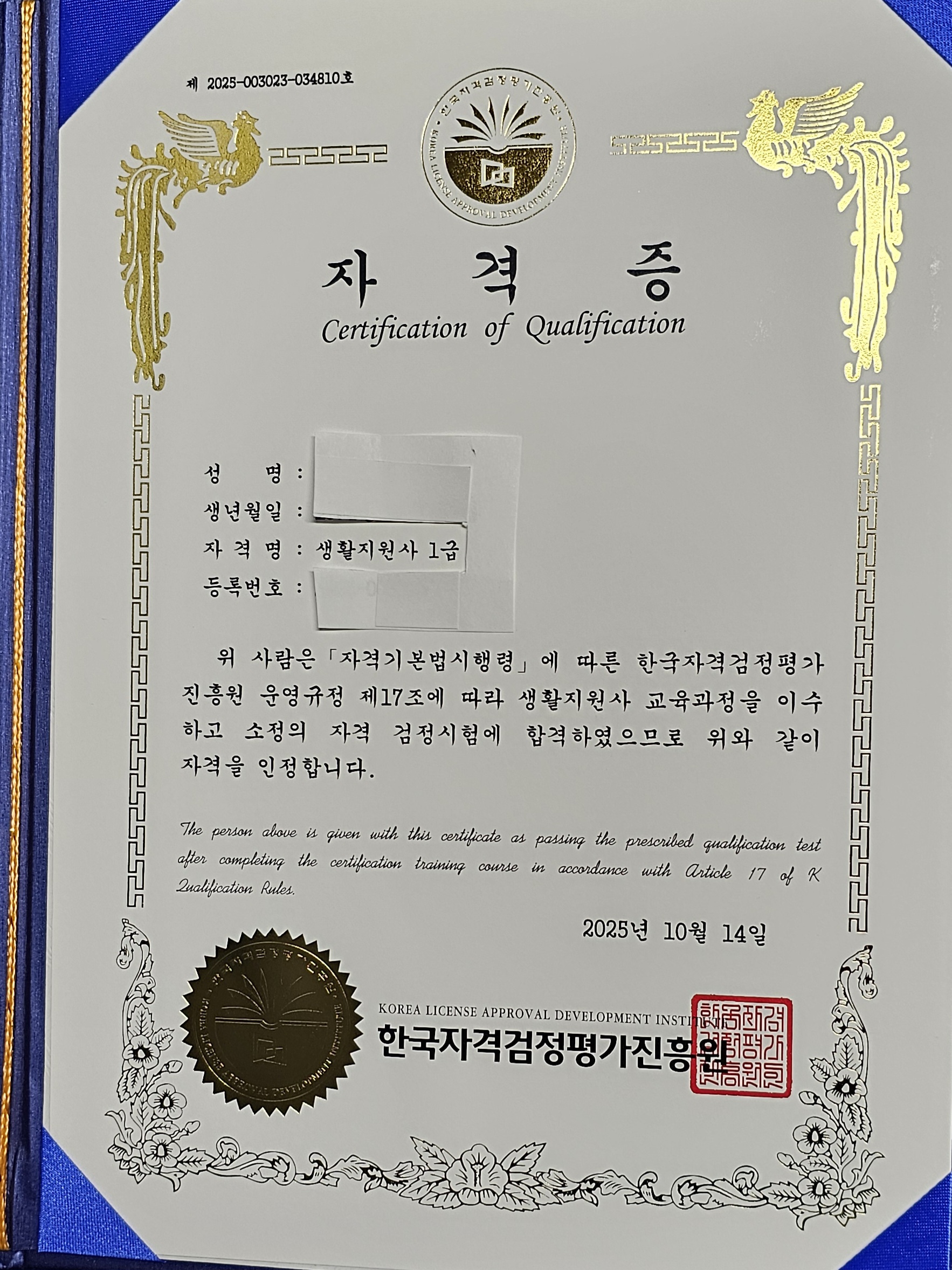 우연히 한국자격증협회에서 무료수강으로 자격증을 취득할 수 있다는 공지를 보게 되어 공부도 하고 노인돌봄생활지원사 1급 자격증도 발급완료했어요.
