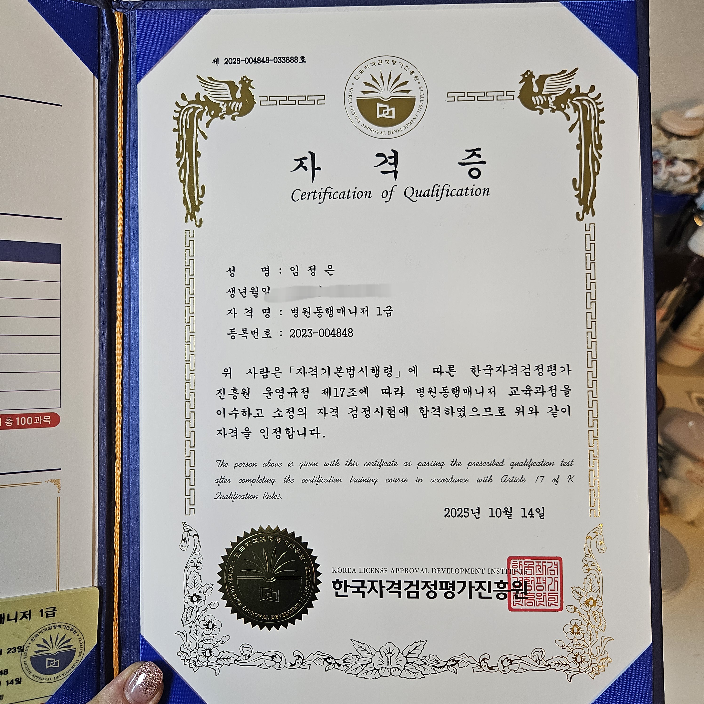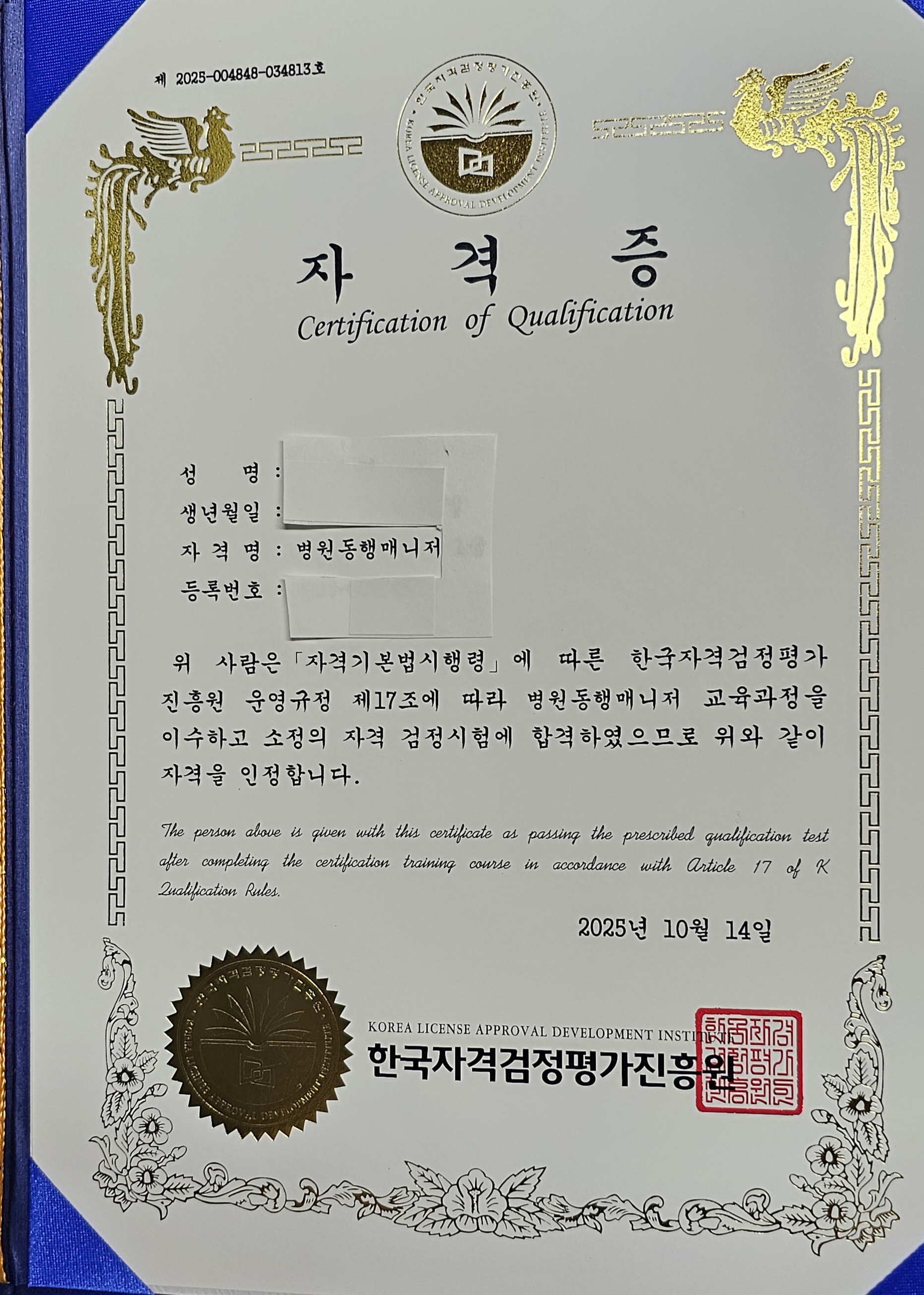 퇴직 후의 삶에 대해 고민하다가 한국자격증협회 홍보를 보고 알게 되어 미래에 꼭 필요할 것 같은 병원동행매니저 1급 강의를 열심히 듣고 자격증 취득까지 완료했어요. 하고자 하는 마음만 있으면 될 것 같아요.