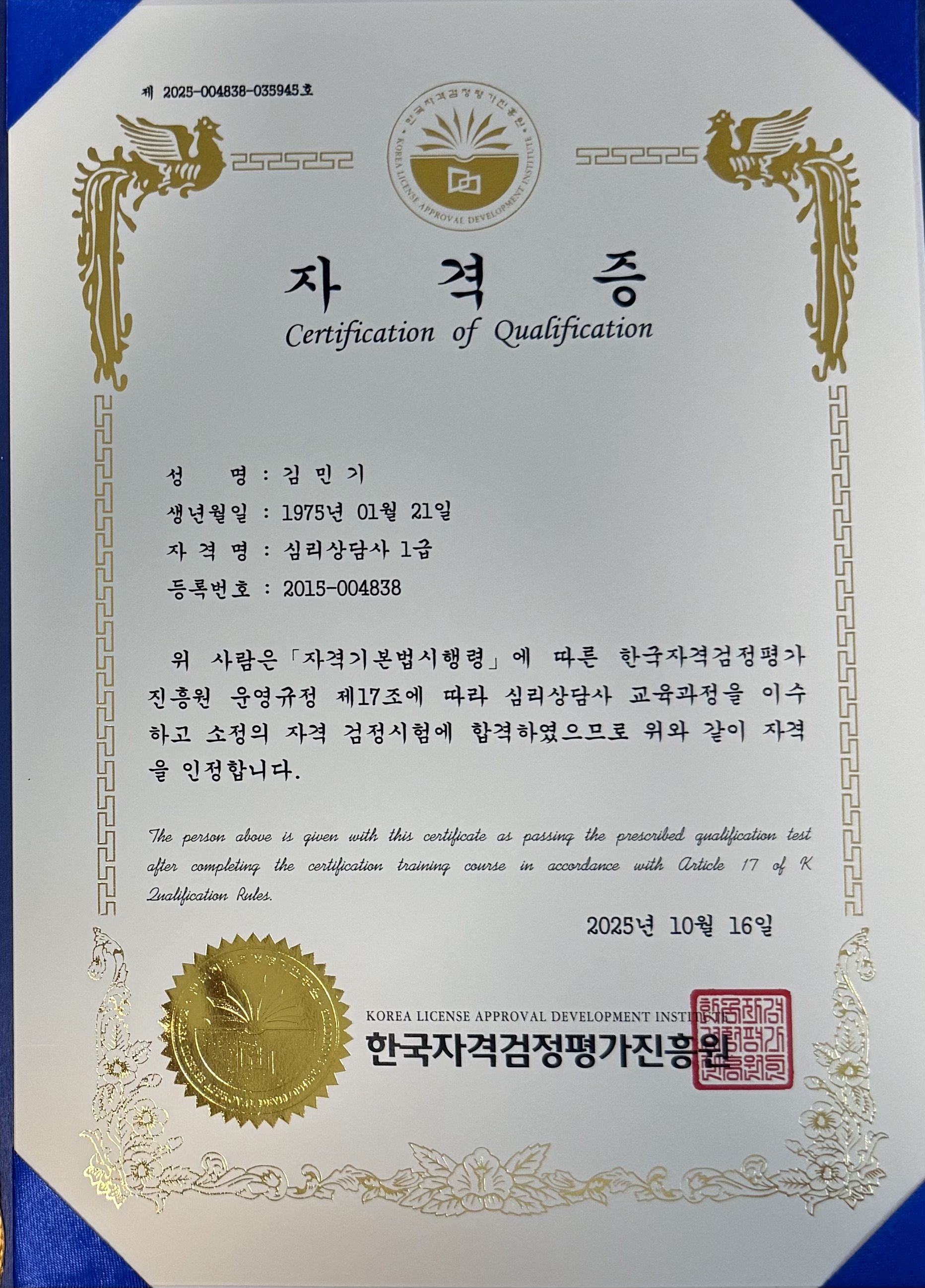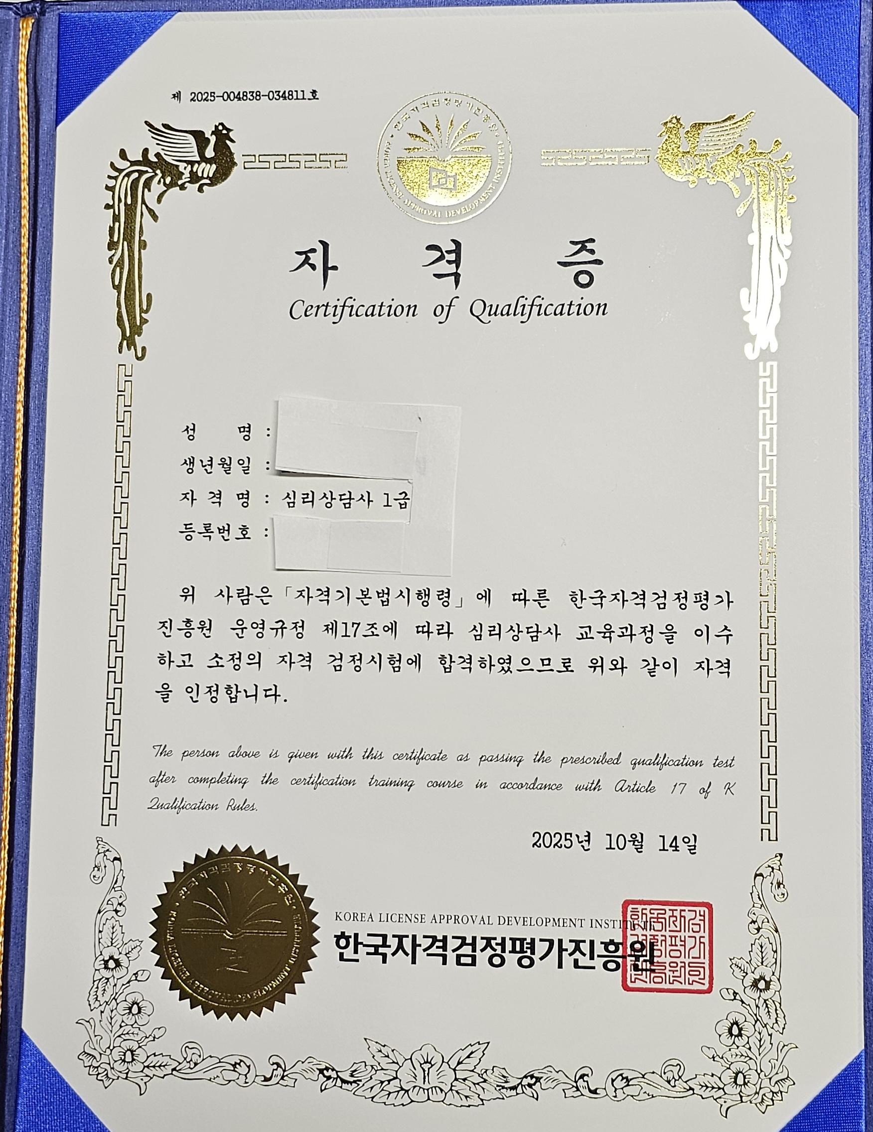 나이가 들면서 상담할 일들이 생기다 보니 좀 더 깊이 있게 공부하고 싶어서 시작하게 되었고, 드디어 자격증을 취득하였어요.