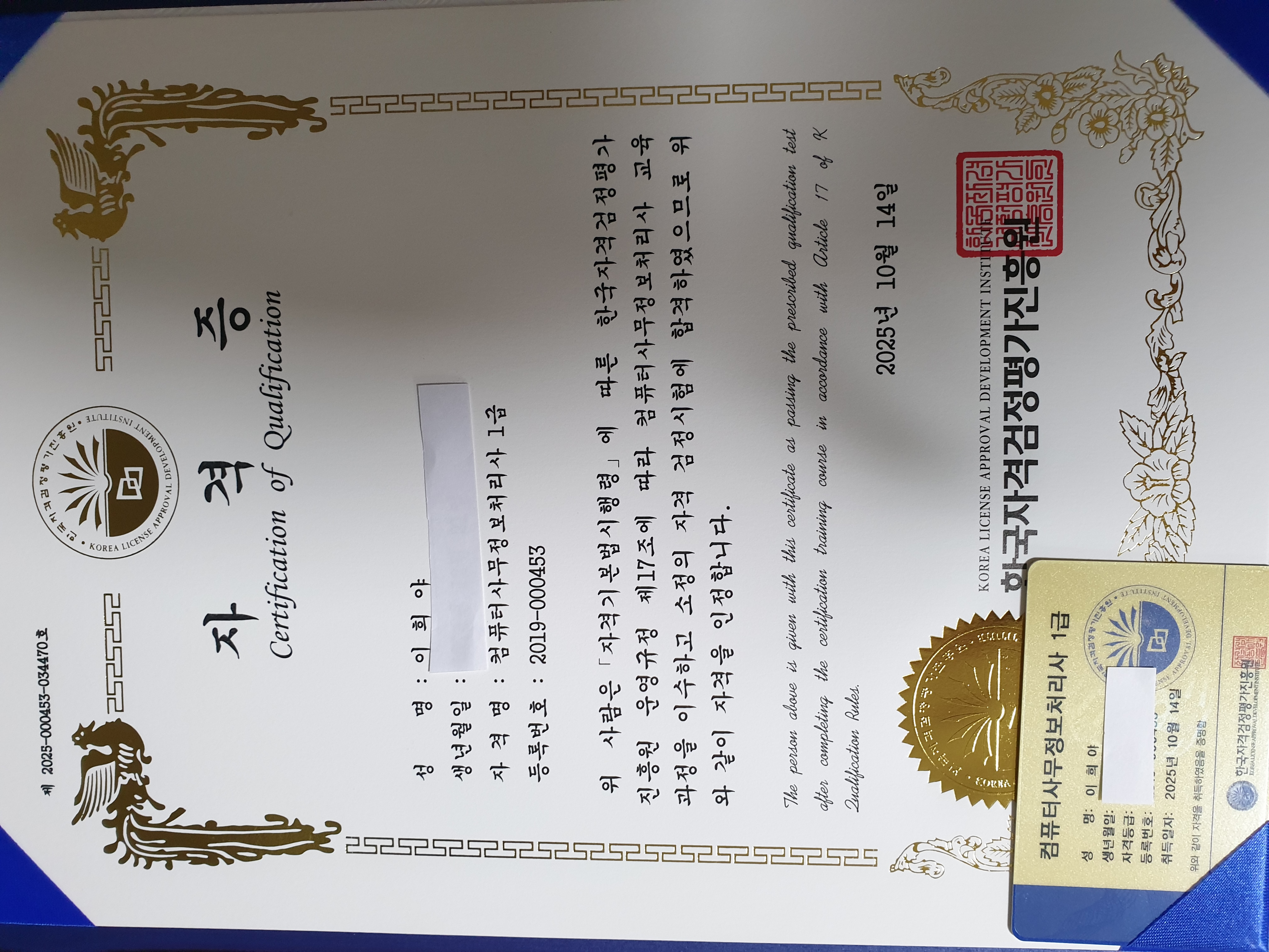 자격증 하나씩 취득 할 때 마다 희열이 느껴지고 자존감도 높아지고 자신감이 생기네요.
